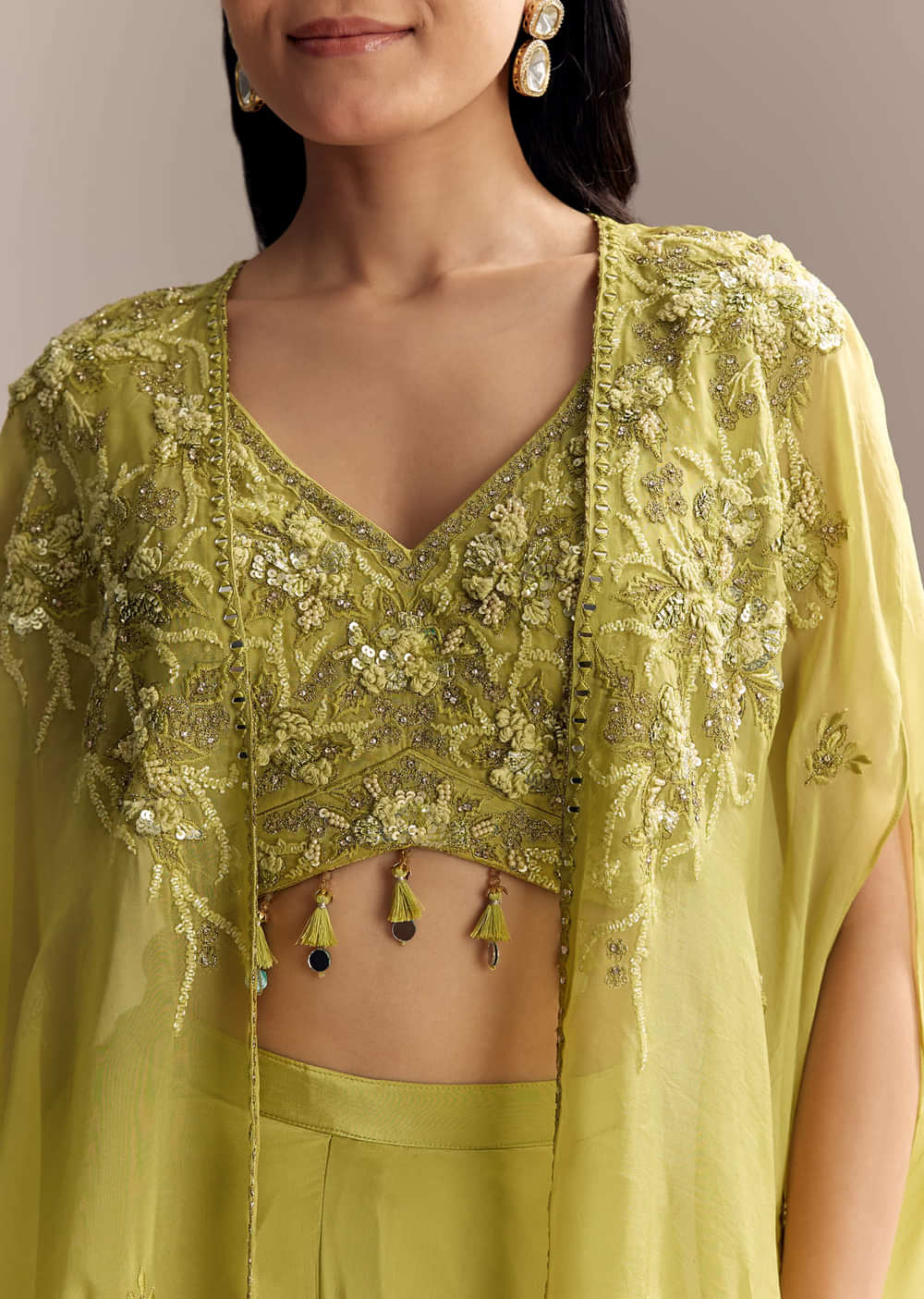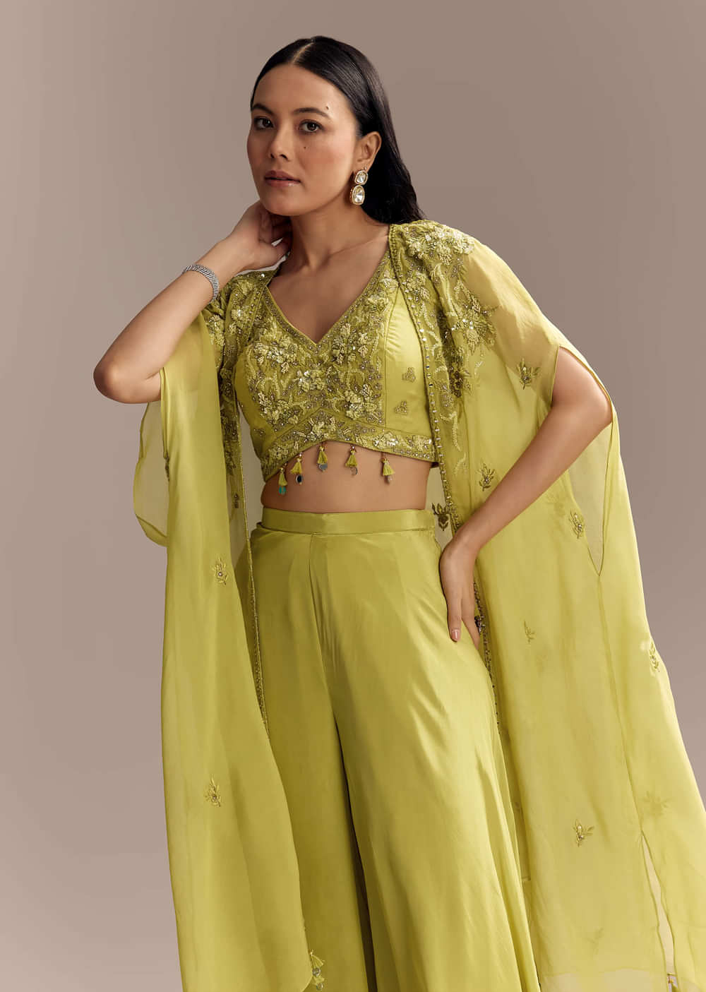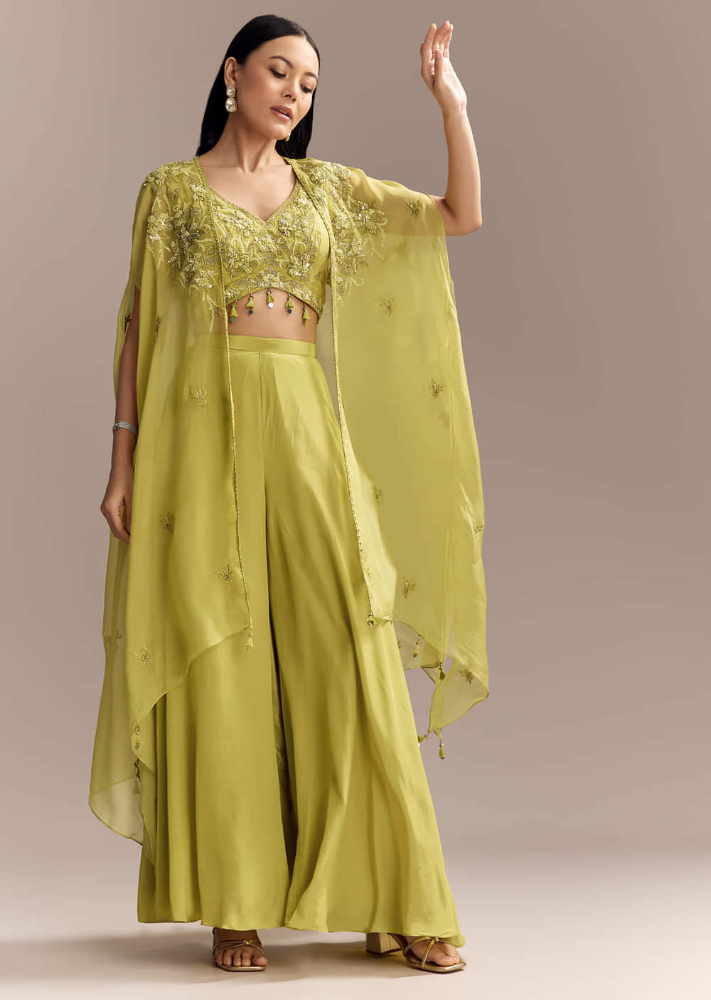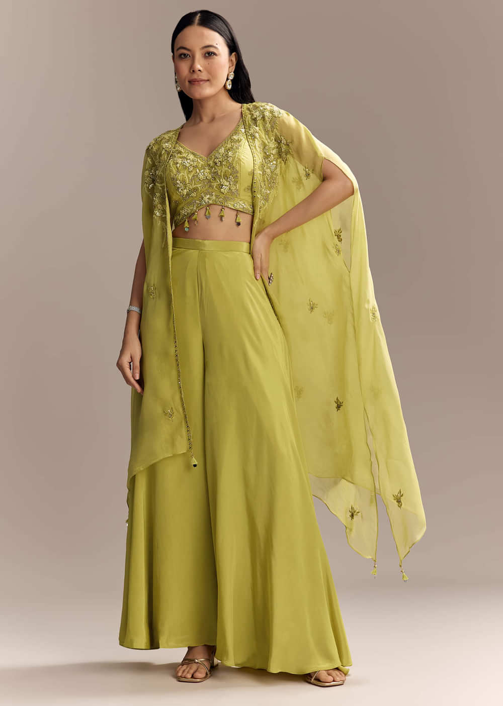 Mehendi Green Crepe Crop Top And Palazzo Set With Embroidered Cape