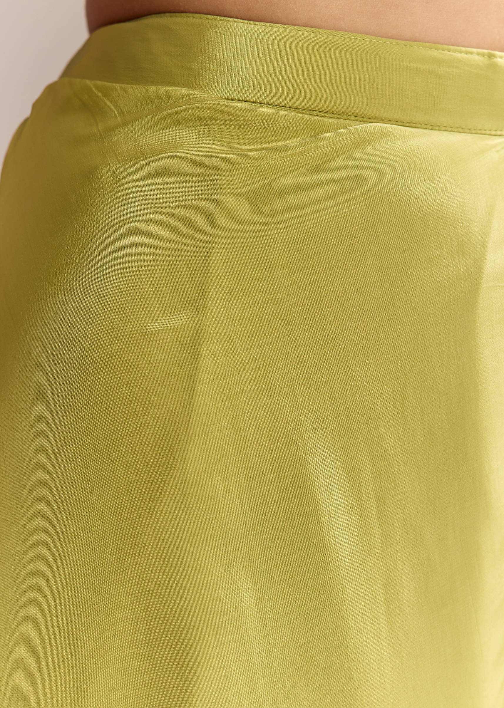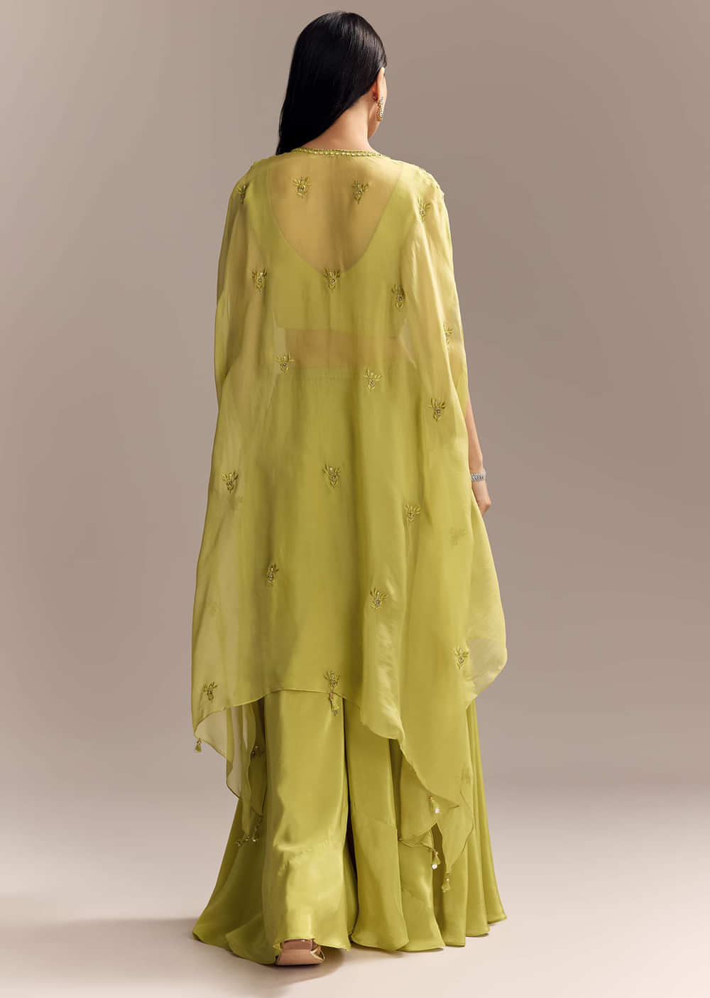 Playful and polished, this mehendi green crepe crop top and palazzo set lifts your mood and keeps every step breezy. Embroidery lights up the cape with neat motifs that frame the shoulders and add soft shimmer. Perfect for a bridesmaid or wedding guest at haldi, mehendi, or sangeet when you want ease, twirl, and a little shine. Awarded as the Most Trusted Brand, we're delivering styles you love, just as promised.