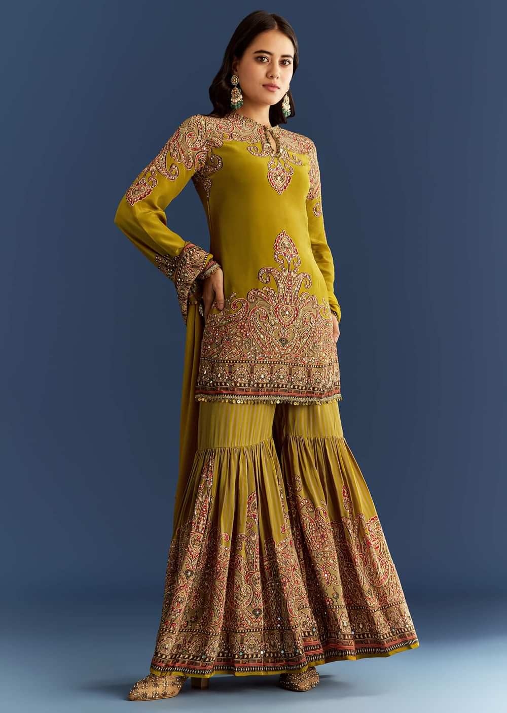 A mehendi green printed kurta paired with matching sharara and a chinon dupatta—effortlessly festive and breezy in crepe fabric.