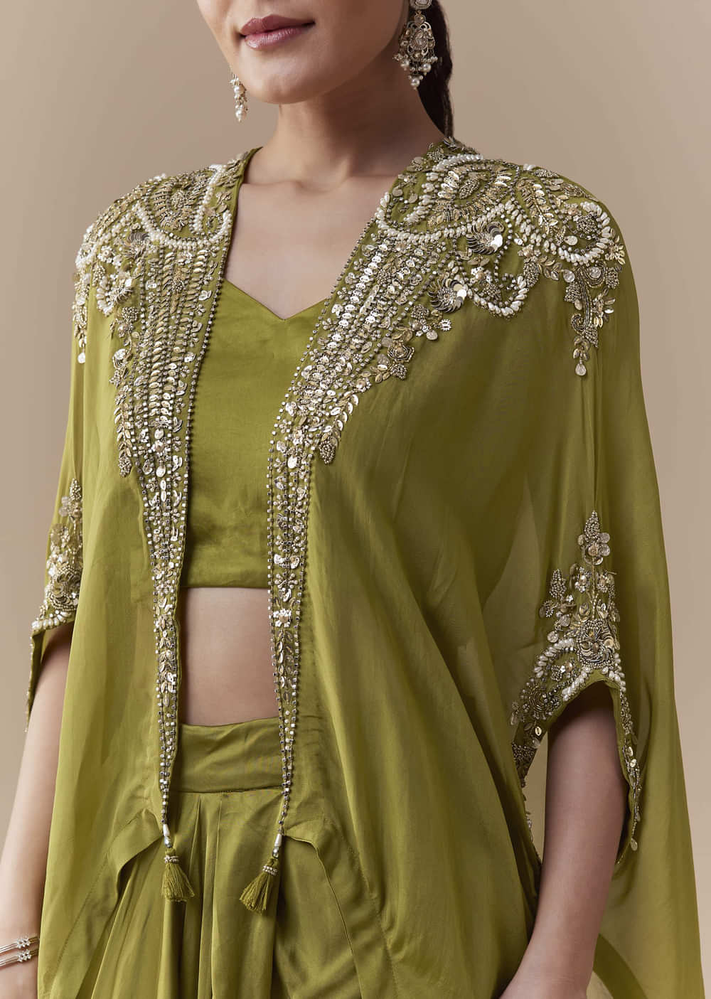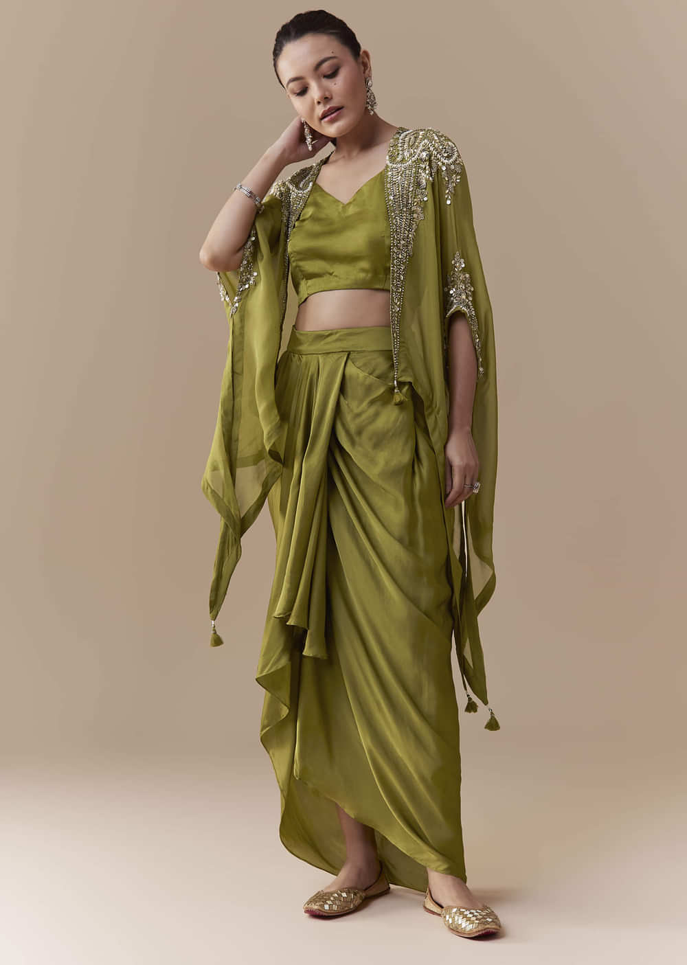 Mehendi Green Crop Top Draped Skirt Set with Sequin Cape