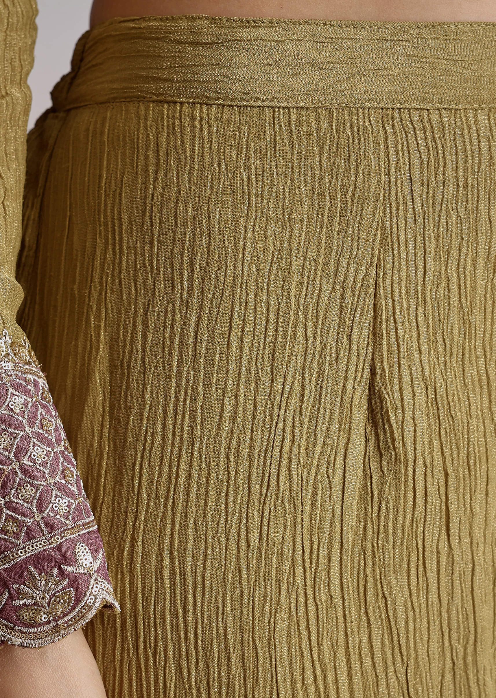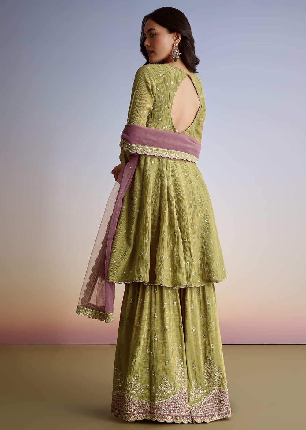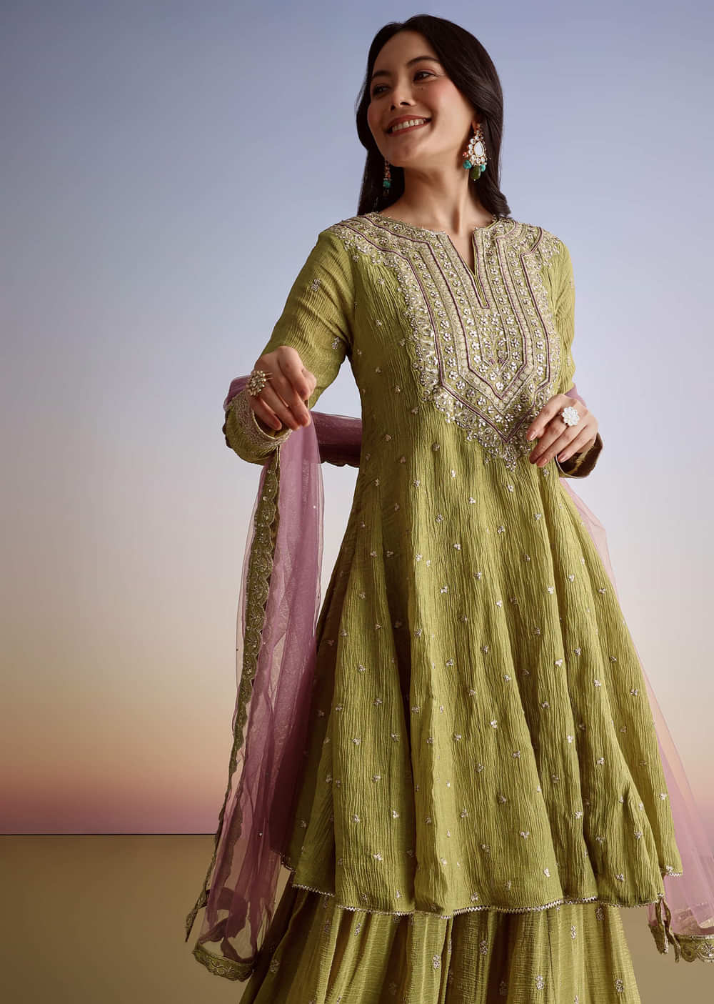 Mehendi Green Crush Tissue Sharara Suit With Zari Sequins