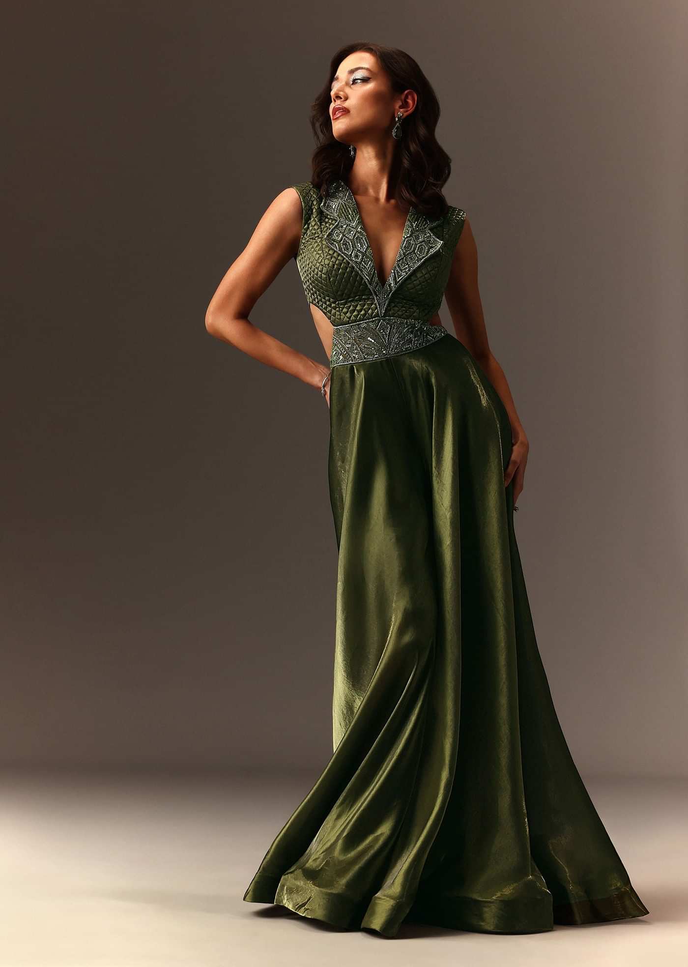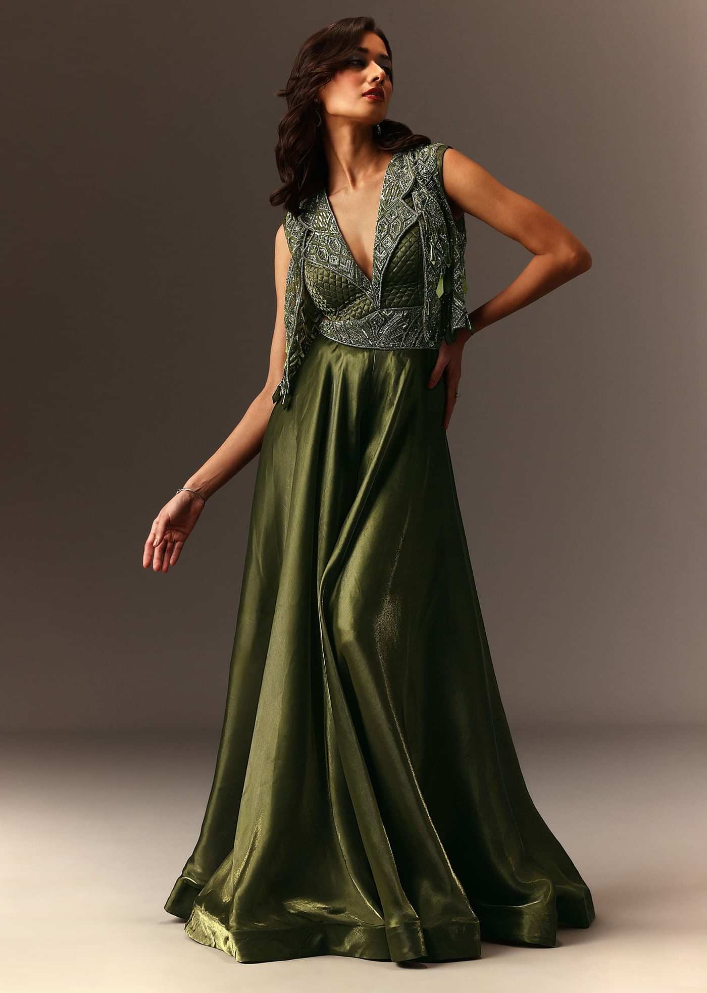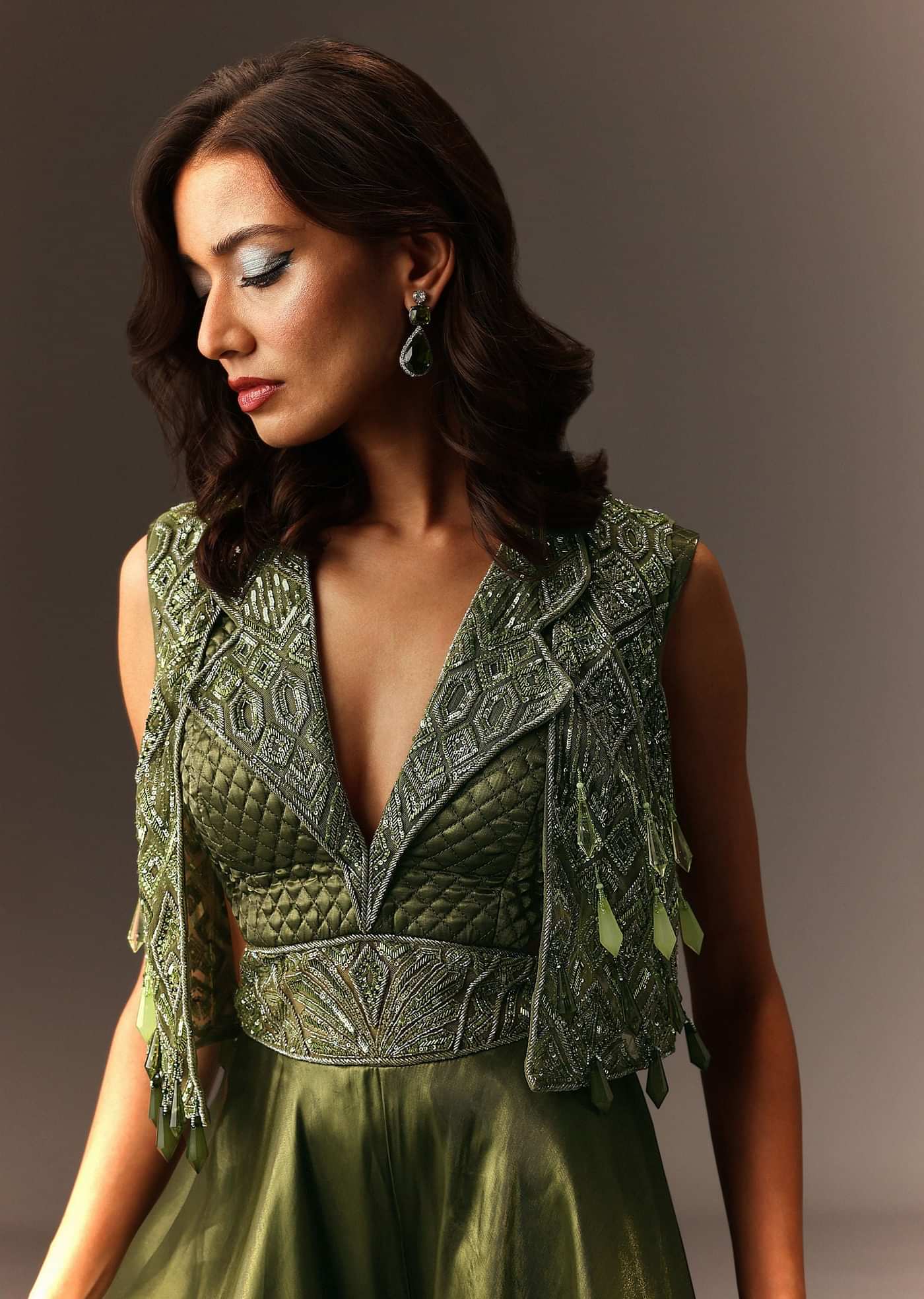 The mehendi green jumpsuit, a vibrant hue that evokes the lushness of a springtime garden, its color as rich and inviting as a freshly brewed cup of tea. A collar... More Product Details