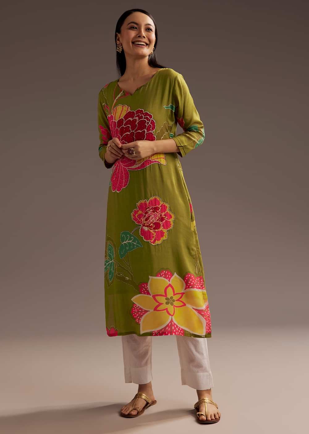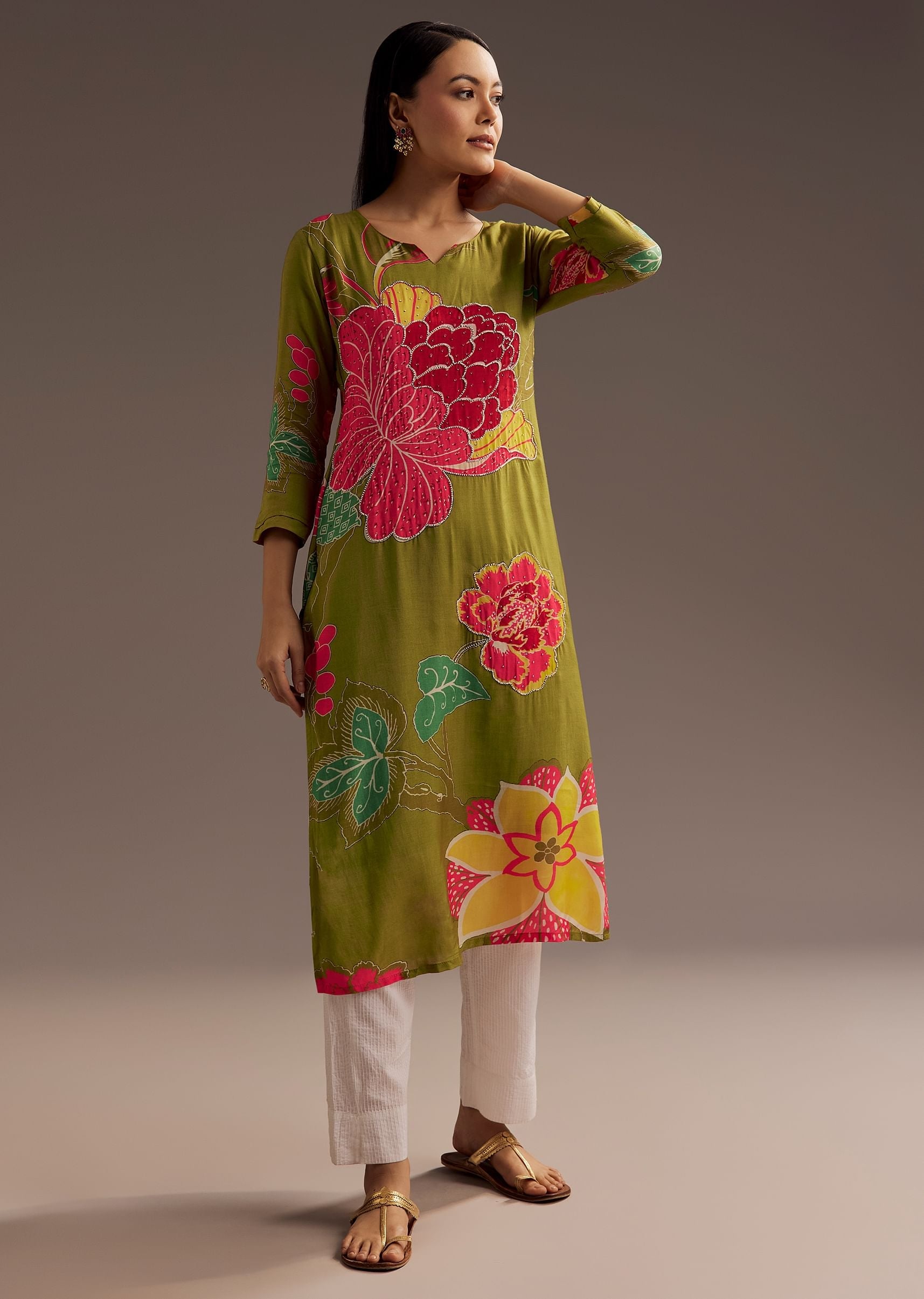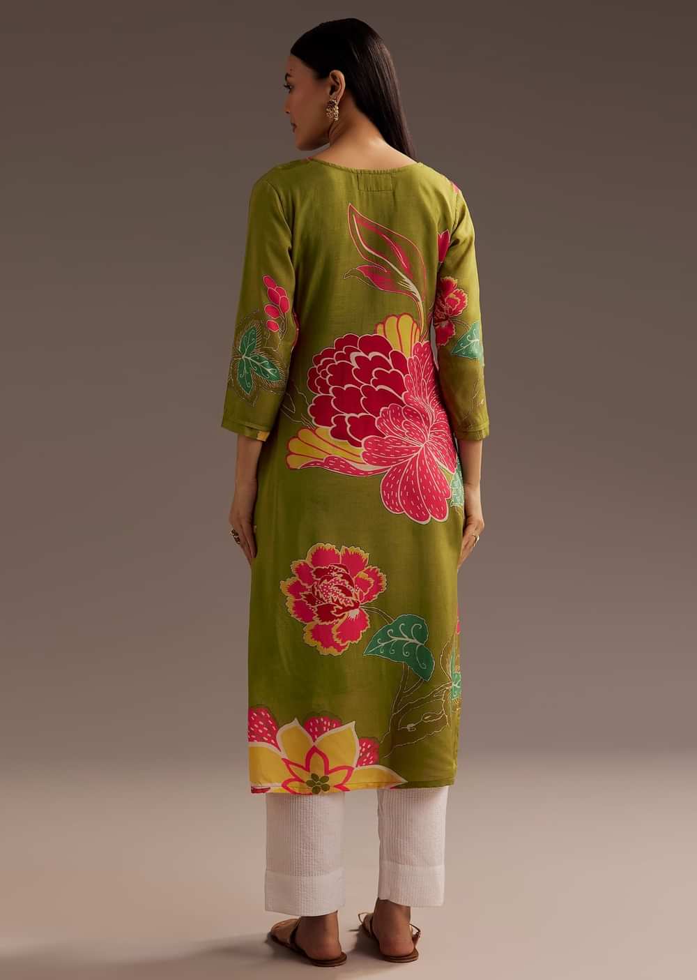 Mehendi Green Floral Print Crepe Kurta With Beads Detailing
