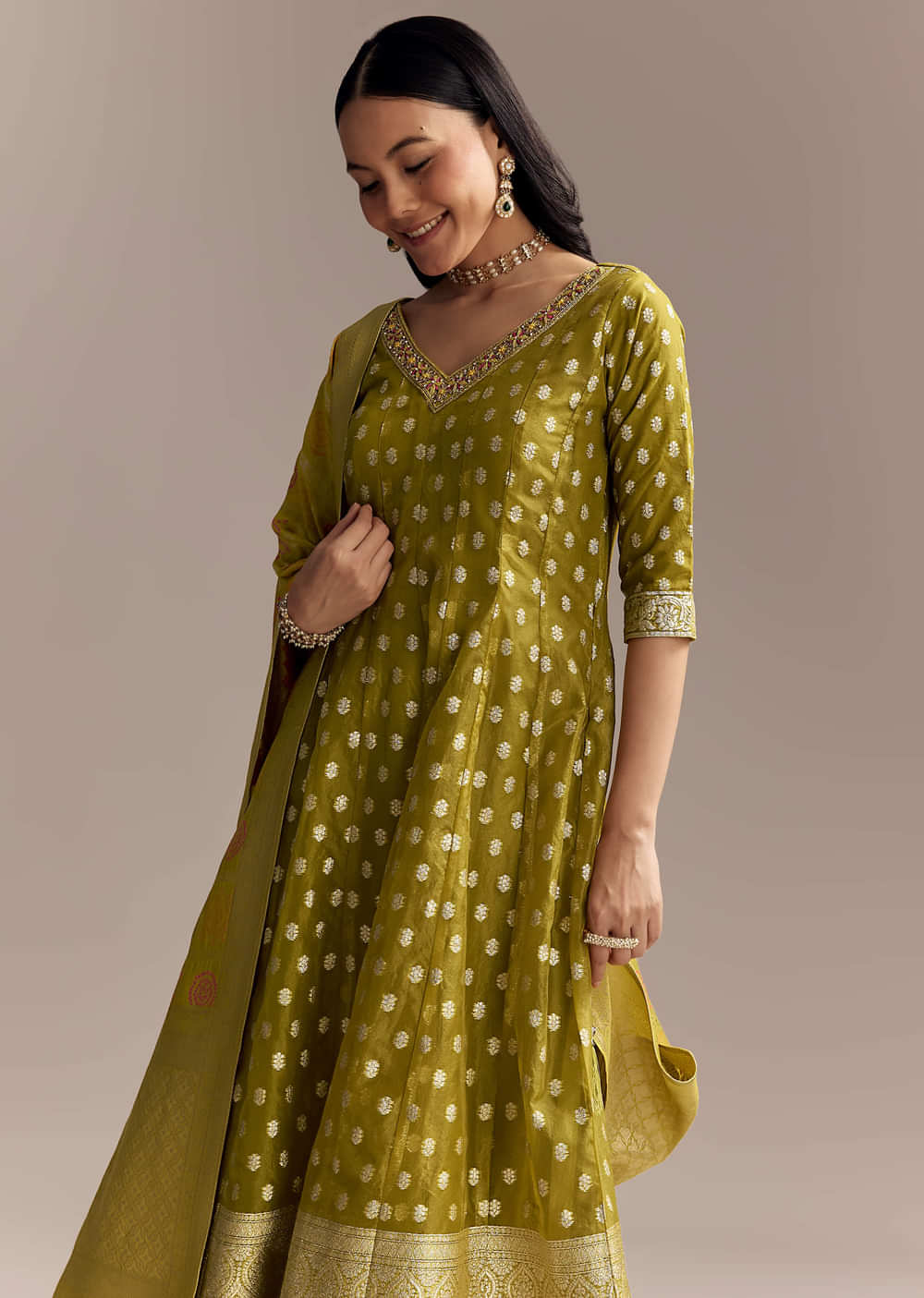 Mehendi Green Jacquard Anarkali Suit With Woven Brocade Dupatta
