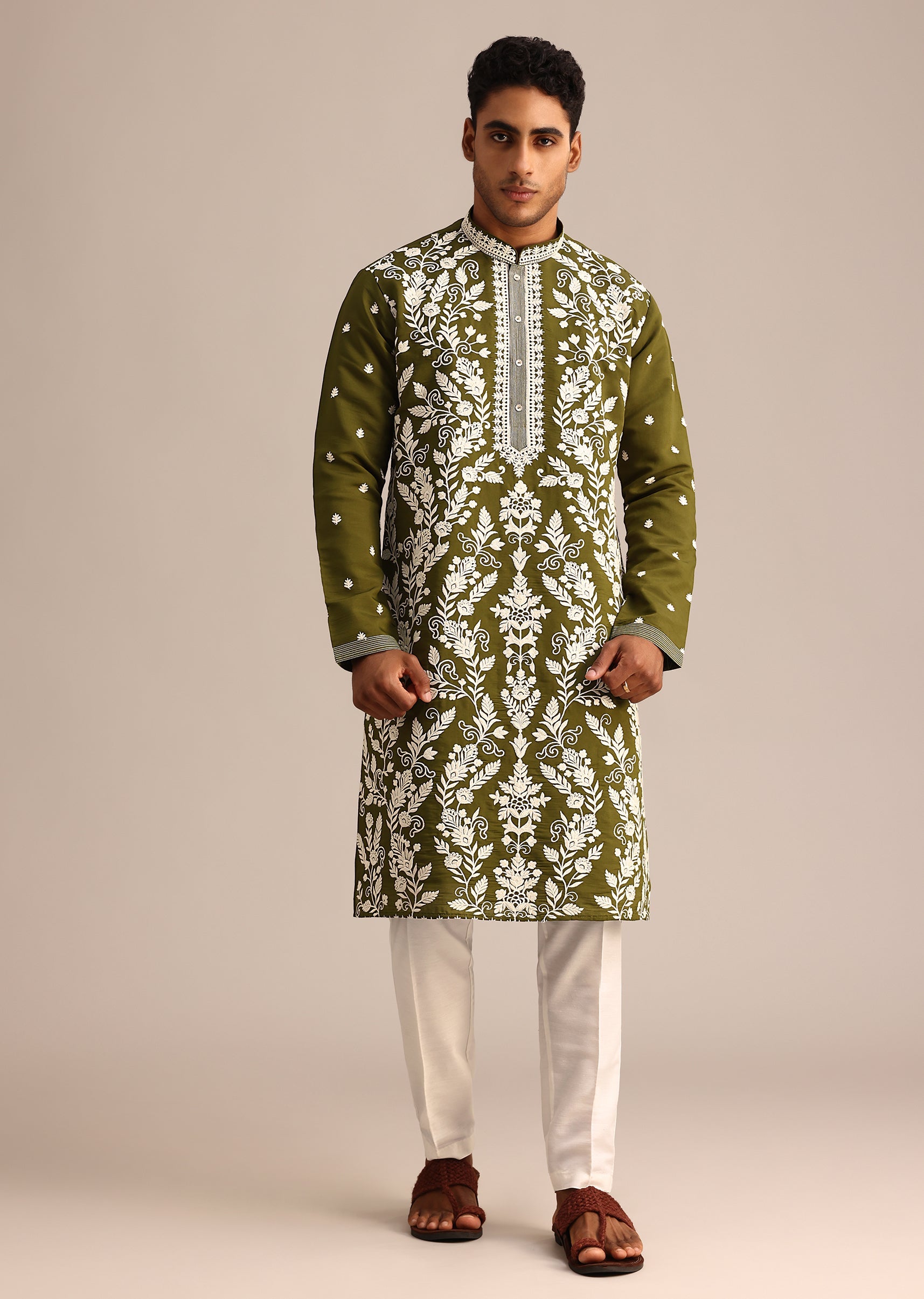 Elevate your traditional wardrobe with this mehendi green kurta and pant set for men. Decked with intricate thread work and floral motifs, it is accentuated with intricate hand embroidery. Complemented with front buttons and a mandarin collar, the comfortable full sleeves make it perfect for festive occasions, wedding celebrations and family gatherings. Neck work may vary. Awarded as the Most Trusted Brand, we're delivering styles you love, just as promised.