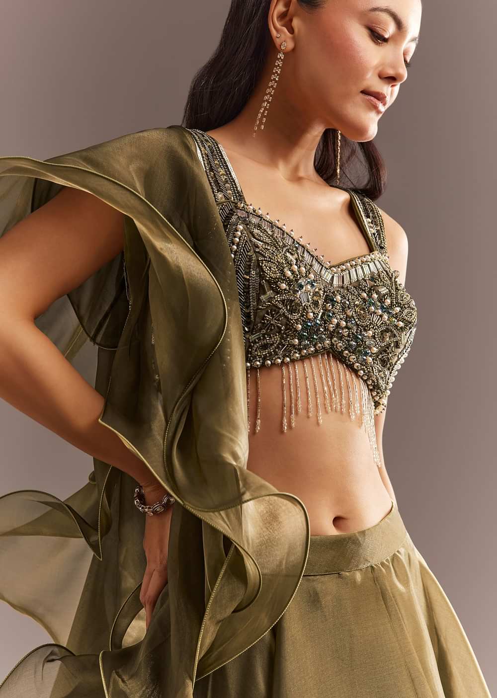 Mehendi Green Organza Choli Lehenga With Ruffled Dupatta