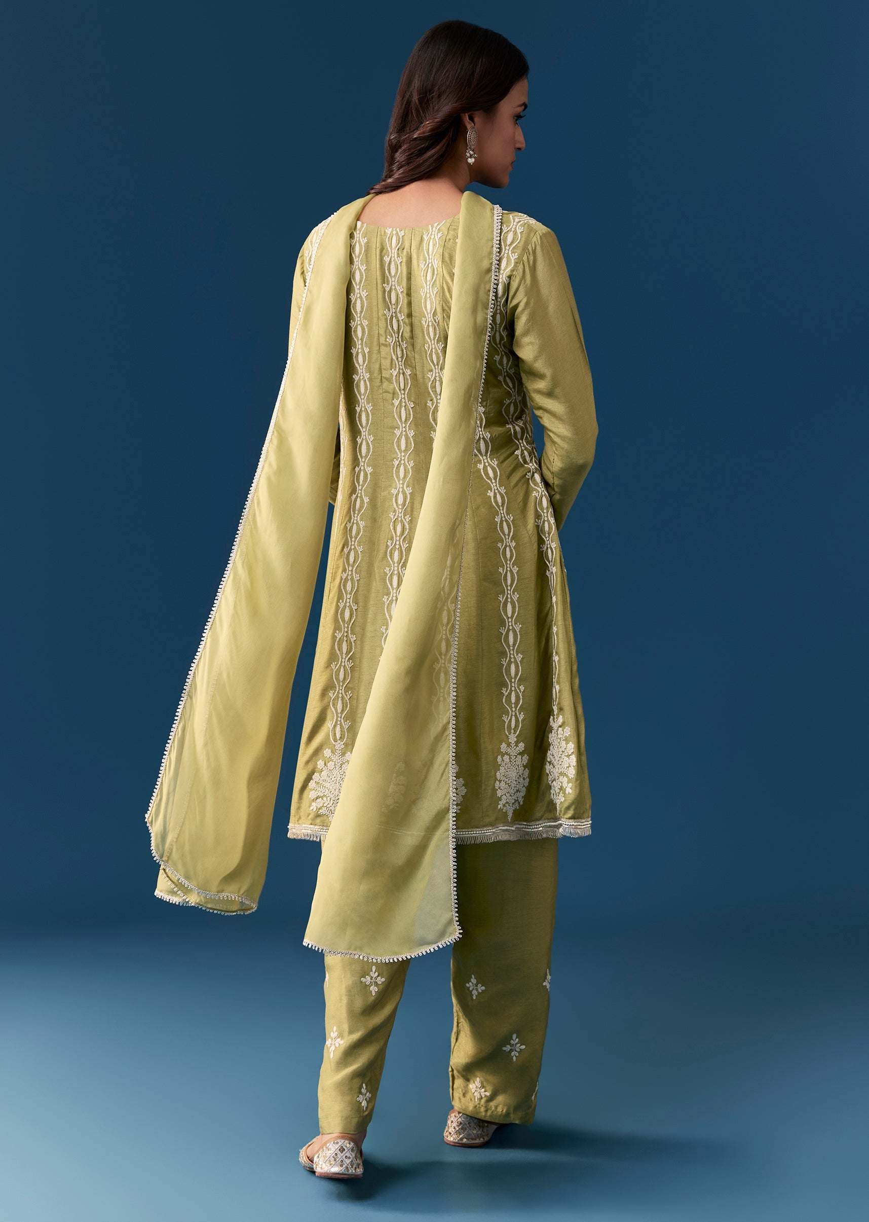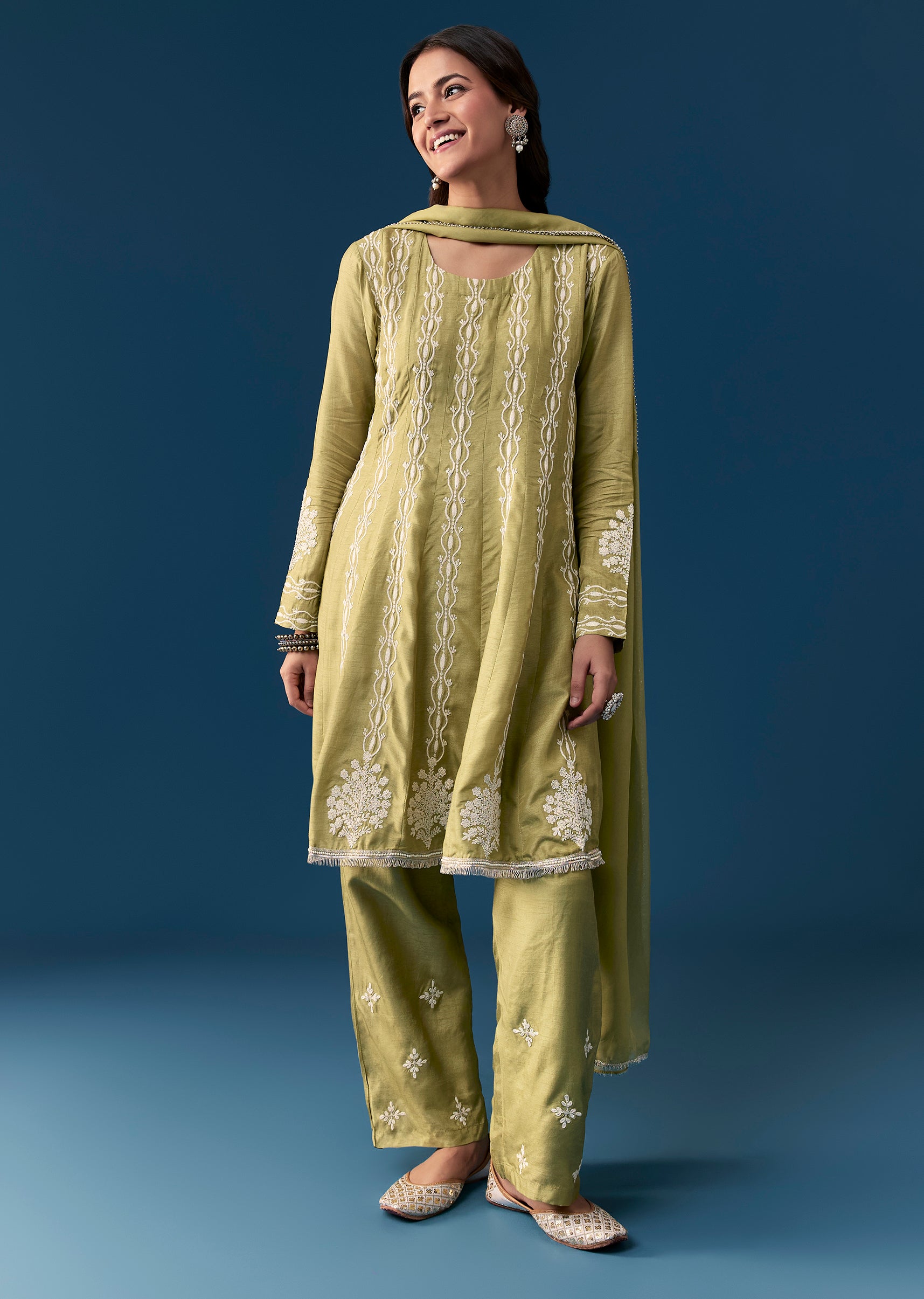 This mehendi green pastel anarkali suit features a peplum silhouette inspired by Pakistani design crafted in luxurious silk accented with delicate thread work embroidery. It has full sleeves and a... More Product Details