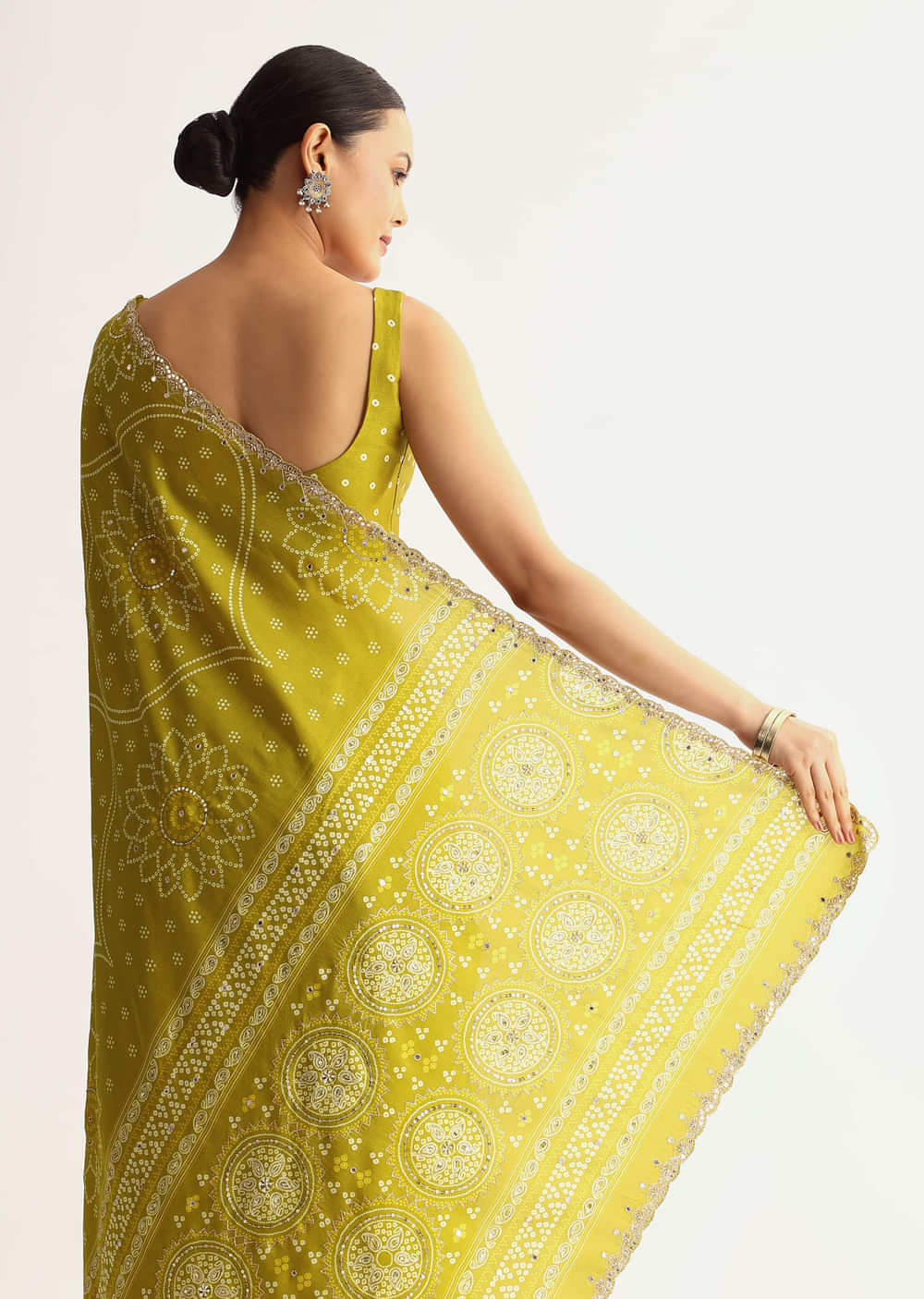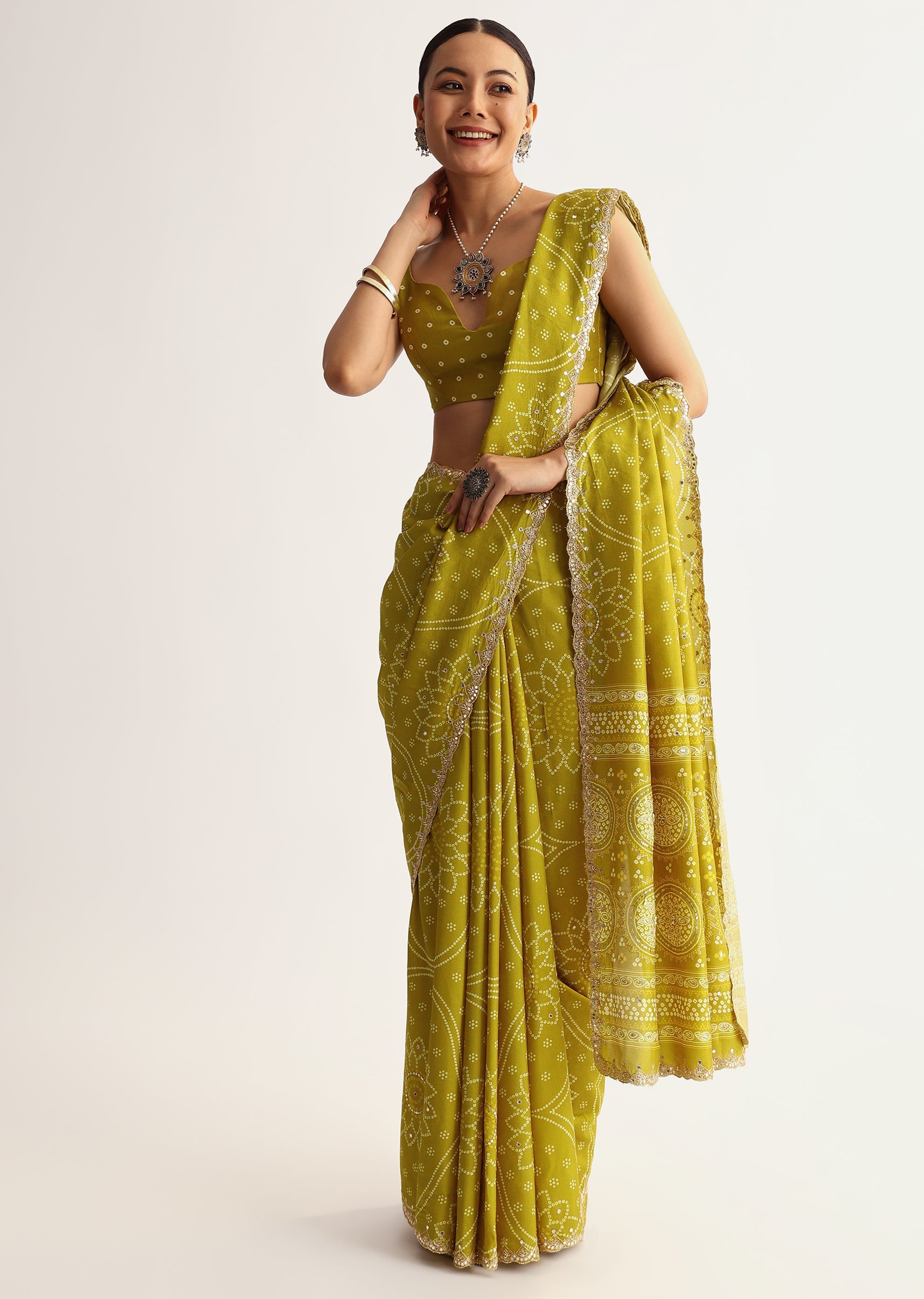 Features a patola print in classic mehandi green with scallop edging. Gota and sequin embroidery adds festive charm. Soft georgette makes it light and wearable. Comes with an embellished blouse.... More Product Details