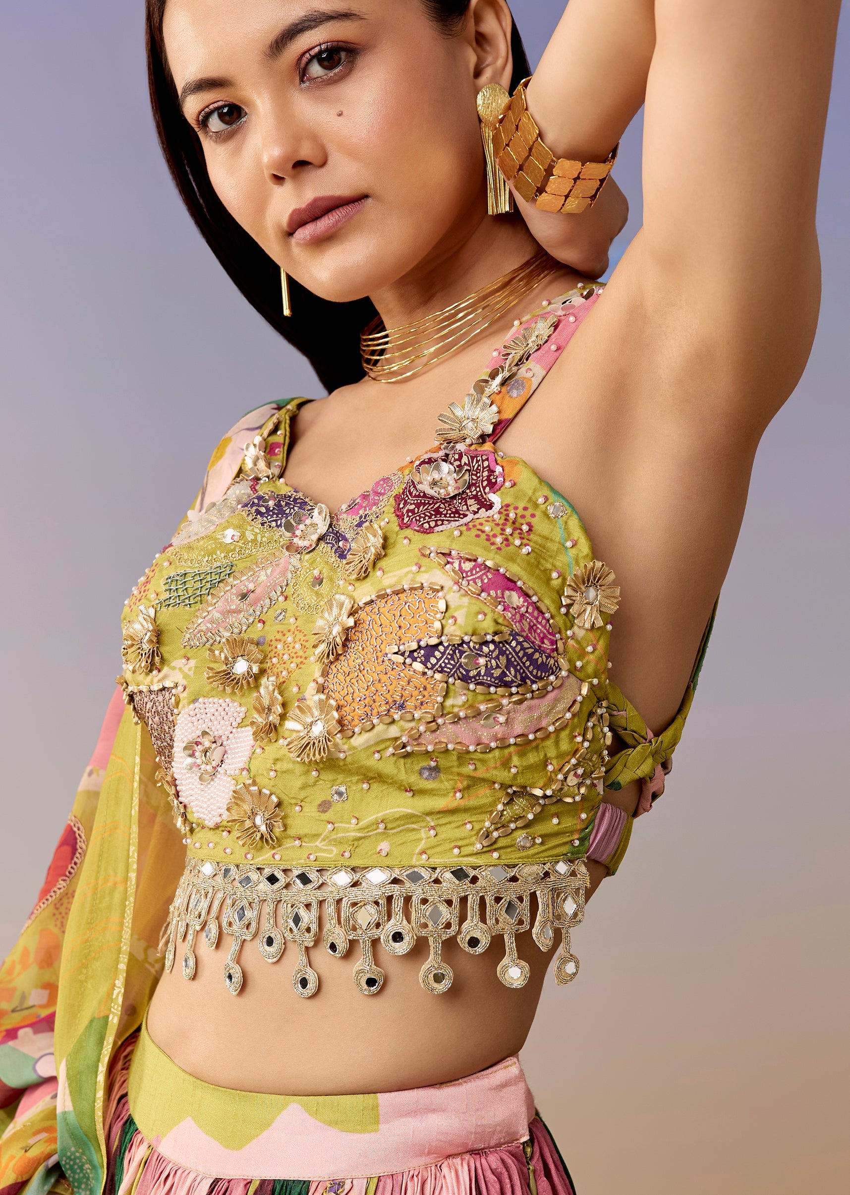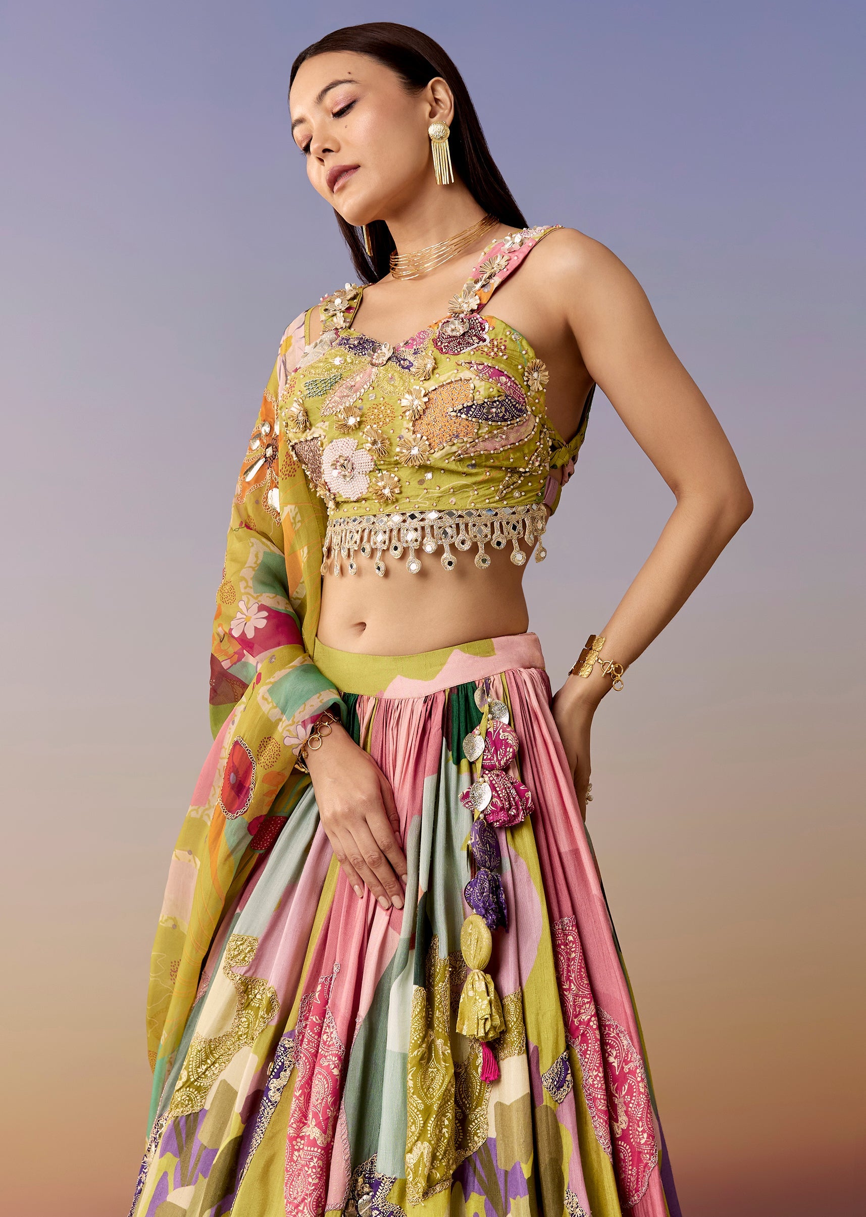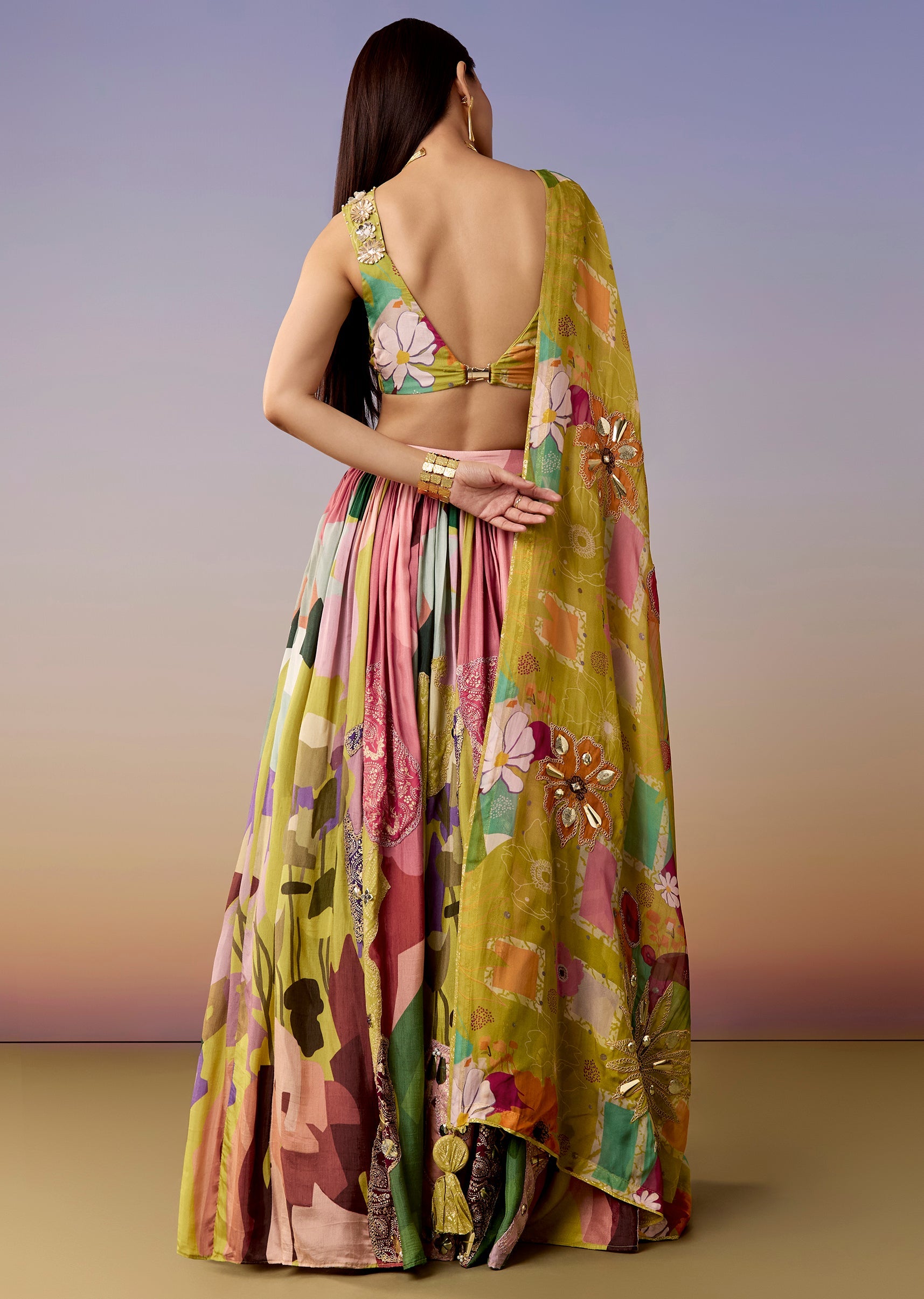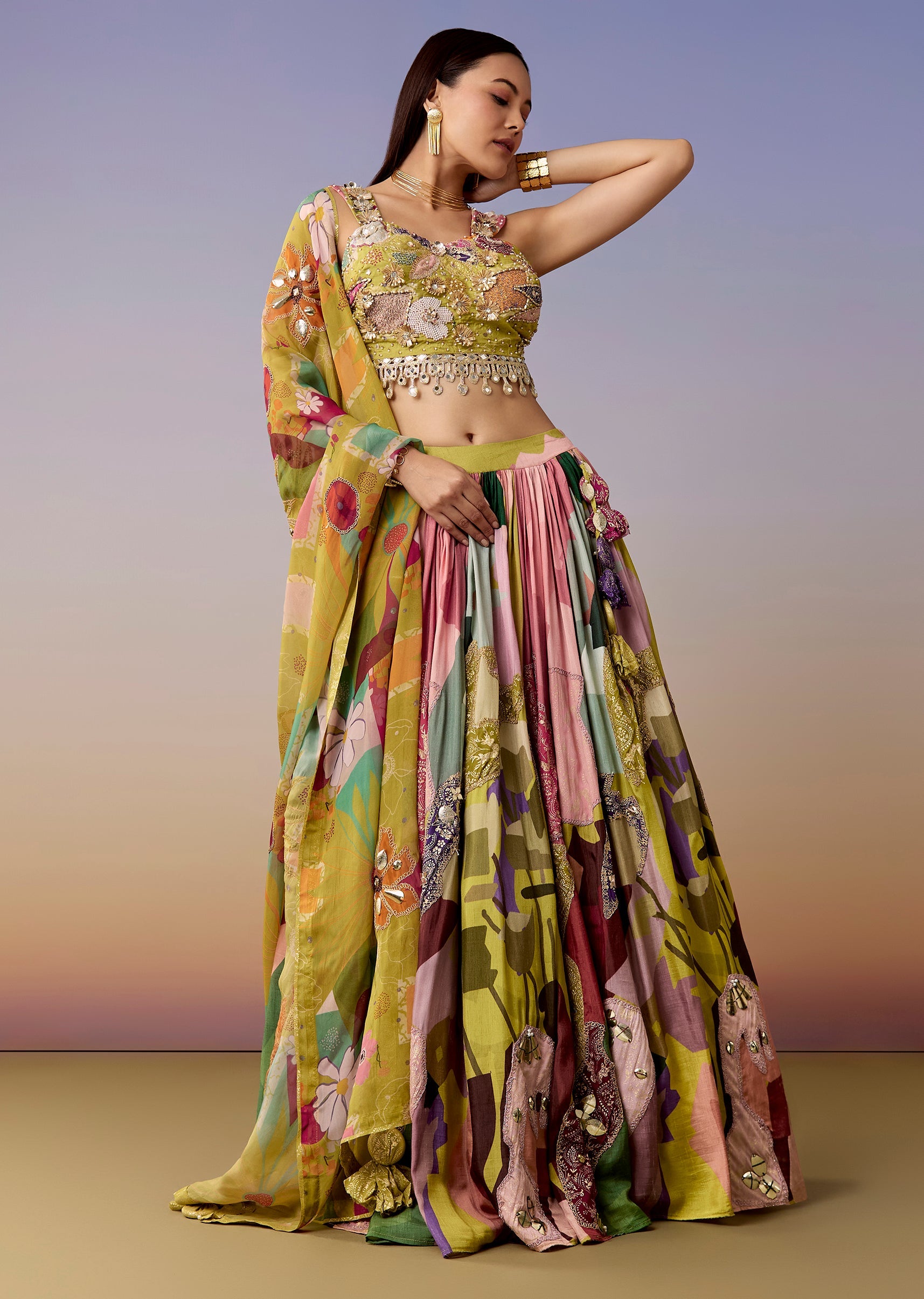 A fresh mehendi-green printed lehenga set featuring a sweetheart choli with gotta and moti work, paired with an abstract printed flared lehenga and dupatta. Perfect for haldi, mehendi, engagement, and sangeet. Awarded as the Most Trusted Brand, we're delivering styles you love, just as promised.