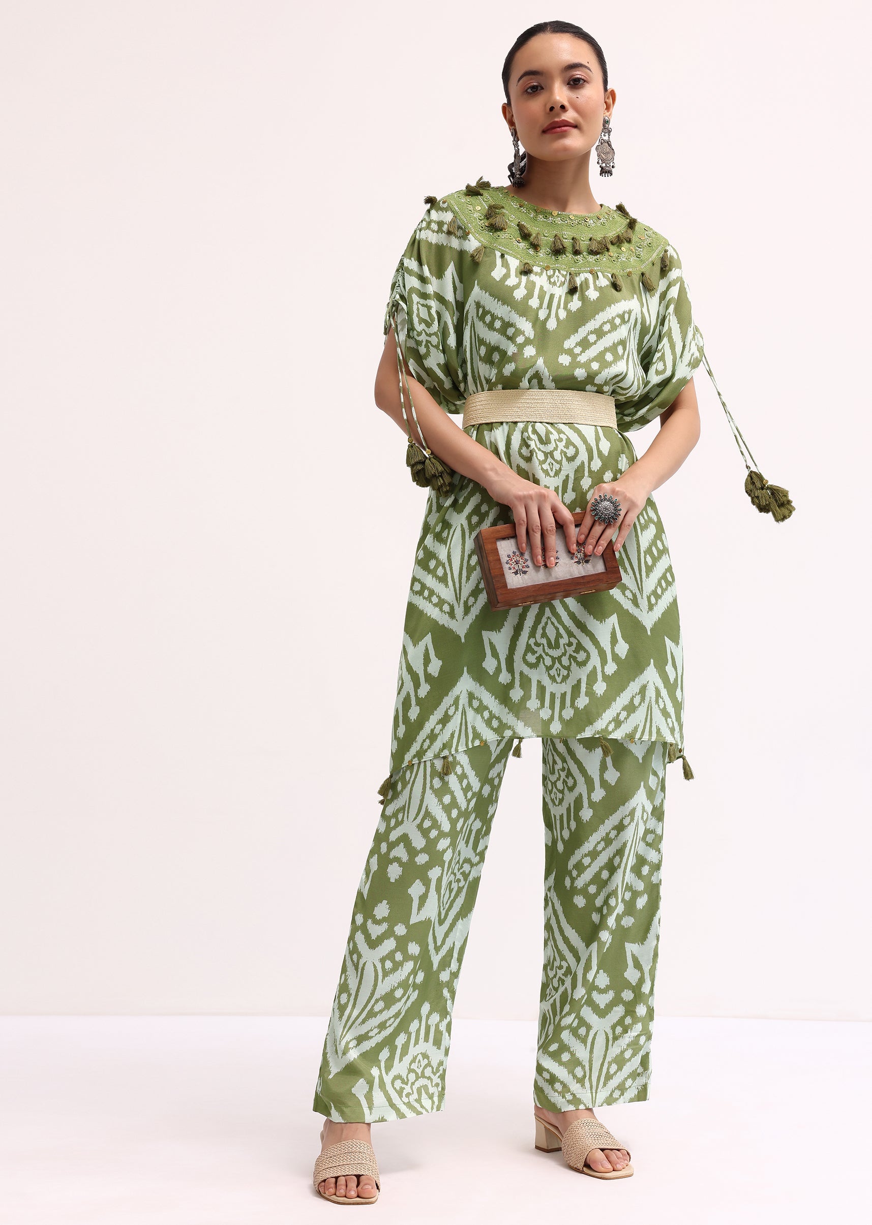 Exude glamour in our mehendi green kurta pants set perfect for both festive and casual wear. Meticulously tailored from premium cotton it is adorned with floral prints intricate threadwork and delicate sequin embroidery. The flared sleeve kurta complements the pants effortlessly. Awarded as the Most Trusted Brand, we're delivering styles you love, just as promised.