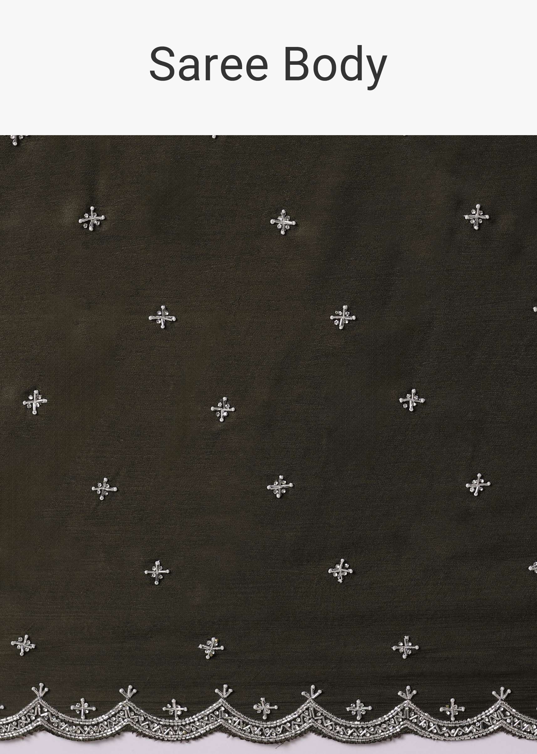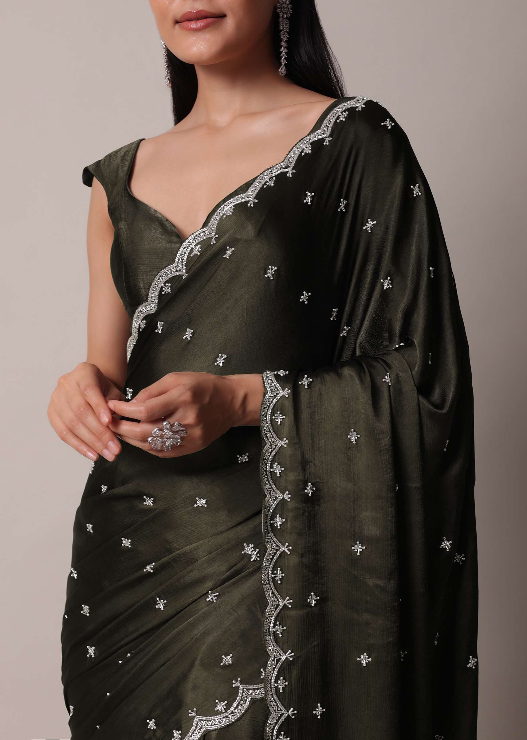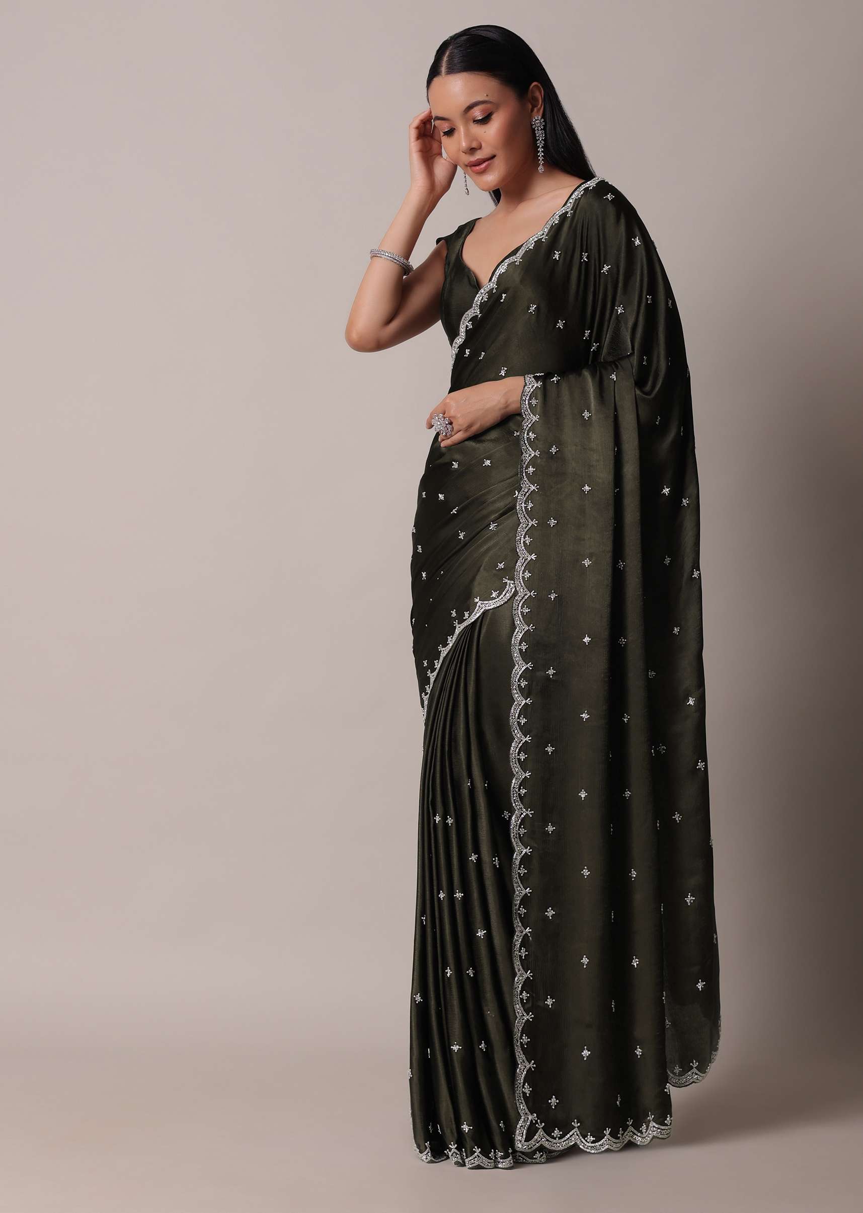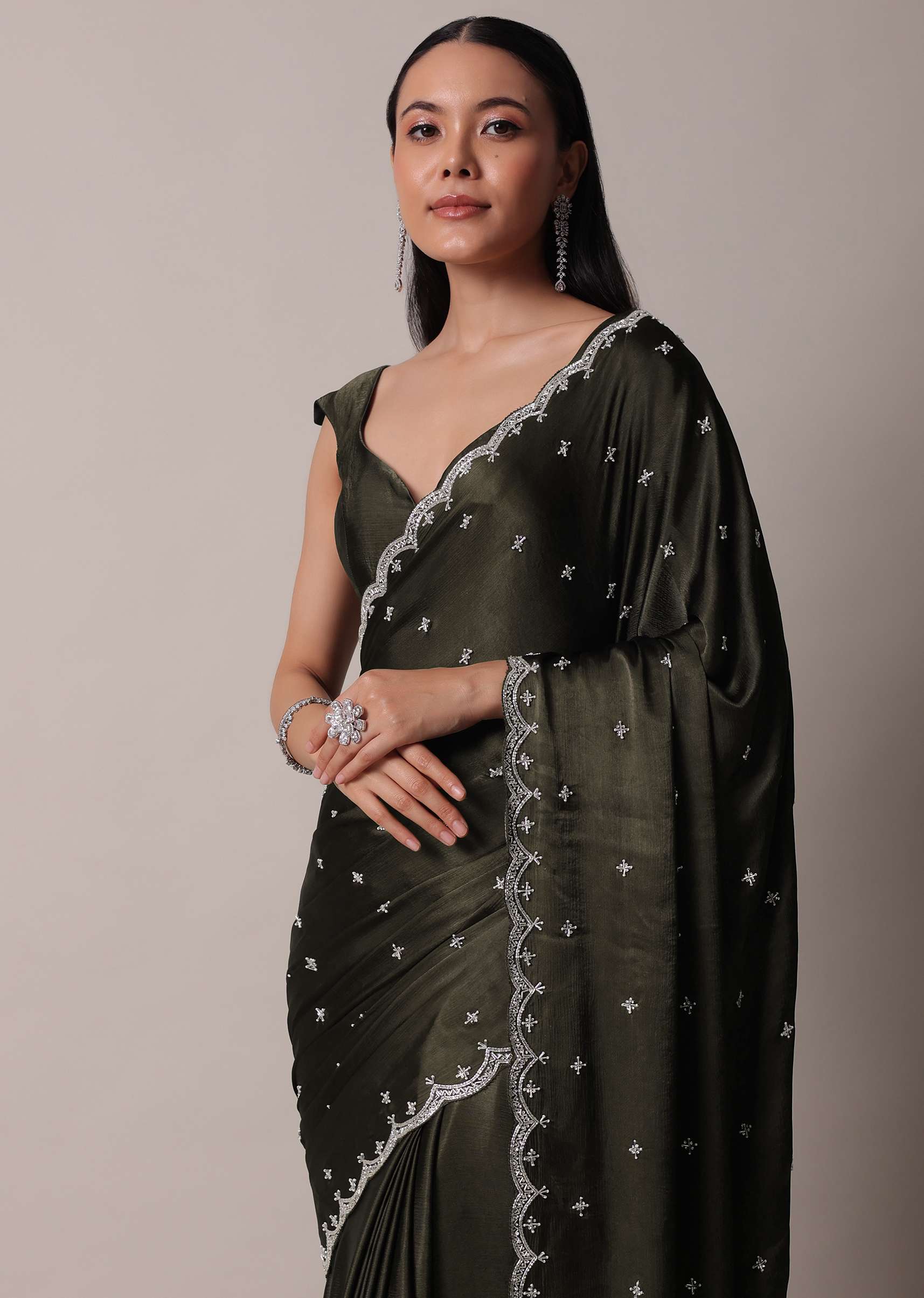 Mehendi Green Saree In Satin Chinon With Scallop Stone Work Border And Unstitched Blouse Piece