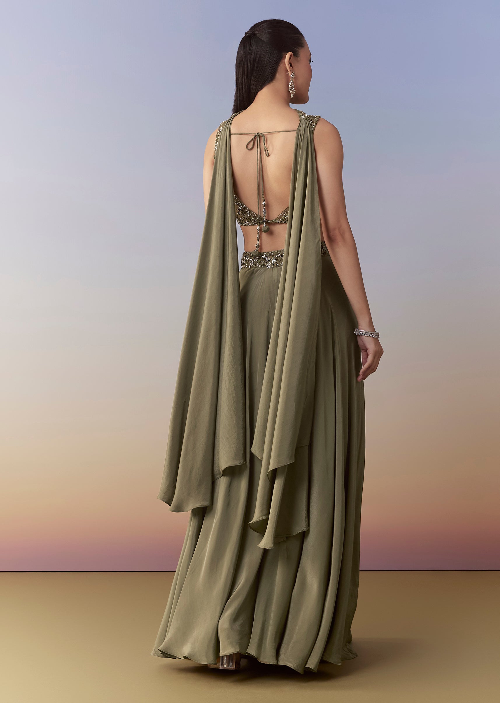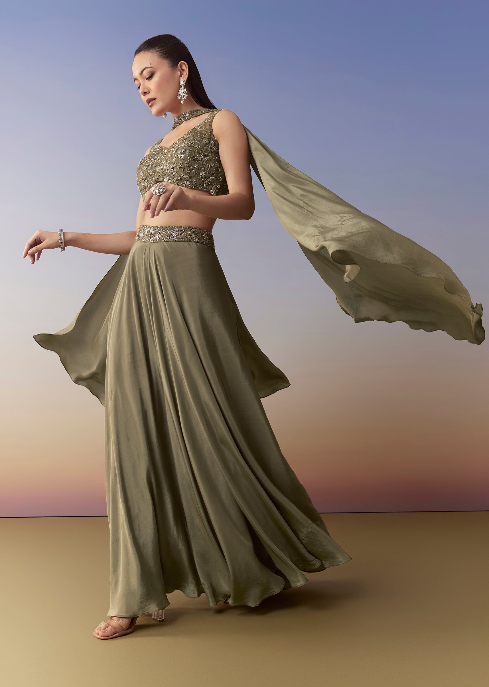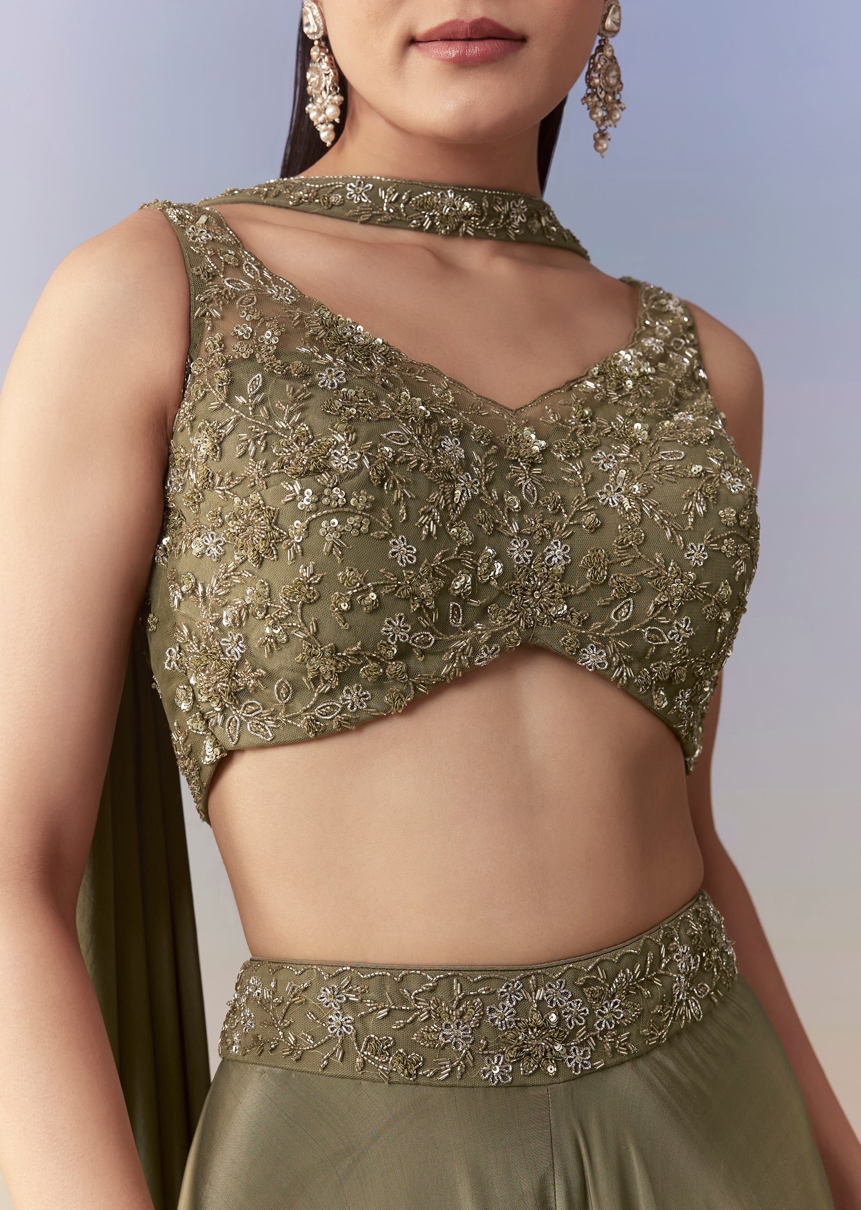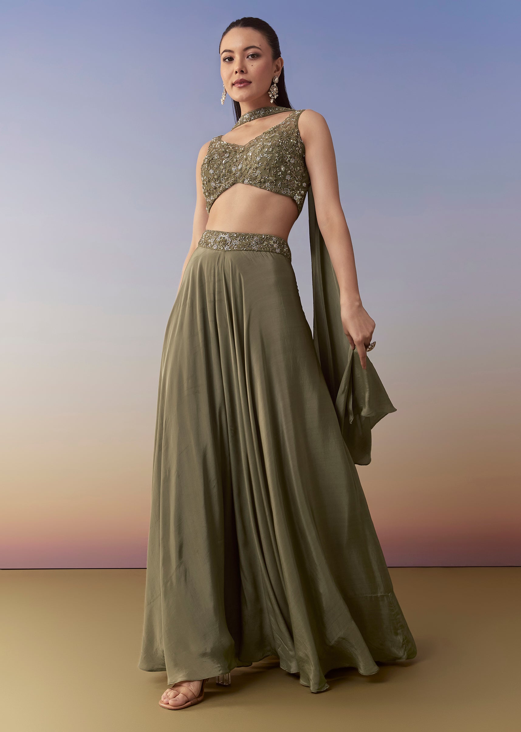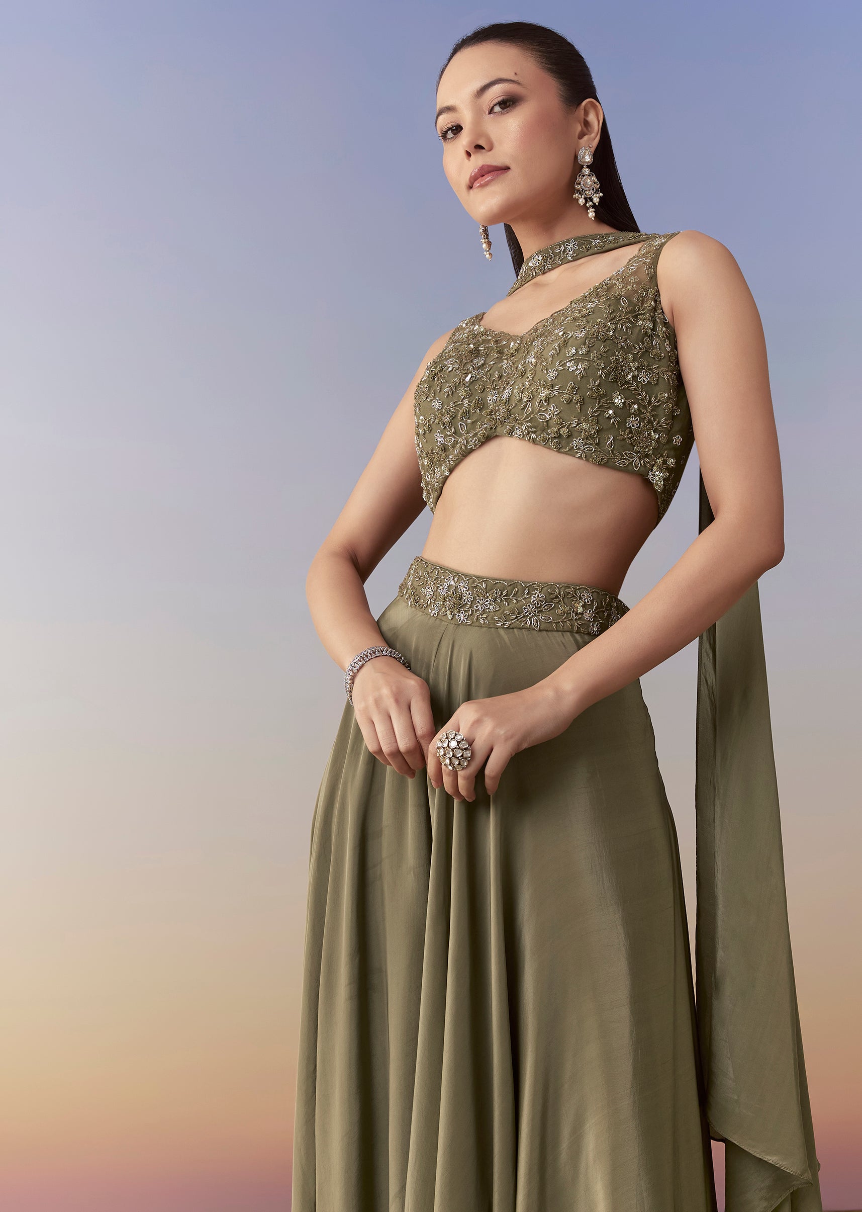 Mehendi Green Sequin Indo Western Crop Top Palazzo Set