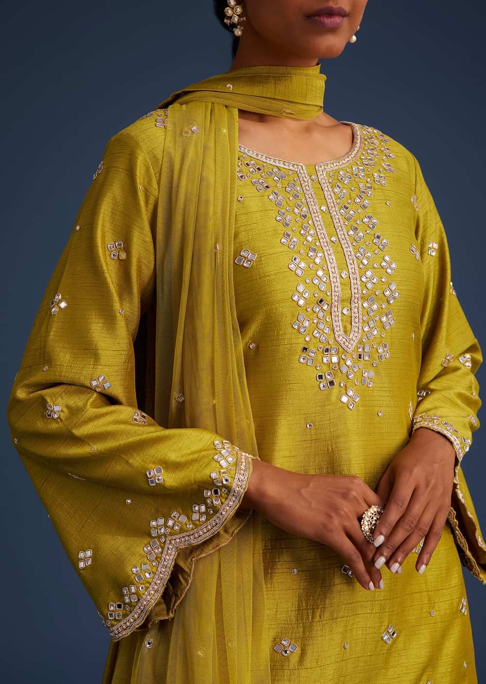 • Step Into Elegance With This Mehendi Green Silk Kurta Dhoti Set Enriched With Intricate Mirror Work Moti And Zardosi Embroidery.