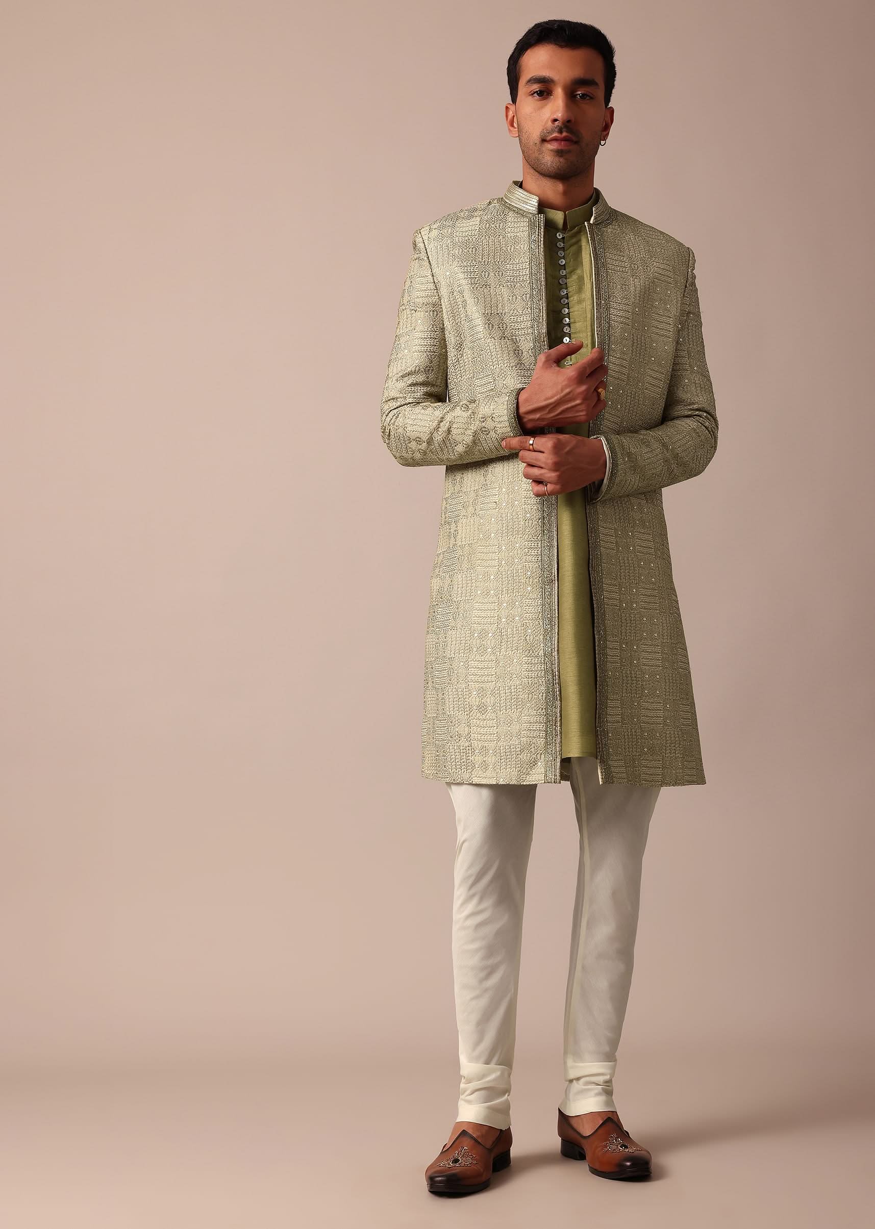 Mehendi Green Silk Sherwani With Intricate Embroidery