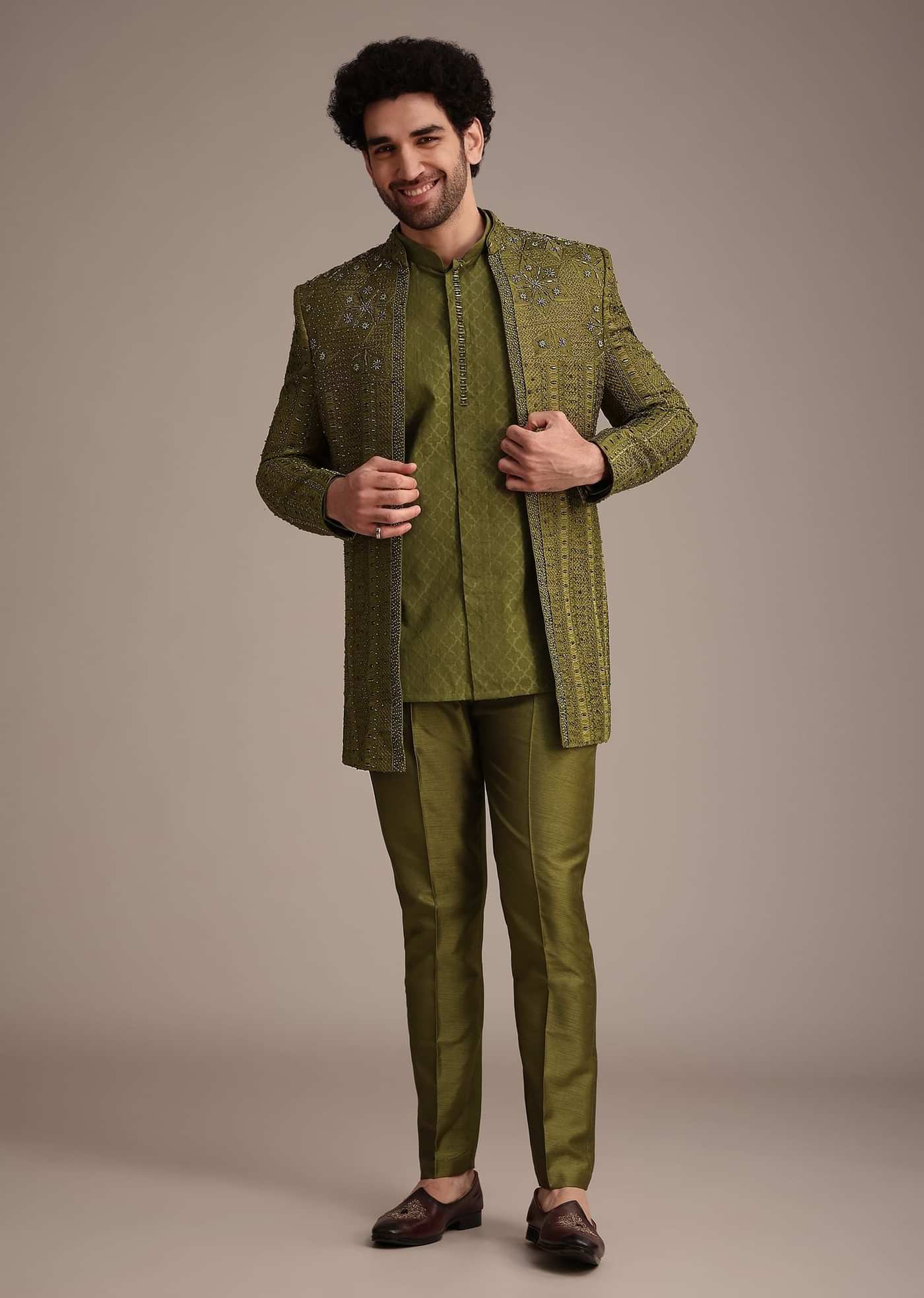 Mehendi Green Silk Zardosi Kurta Jacket Set