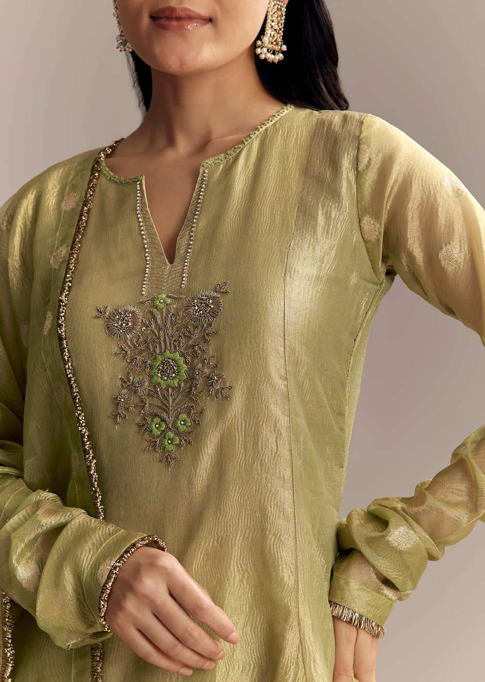Regal yet calm, this mehendi green tissue anarkali suit settles with graceful fall and soft lustre. Traditional zardosi work highlights the yoke and borders with rich texture. Perfect for festive... More Product Details