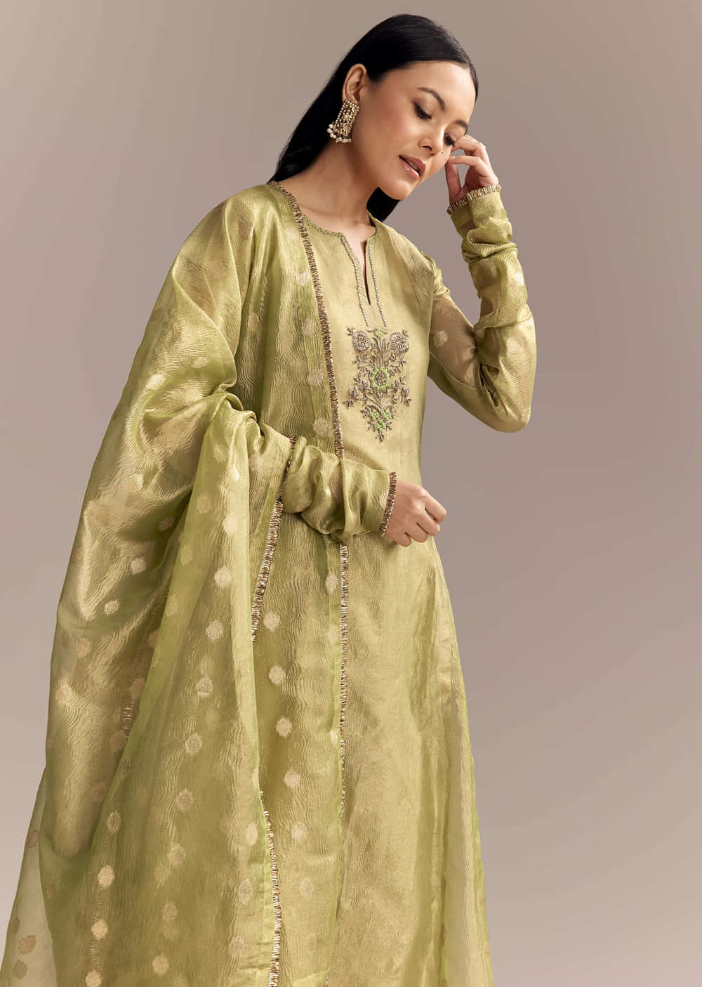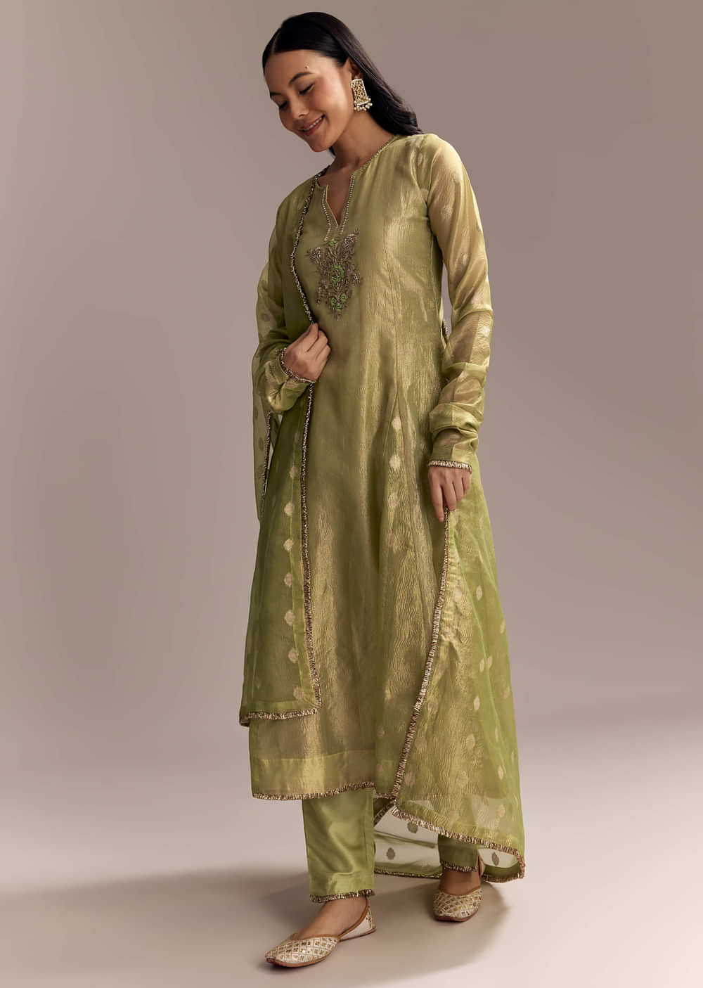 Mehendi Green Tissue Anarkali Suit With Zardosi Work