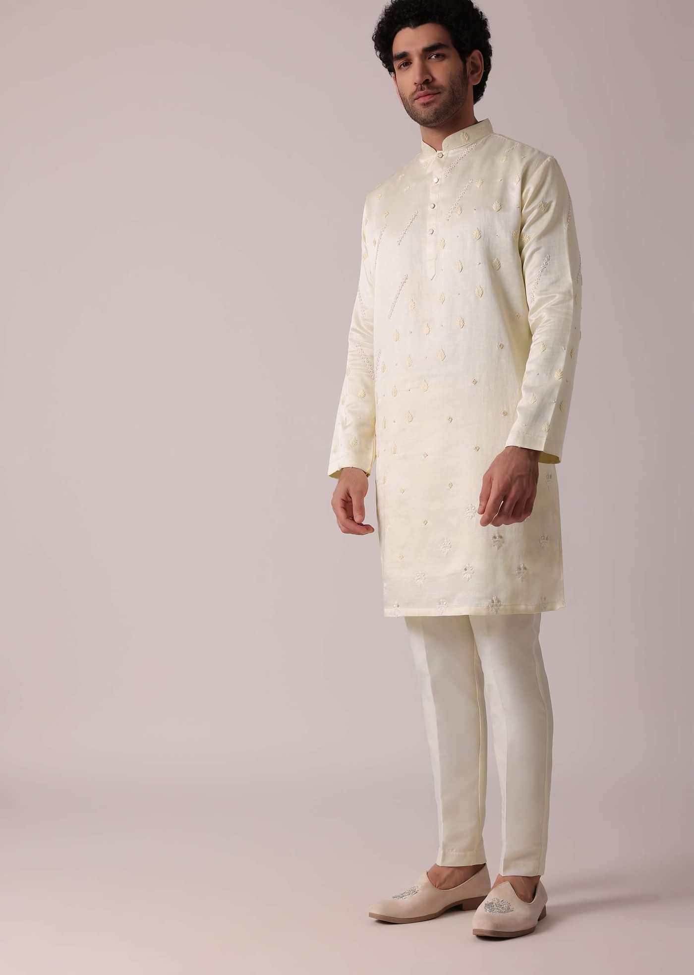Men White Silk Kurta Set With Intricate Handwork