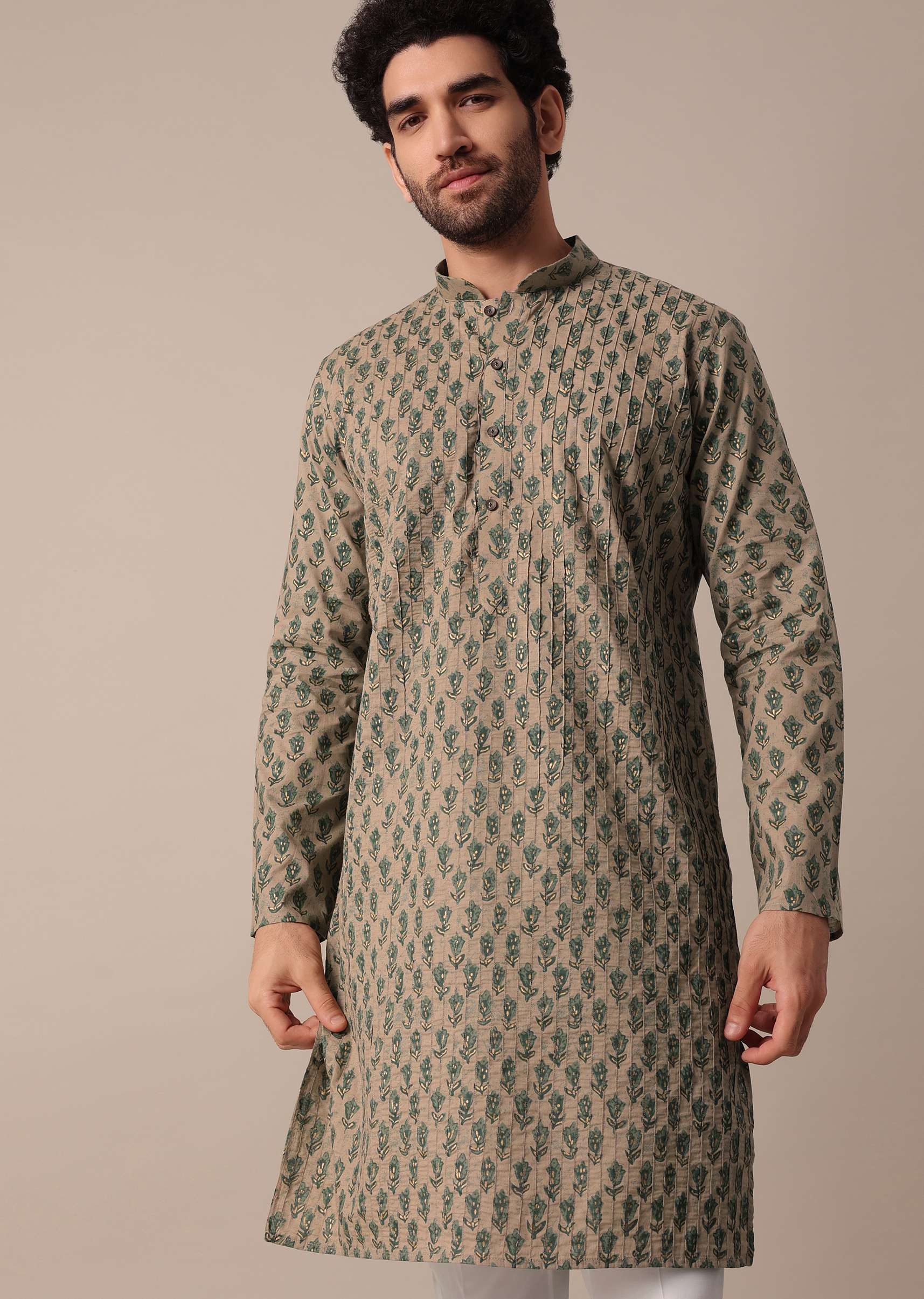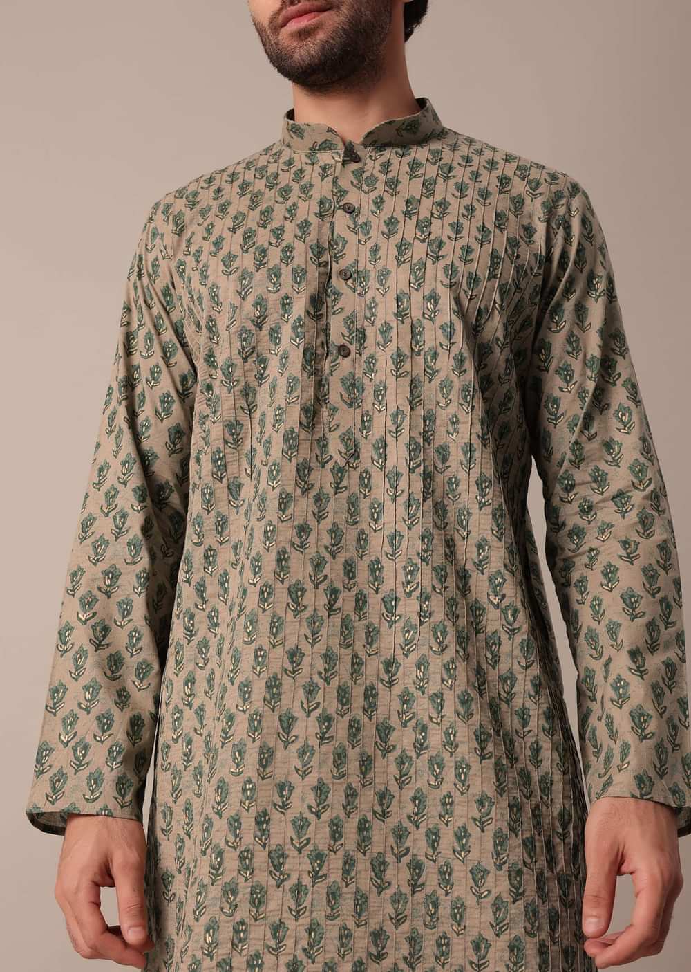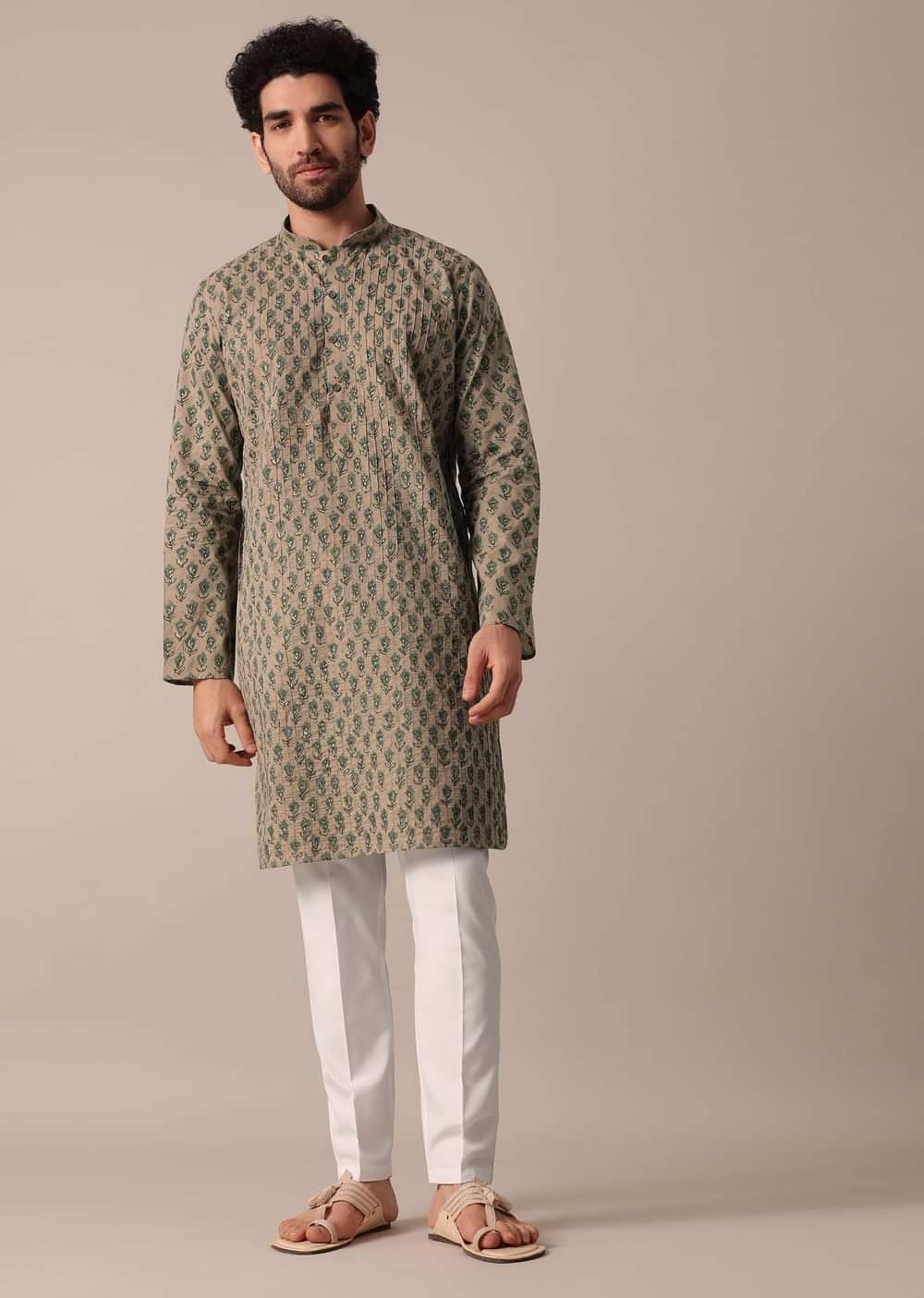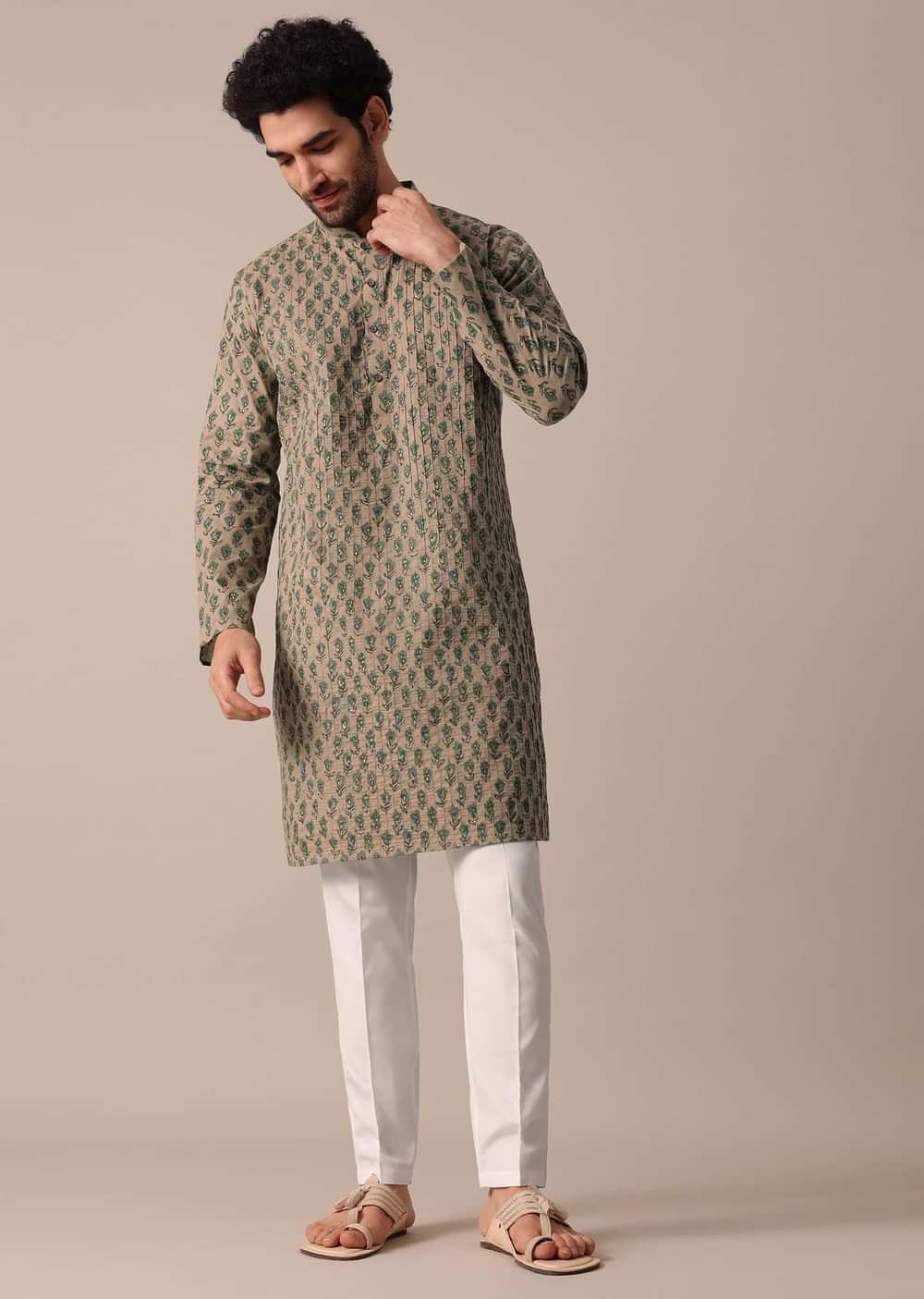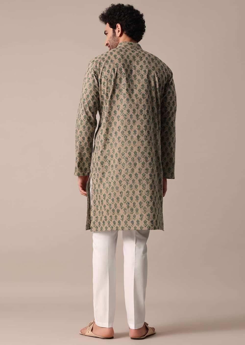 Elevate your festive wardrobe with our Mens Green Cotton Kurta Set. It showcases a captivating Jaipur Print enhanced with subtle foil detailing. The rich green hue, complemented by deep bottle green accents, adds a touch of sophistication. This set, inclusive of one kurta and one bottom, boasts a basic silhouette adorned with intricate print work. Awarded as the Most Trusted Brand, we're delivering styles you love, just as promised.
