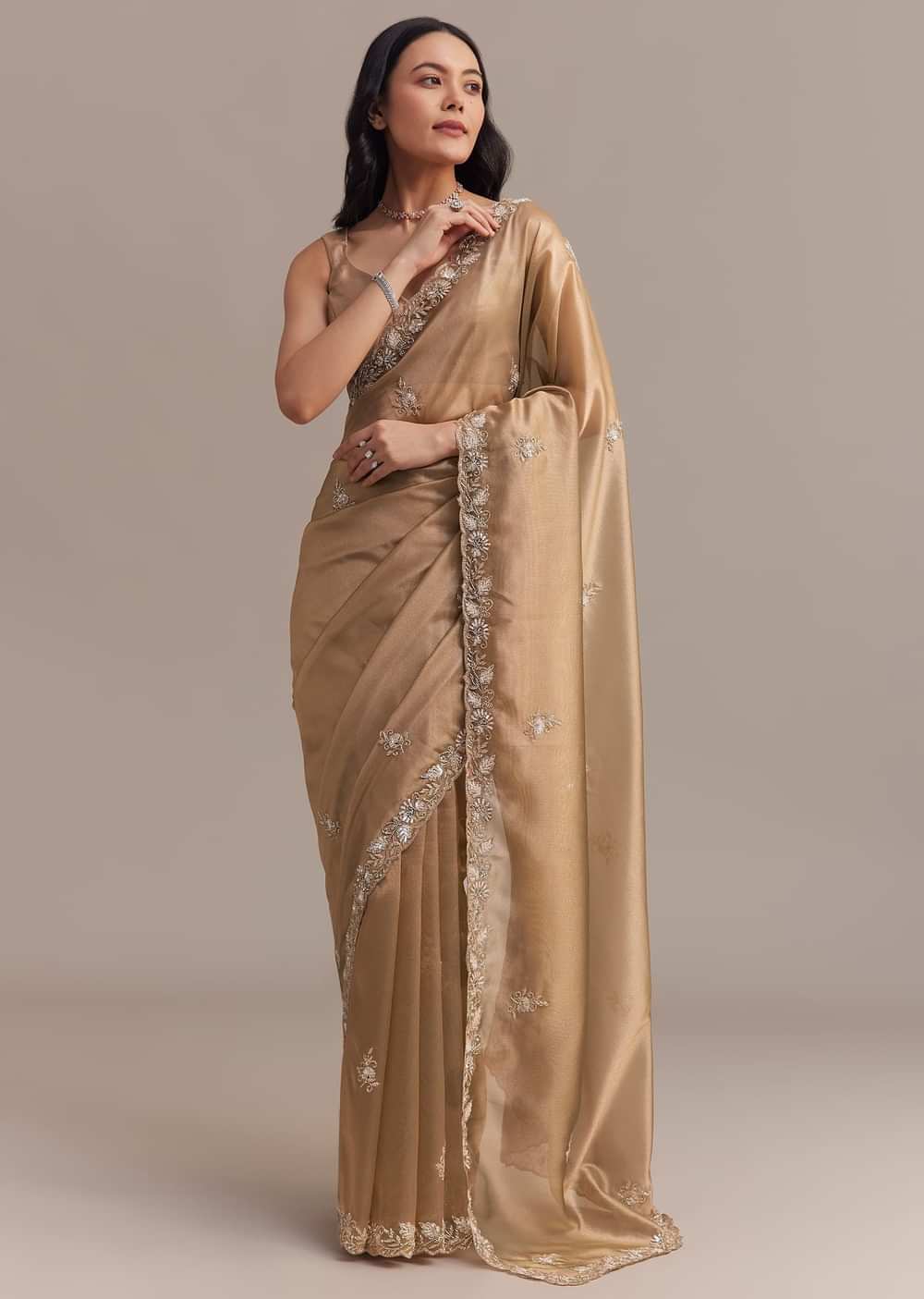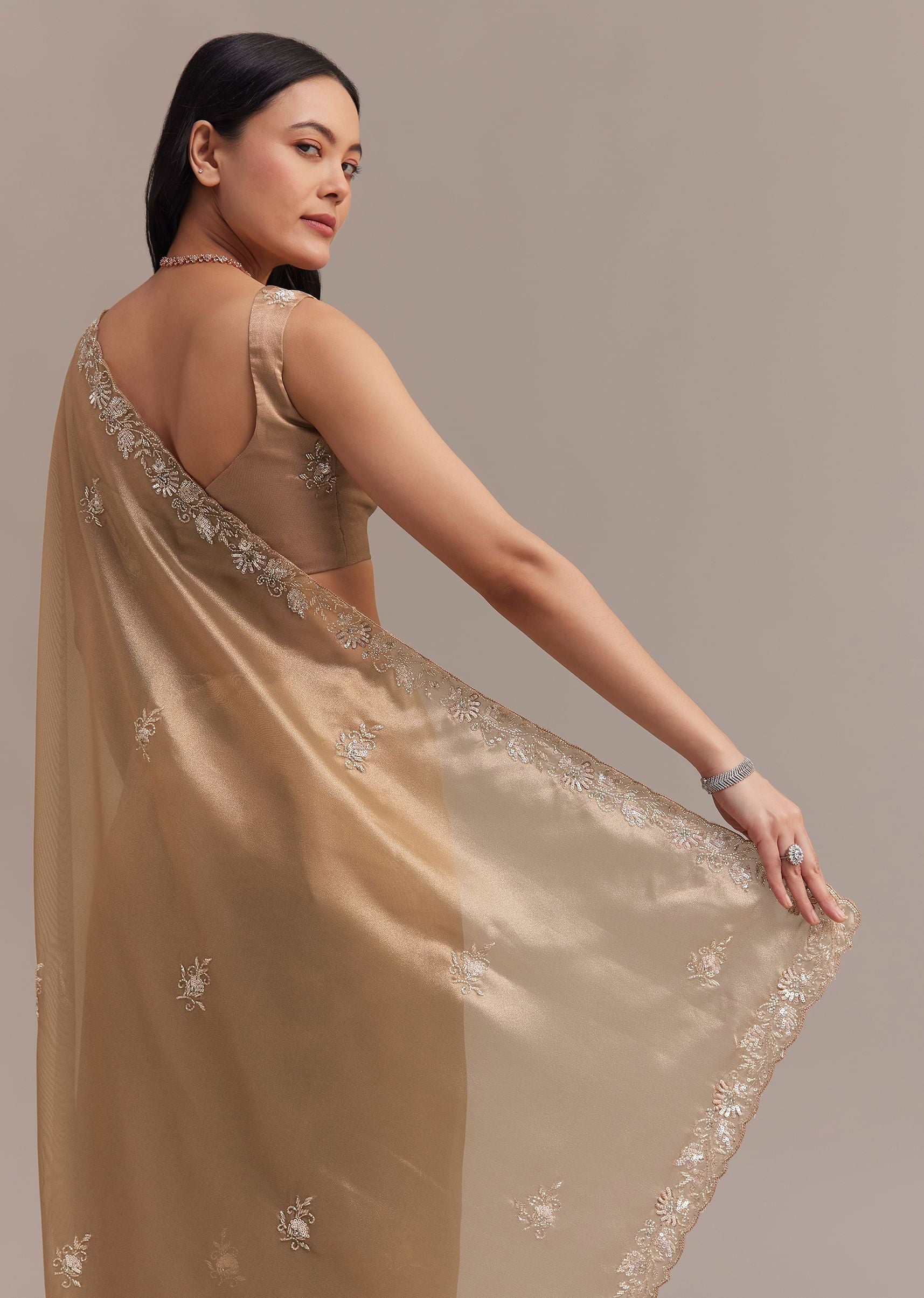 Metallic Gold Organza Tissue Saree With Cutdana And Bead Embroidery