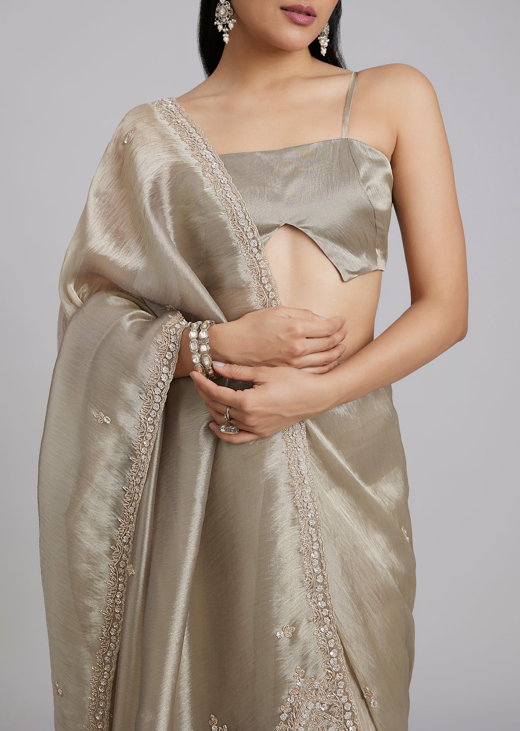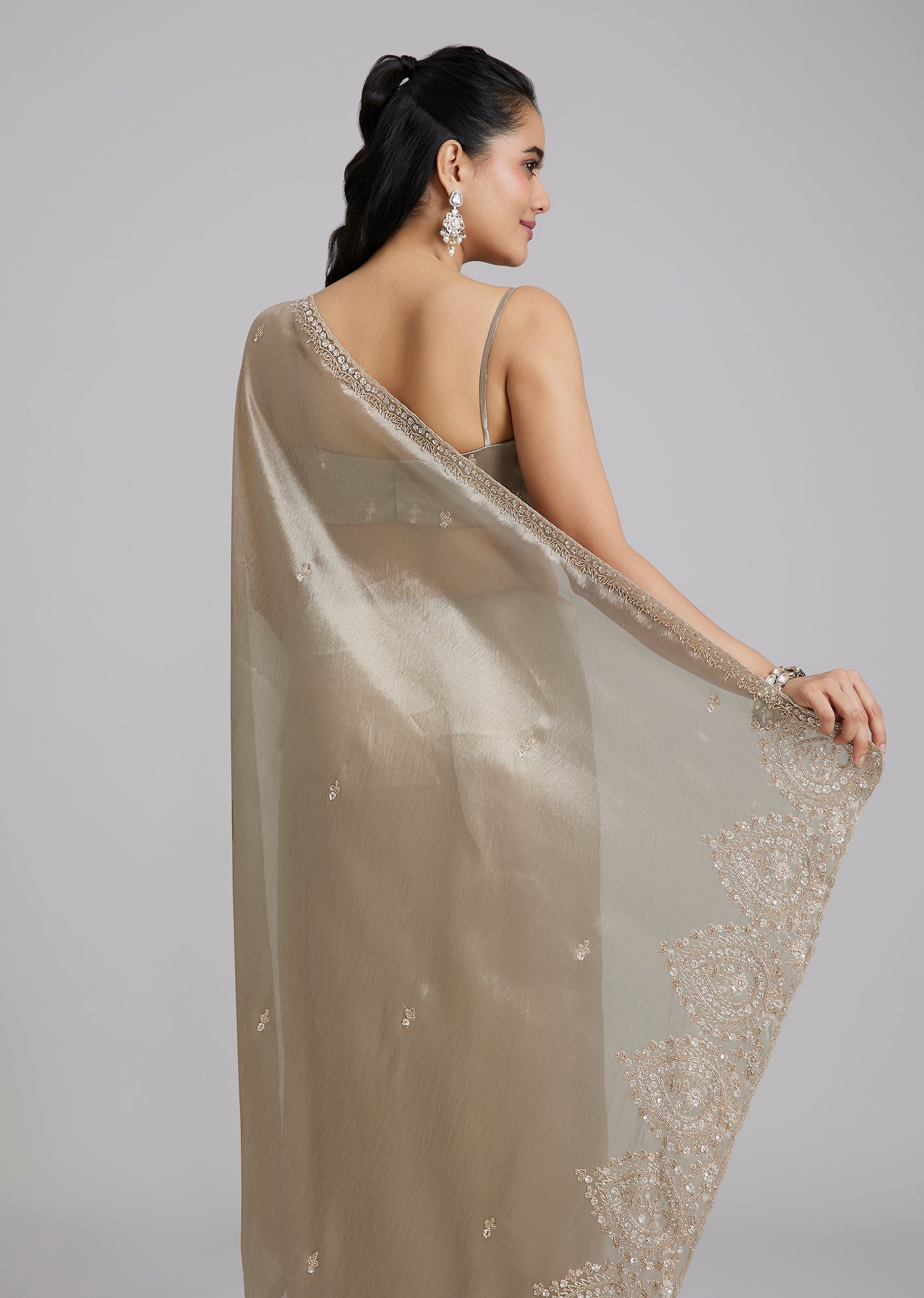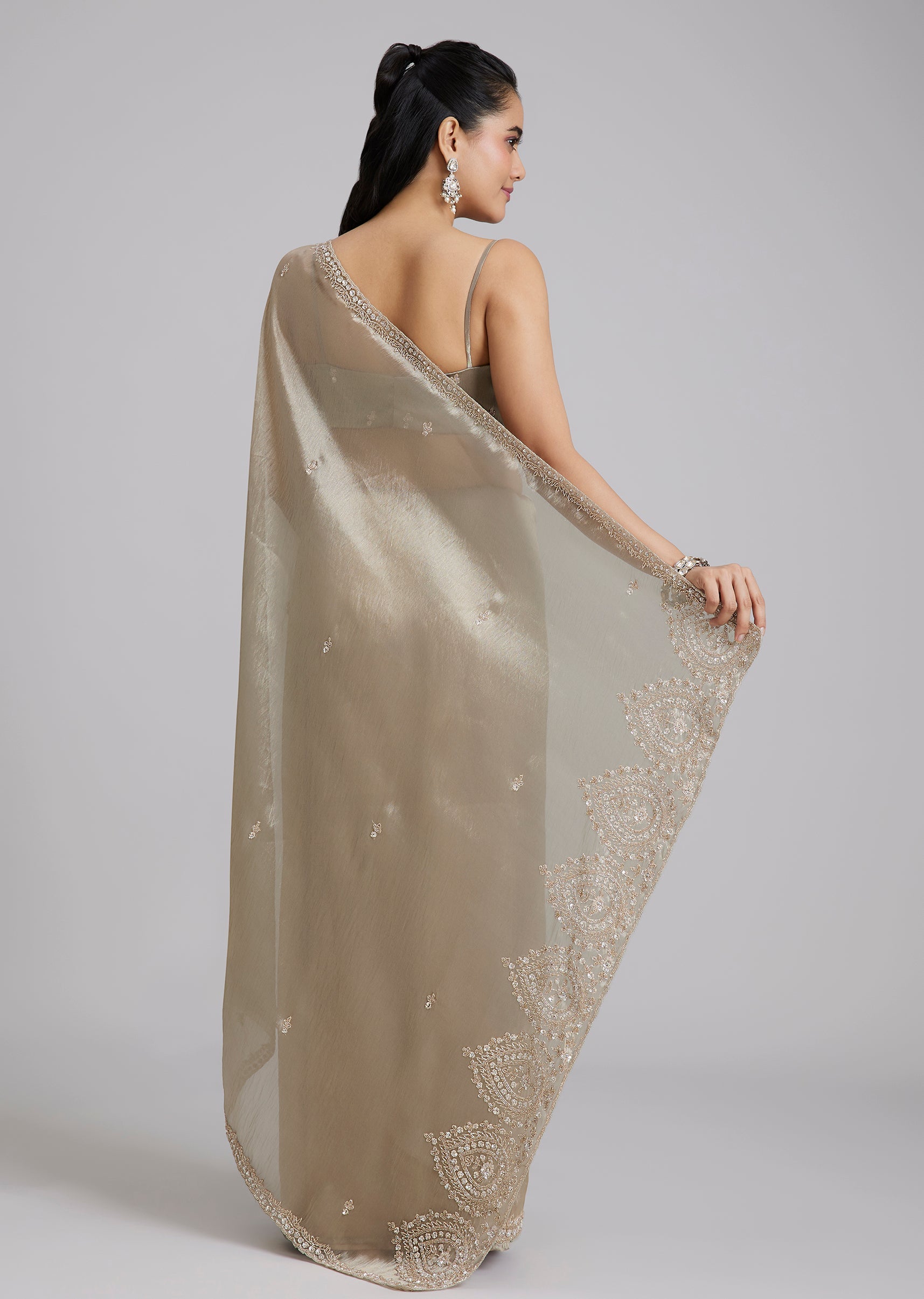 Metallic Grey Tissue Silk Saree With Minimal Butti Work And Heavy Pallu End Border