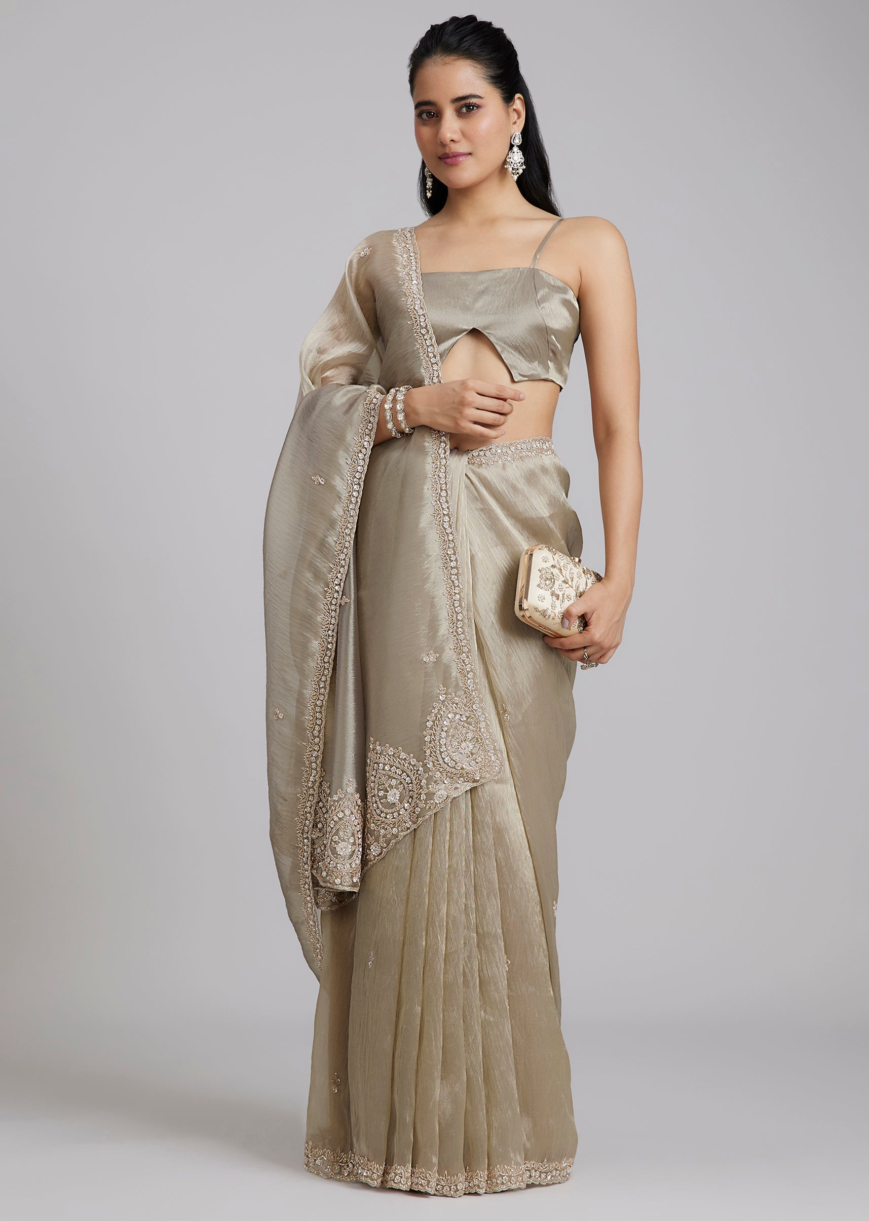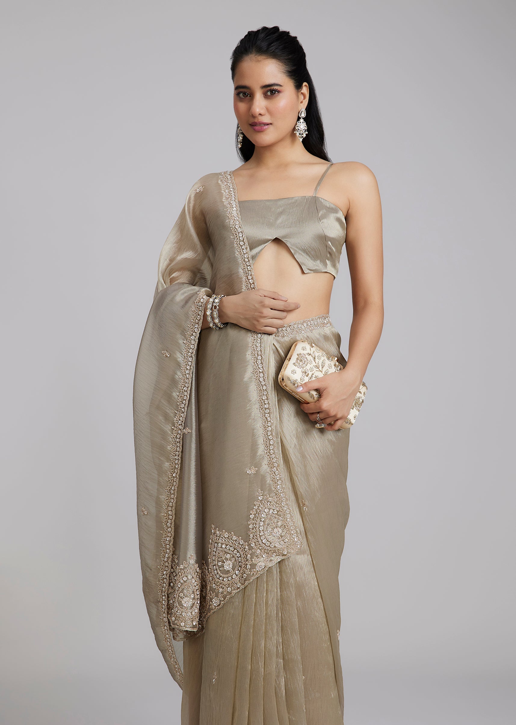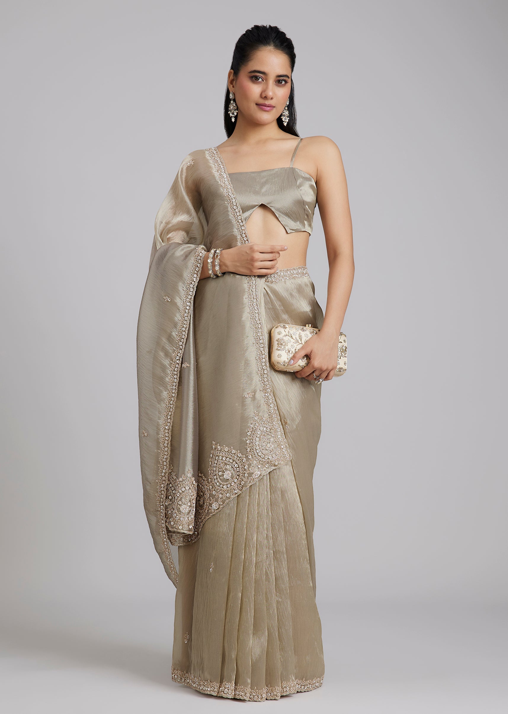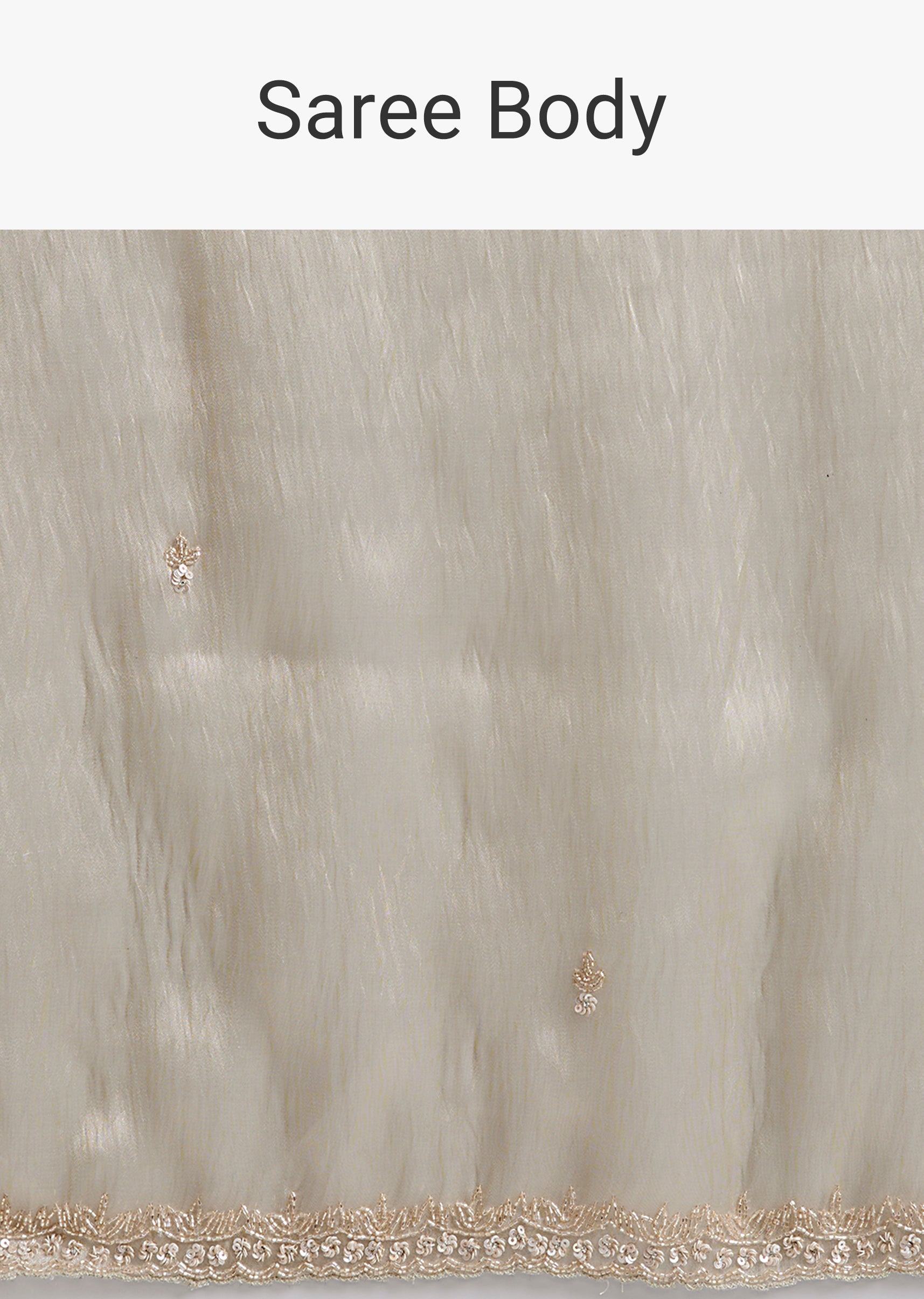 Metallic Grey Tissue Silk Saree With Minimal Butti Work And Heavy Pallu End Border
