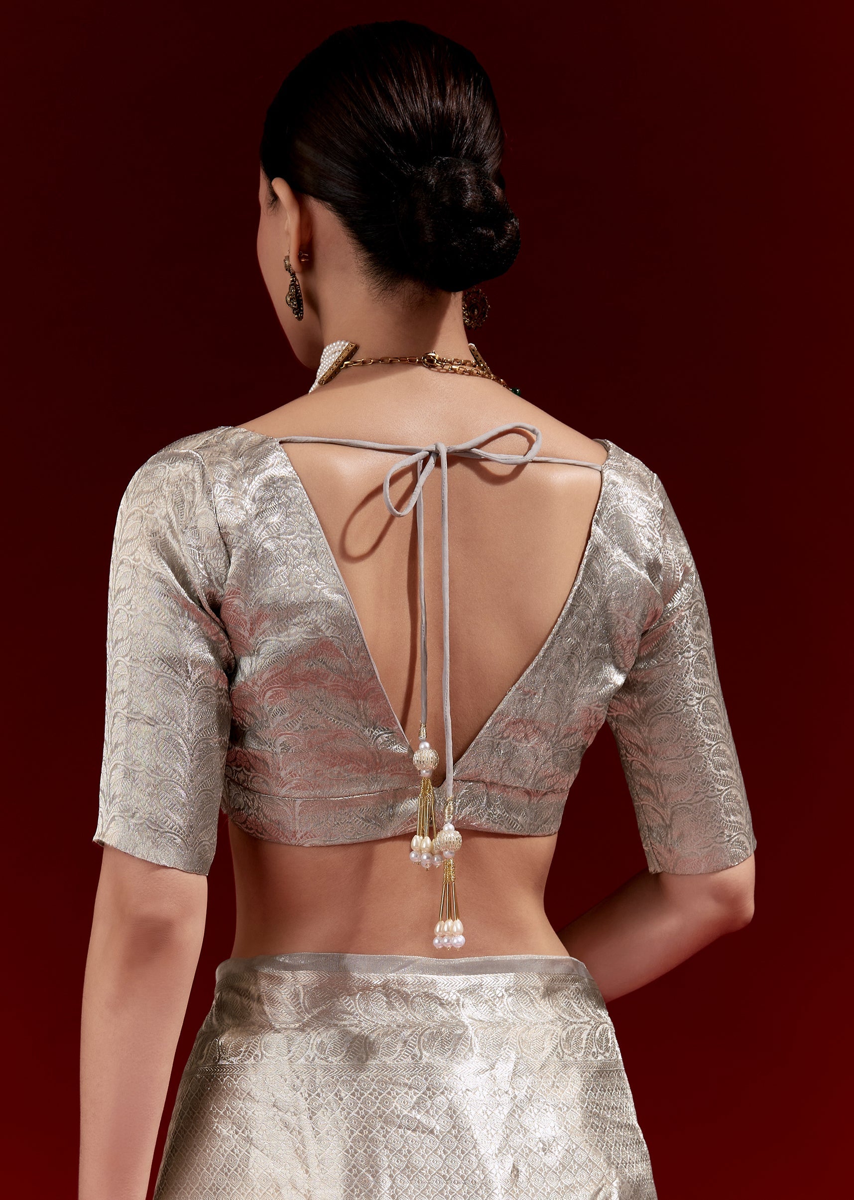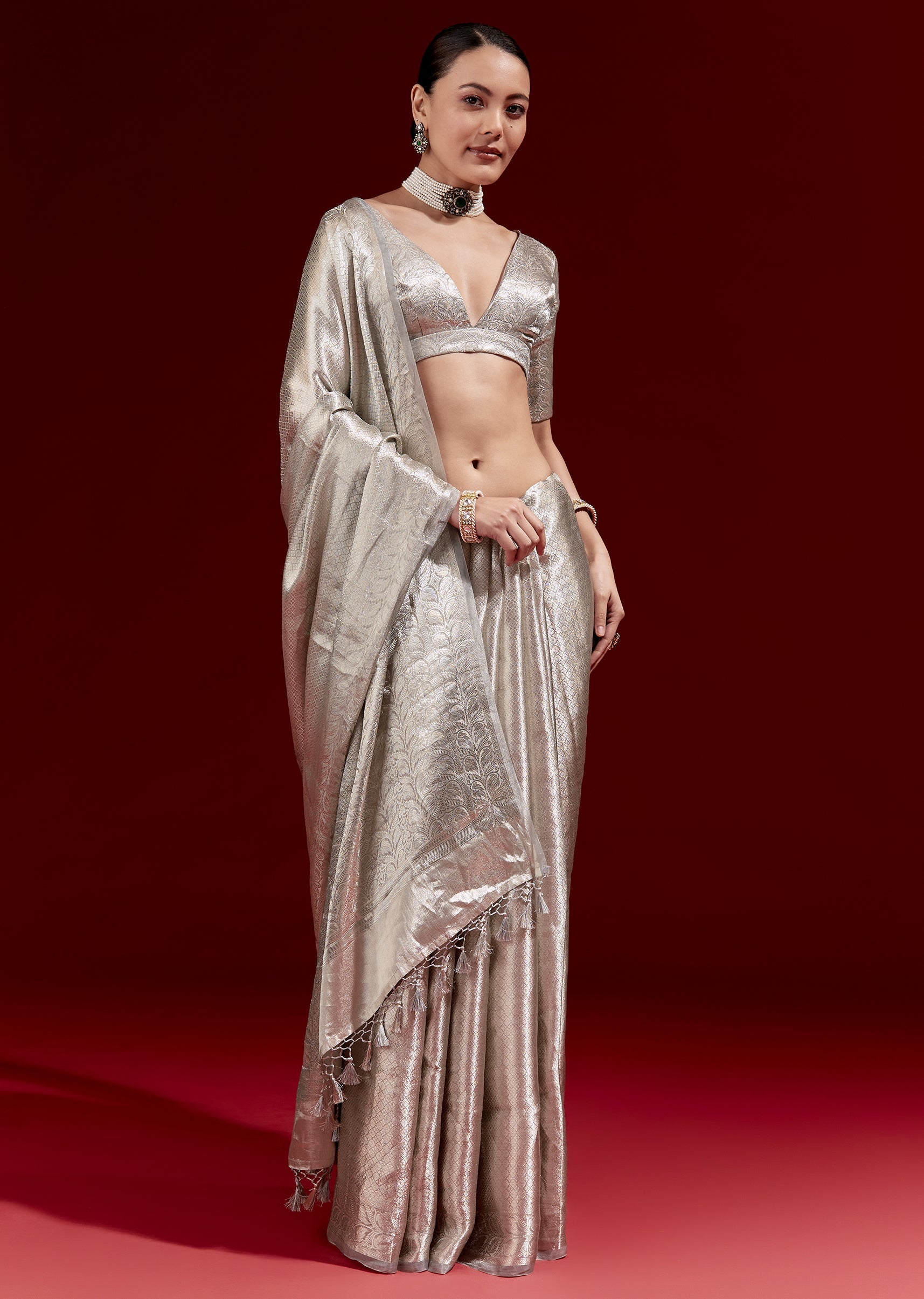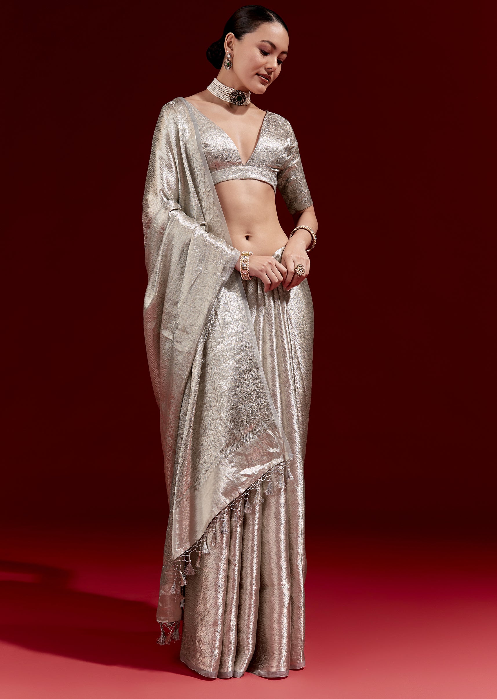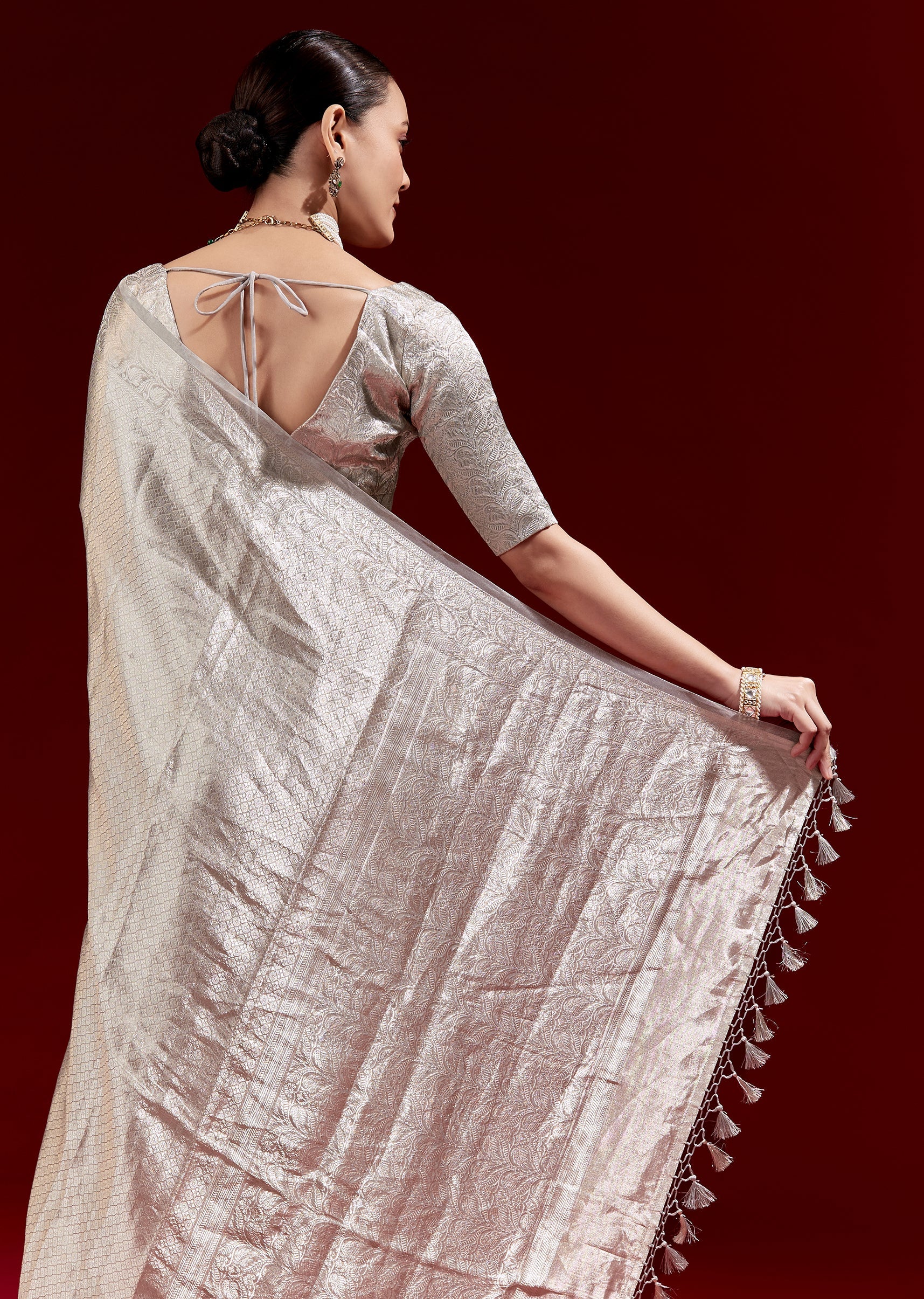 A metallic silver-grey Banarasi tissue saree woven in chanderi zari with a micro geometric texture all over. Finished with a floral woven border and paired with chanderi woven blouse fabric—perfect for festive and reception occasions. Awarded as the Most Trusted Brand, we're delivering styles you love, just as promised.