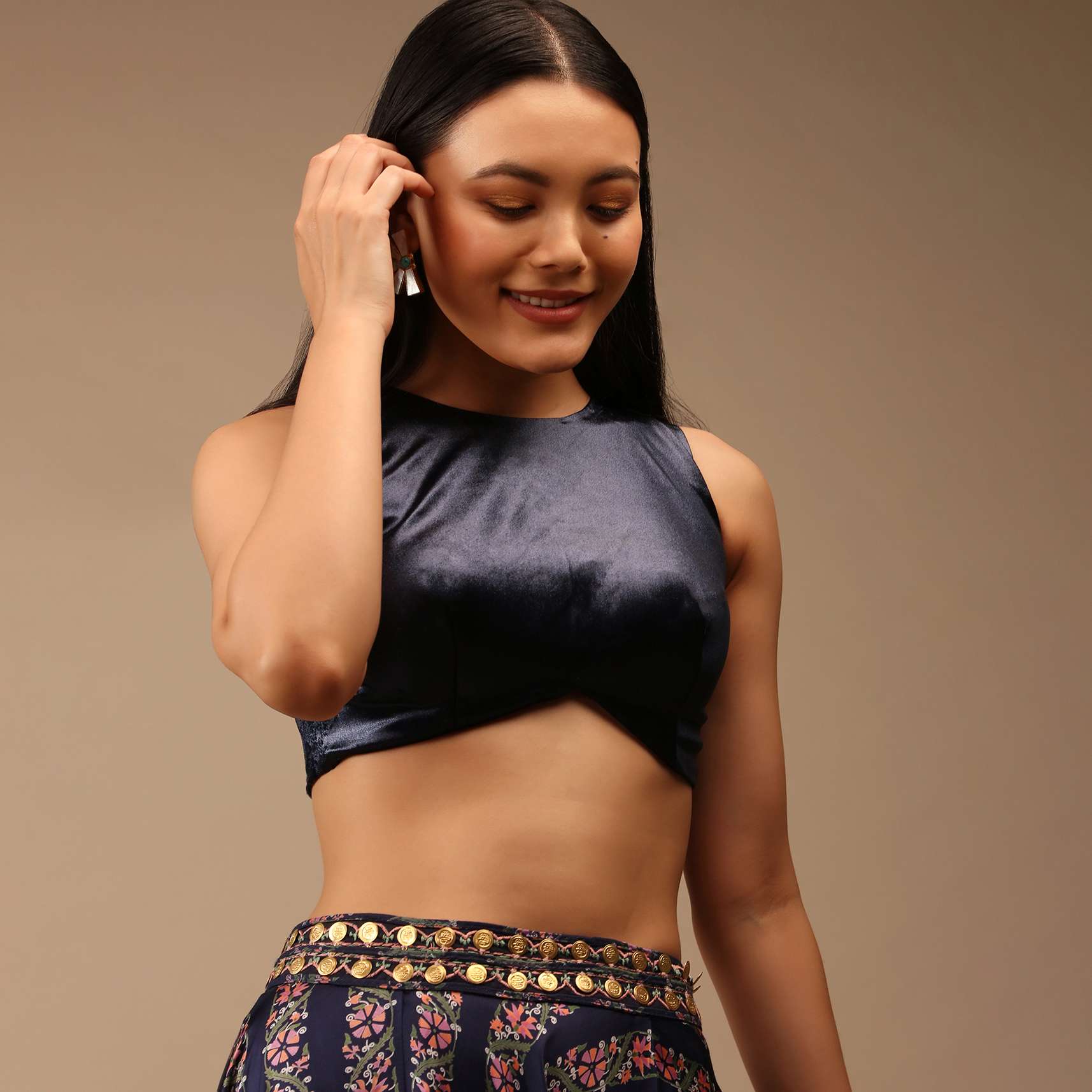 Midnight blue blouse in satin with curved hem and high round neckline, Crafted sleeveless with a back zip closure and padding. Awarded As The Most Trusted Brand We'Re Delivering Styles... More Product Details