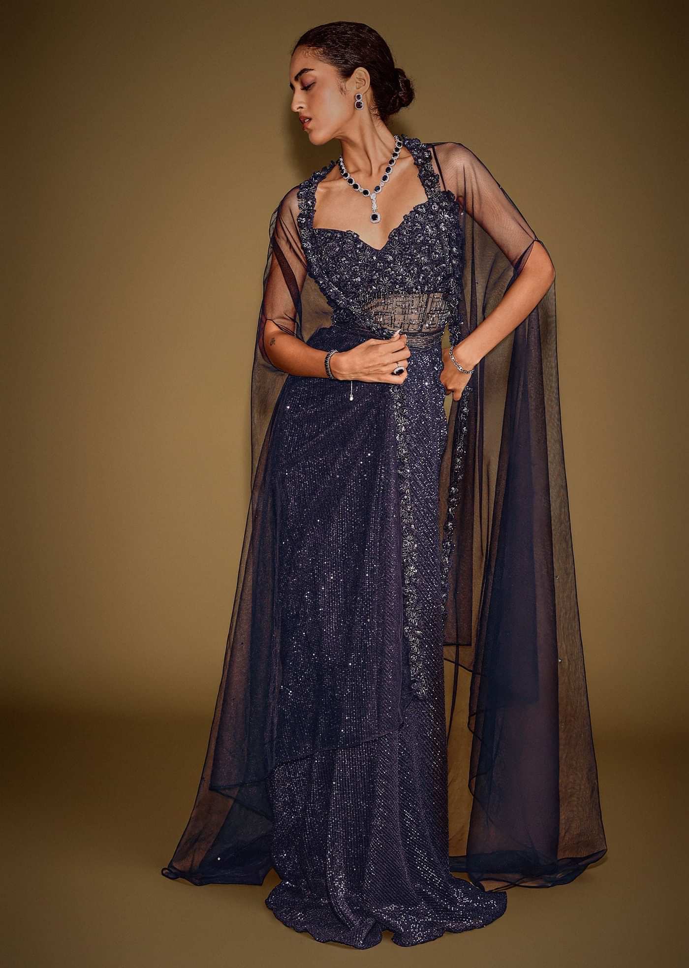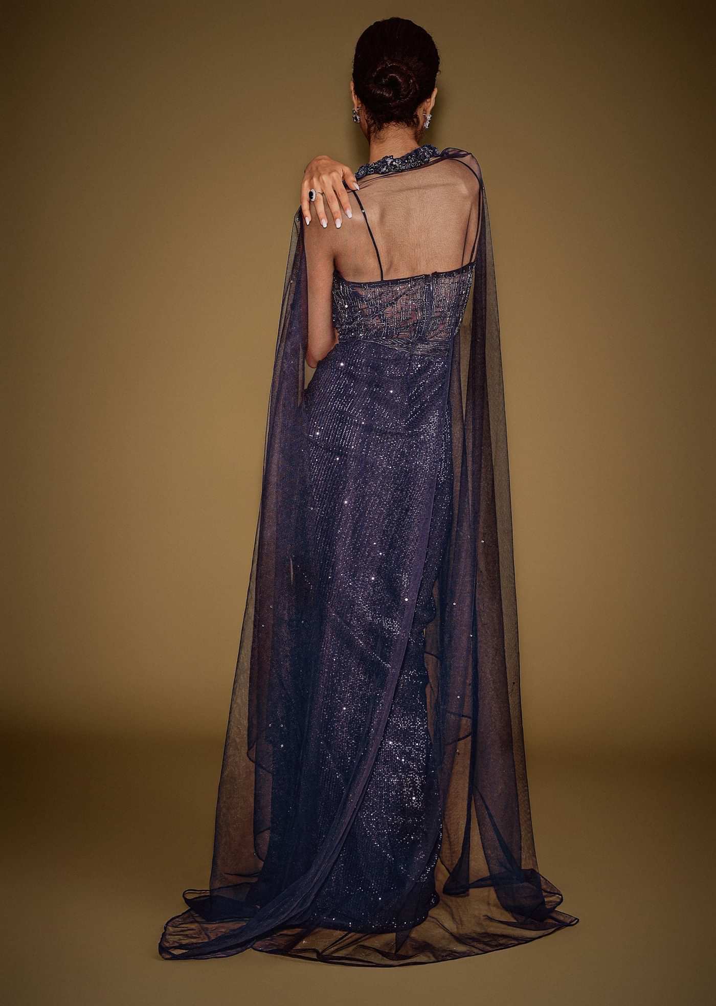 Midnight Blue Corset Gown With Drape And Embroidered Cape