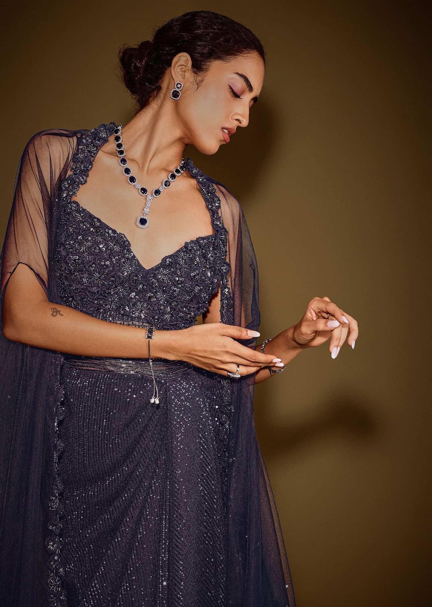 This striking midnight blue corset gown is crafted in luxe fabric and features an elegant draped silhouette. Paired with a delicately embroidered sheer cape, it exudes celestial glamour. Embellished with... More Product Details