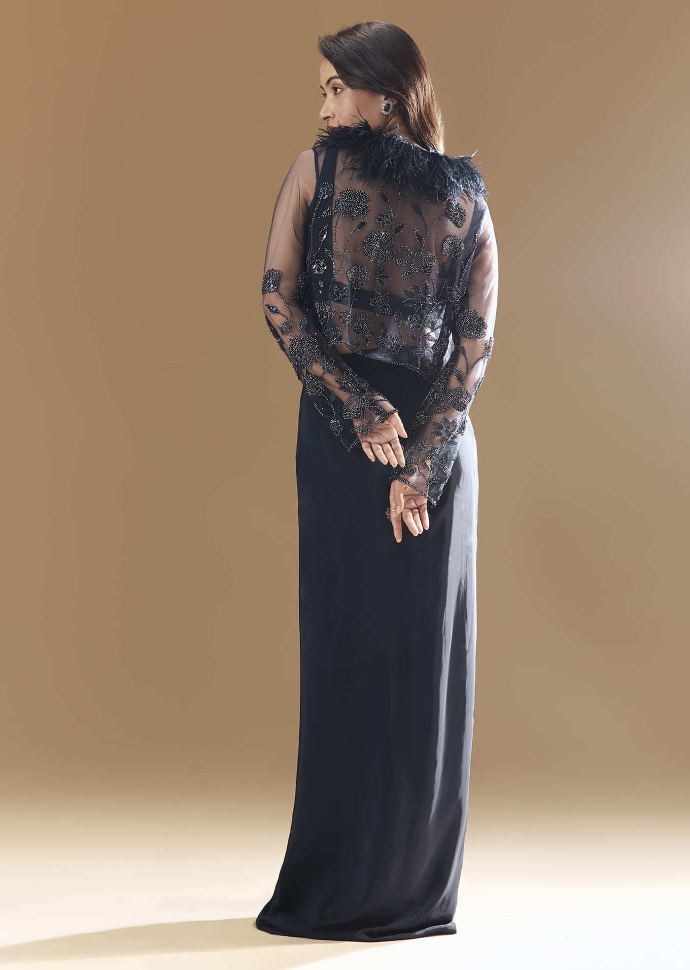 Midnight Blue Feather Embellished Crop Top Skirt Set with Jacket