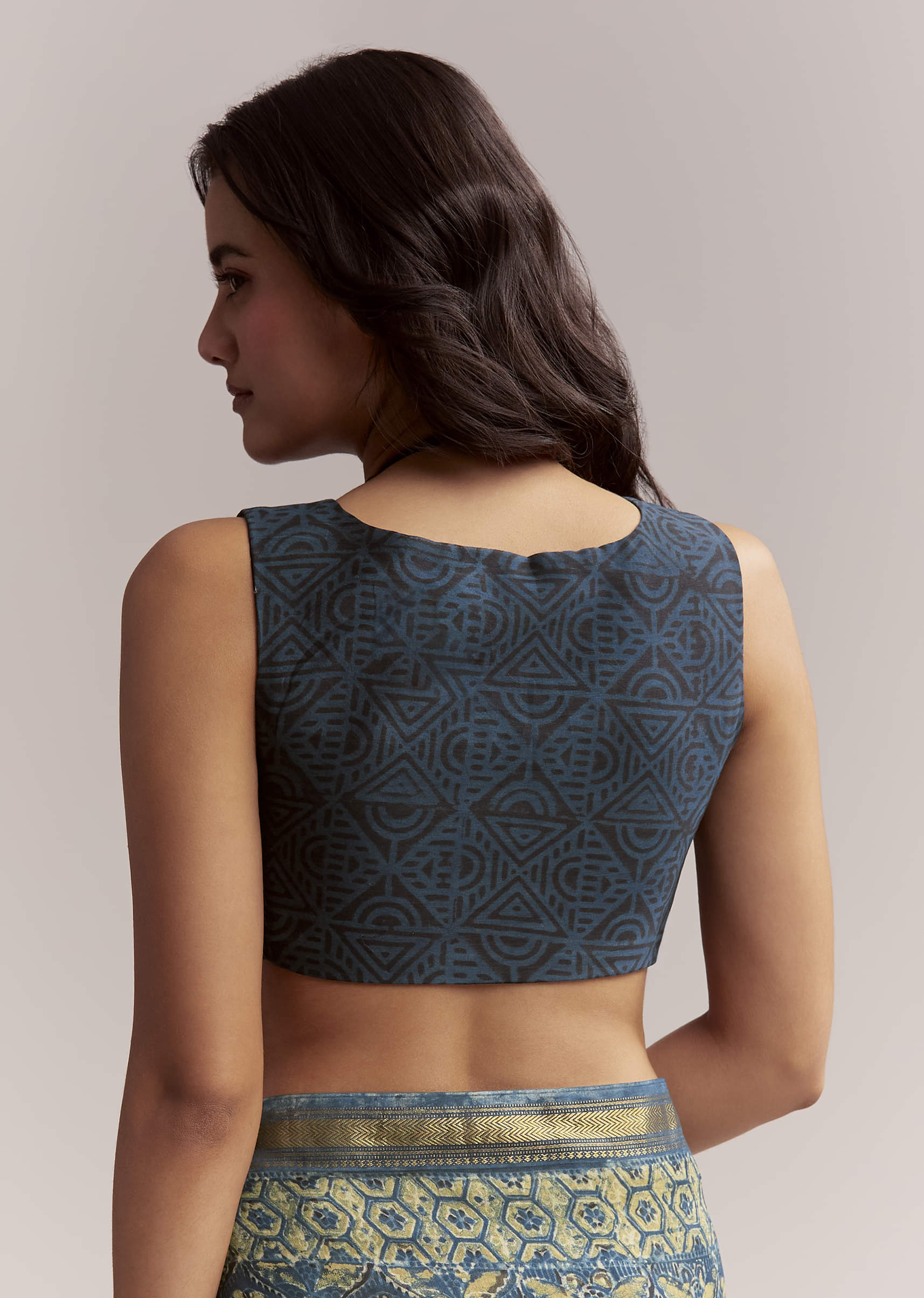 Drape the pallu in a sharp pleated style to frame the Ajrakh motifs against the rich blue tone. Complete with kolhapuri chappals, kohl-rimmed eyes and antique silver earrings.