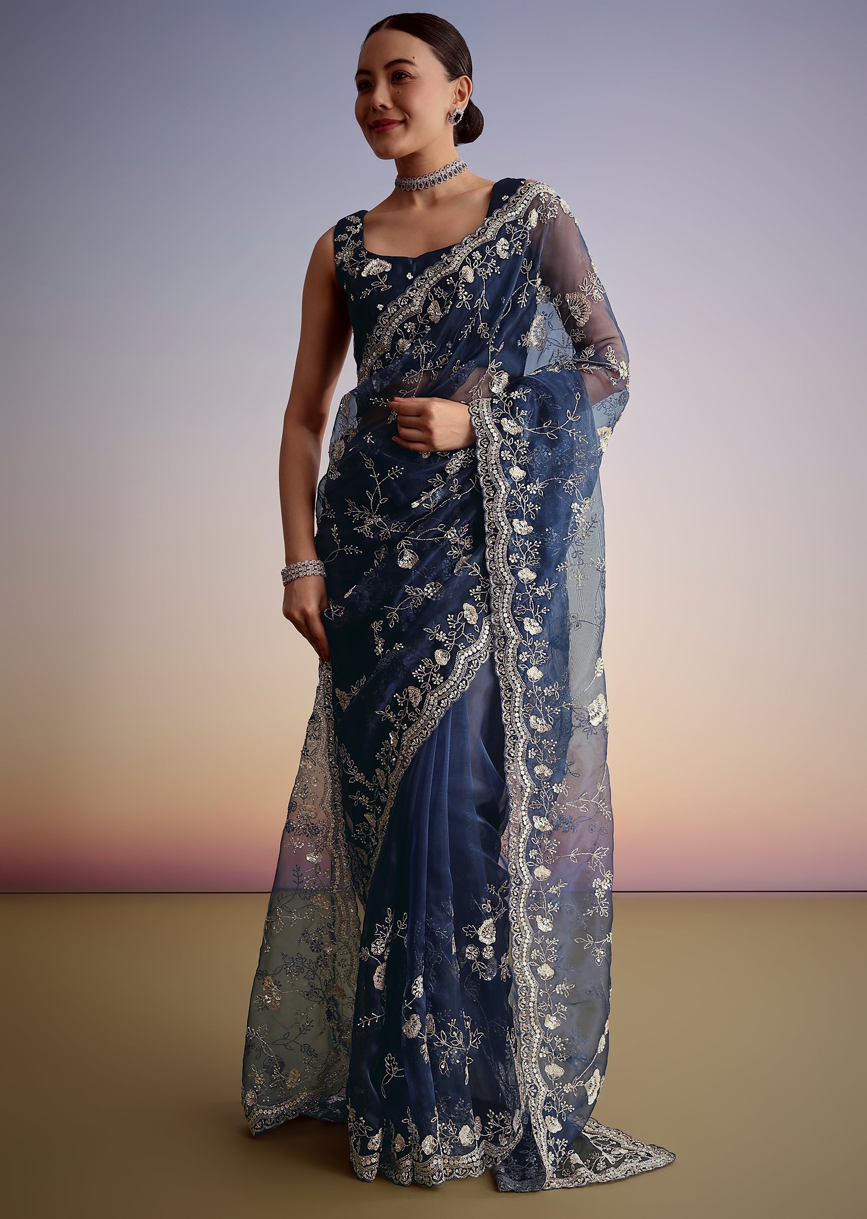 A midnight blue tissue saree with floral embroidery and a scallop border. Embellished with cutdana, sequins, and beads. Comes with a richly adorned blouse. Elegant choice for evening weddings and receptions. Awarded as the Most Trusted Brand, we're delivering styles you love, just as promised.