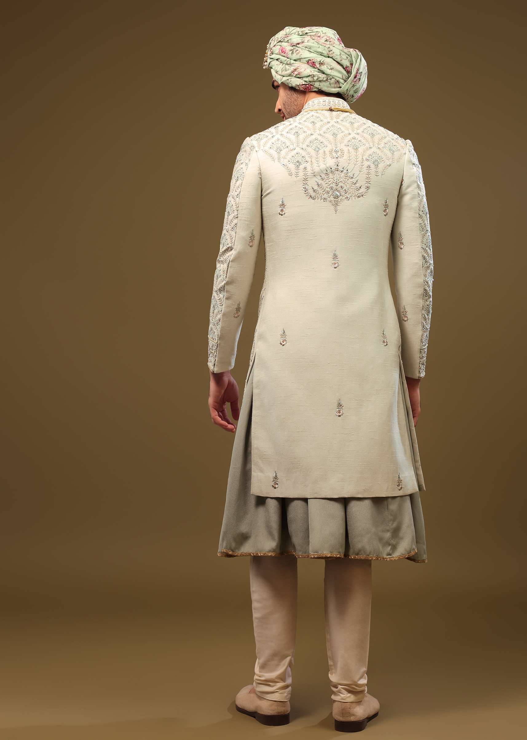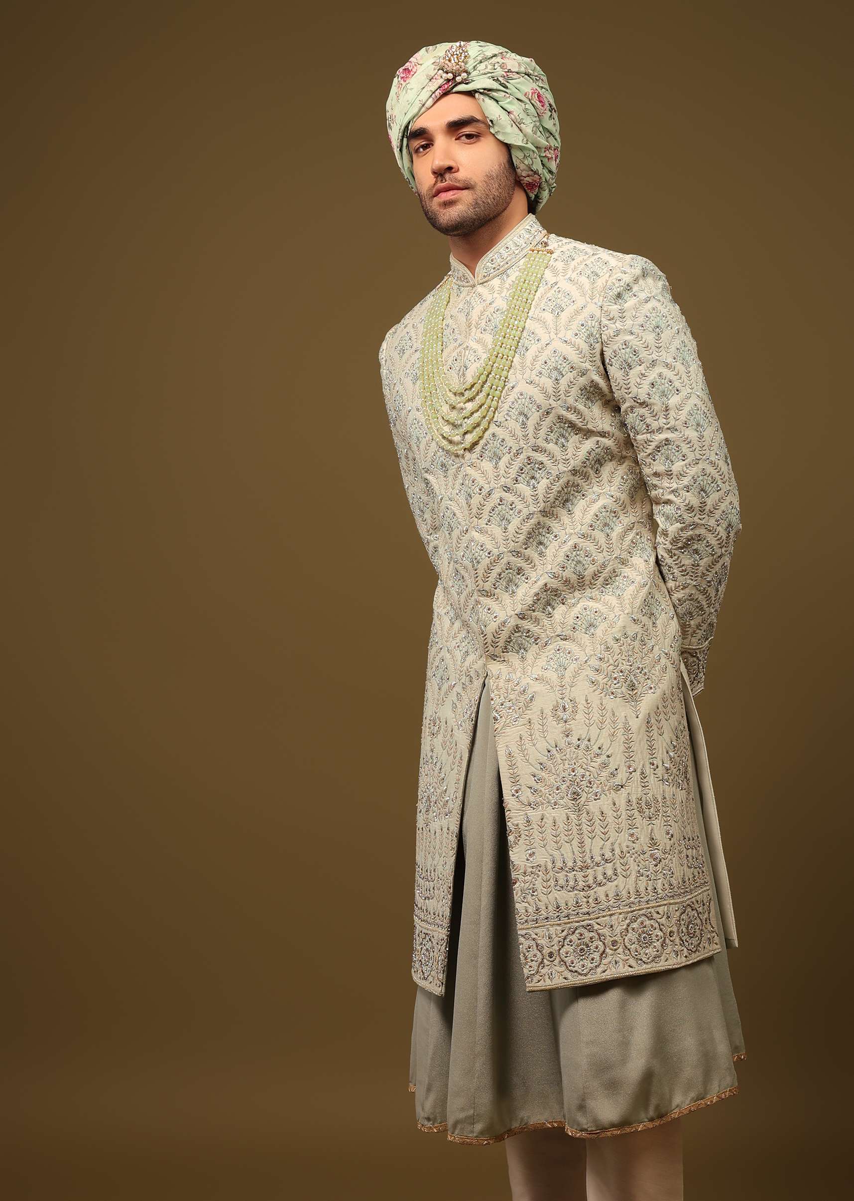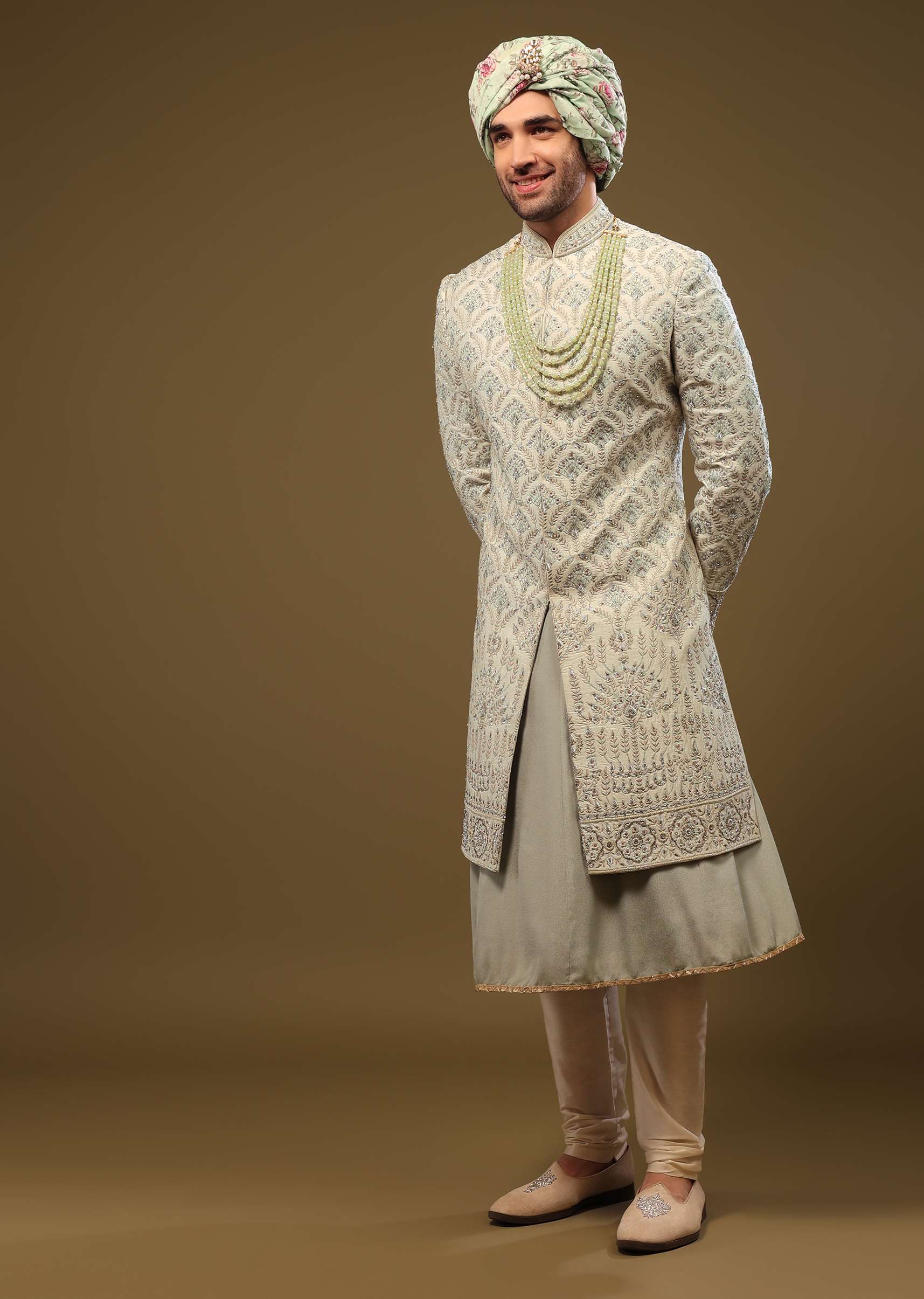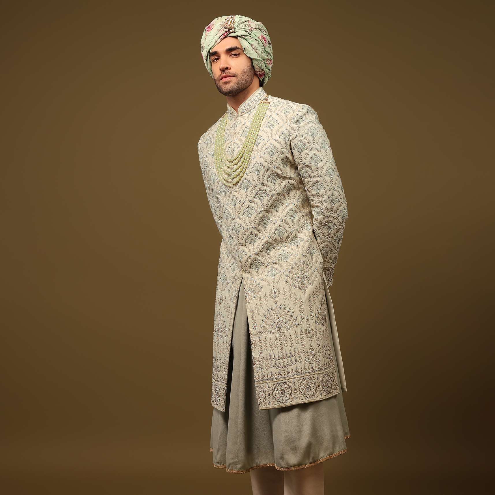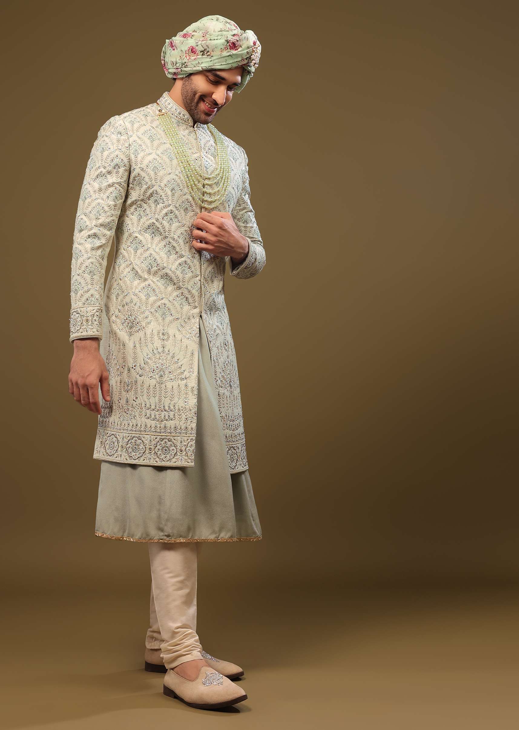 An elegant milky green sherwani set fabricated in silk, crafted in cut-dana, beads, sali, and thread embroidery.It has full sleeves and a mandarin collar with a front closure, and comes... More Product Details