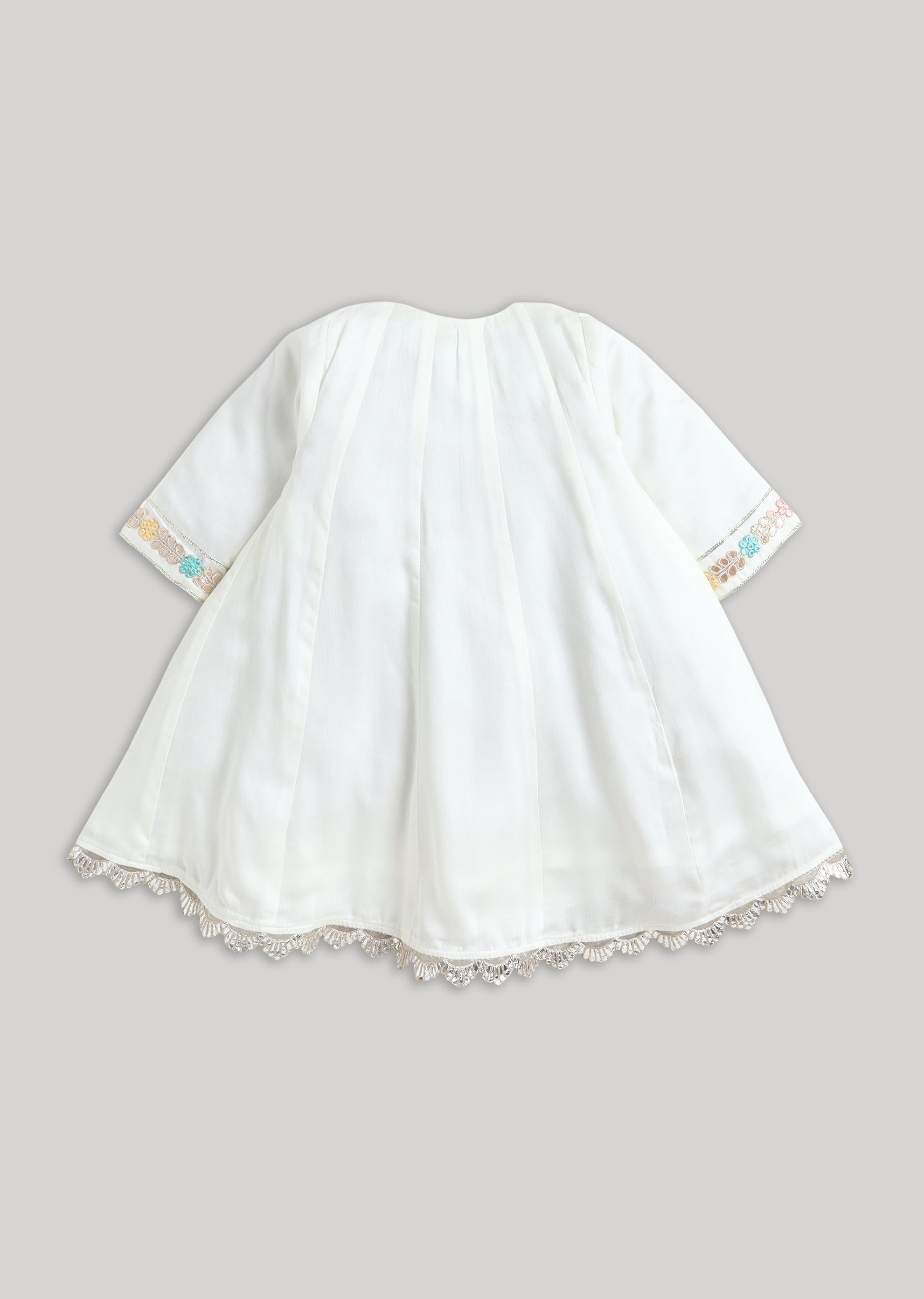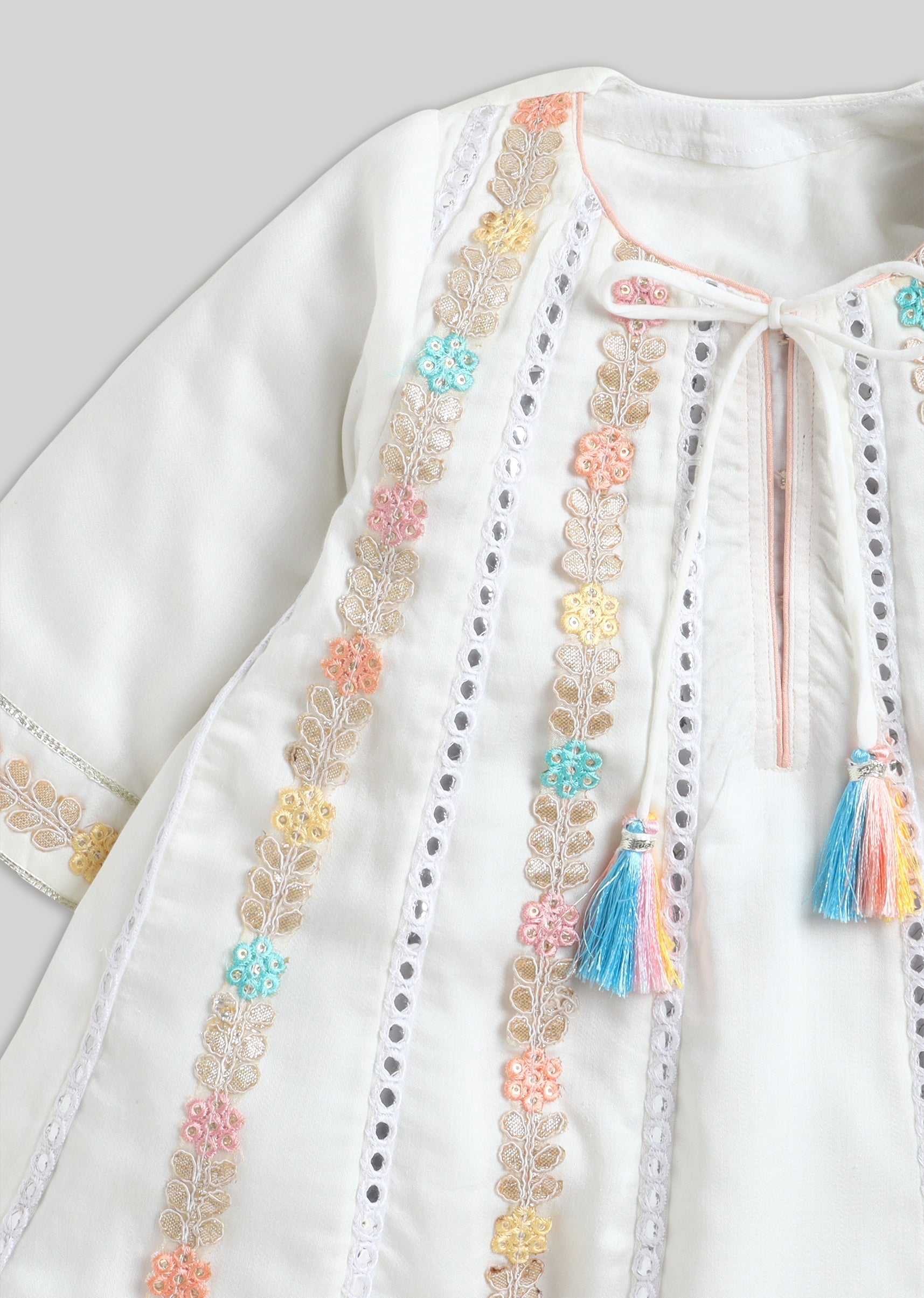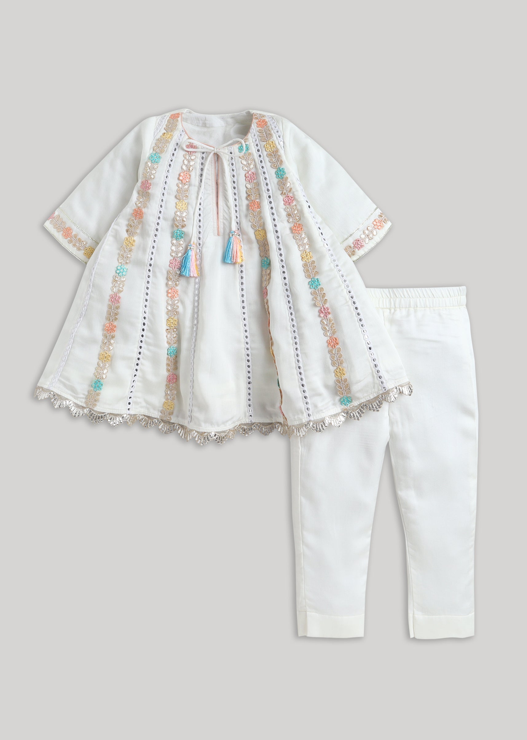 This salwar kameez set is a clean, minimal festive option with an off-white base and multicolour detailing. Crafted in muslin, it’s light, breathable, and very comfortable for kids during long... More Product Details