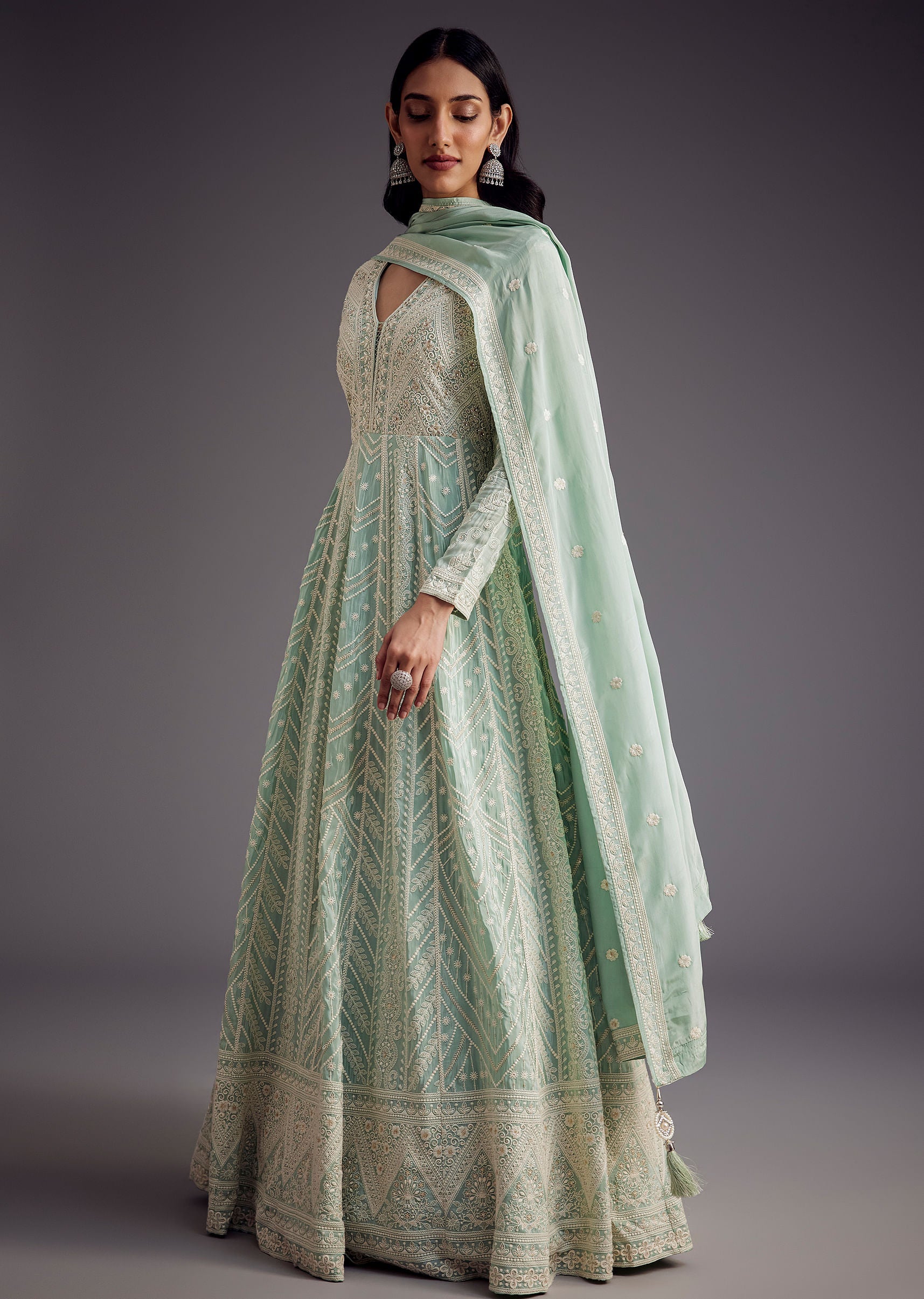 Mint Blue Lucknowi work Anarkali With Matching Dupatta