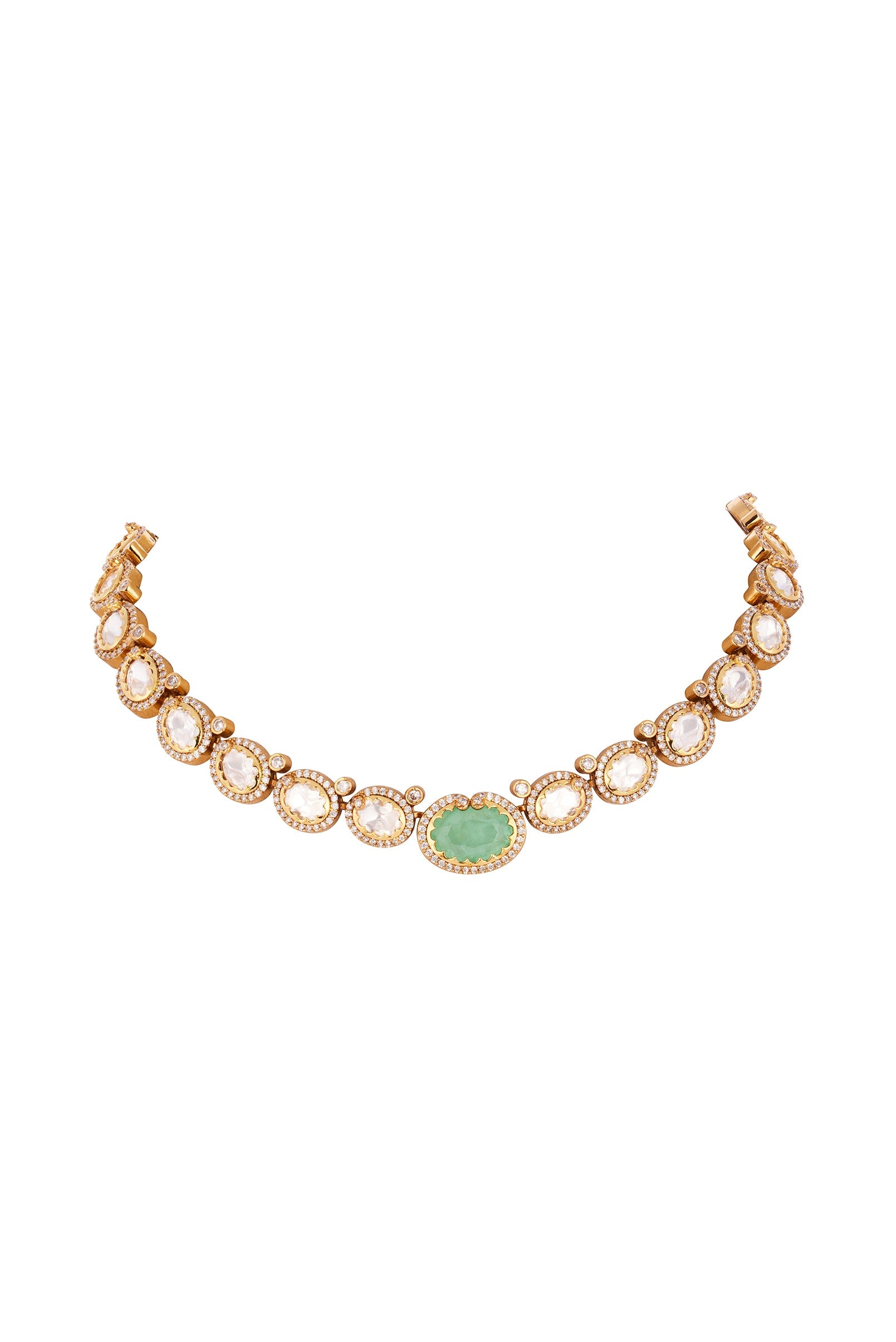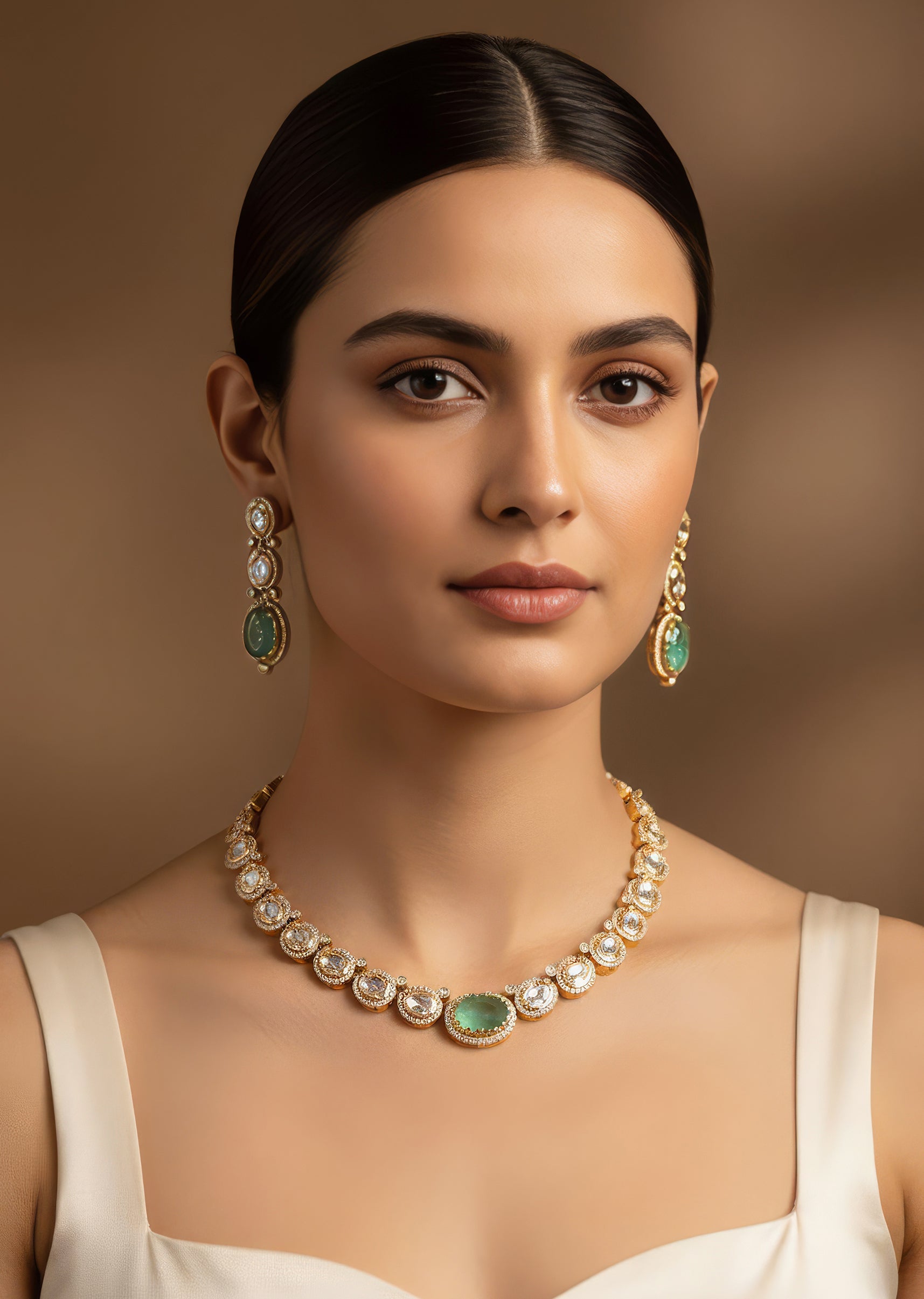 A refined Polki necklace set crafted using the traditional Kundan Jadau technique and highlighted with semi precious emerald accents. The handcrafted design is finished with intricate detailing that brings together classic artistry and festive elegance.