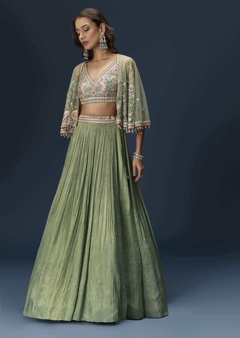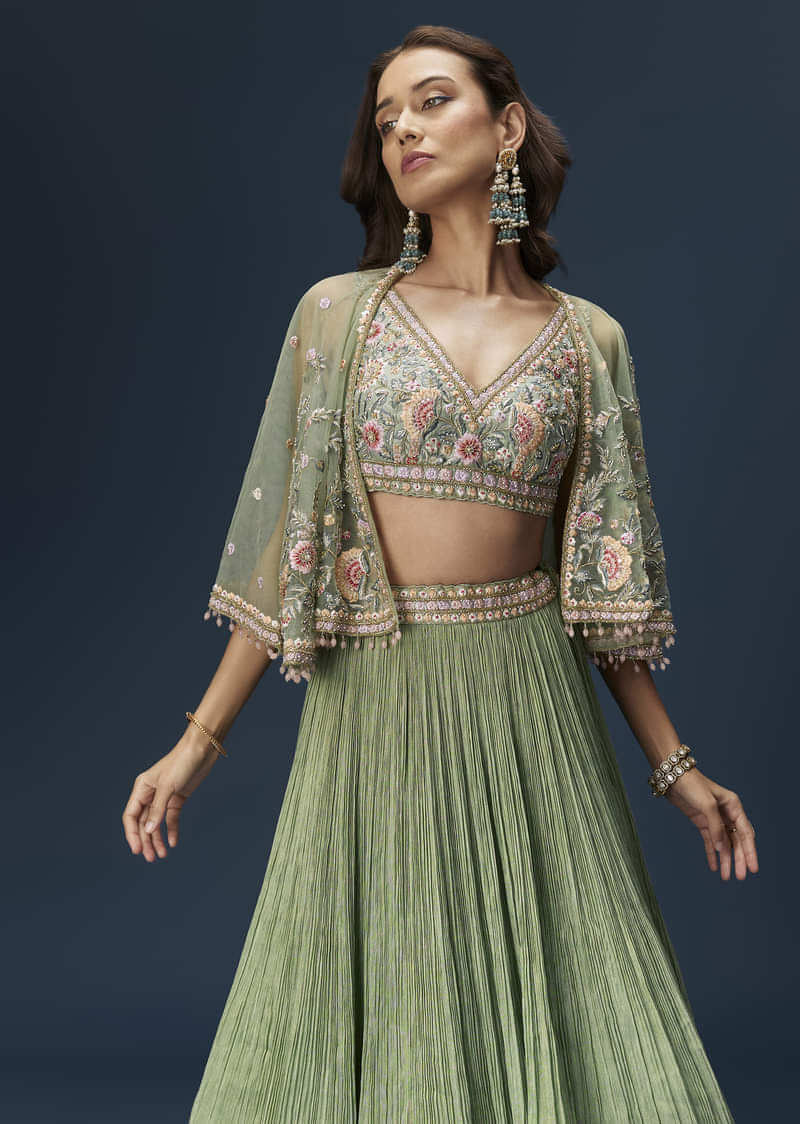 This pastel green lehenga features a V-neck blouse adorned with stone and threadwork, paired with a sheer embroidered cape for a fresh Indo-western spin. Elegant and fun, it's a perfect... More Product Details
