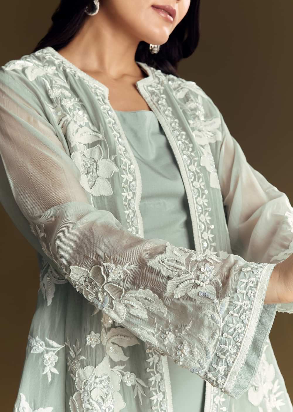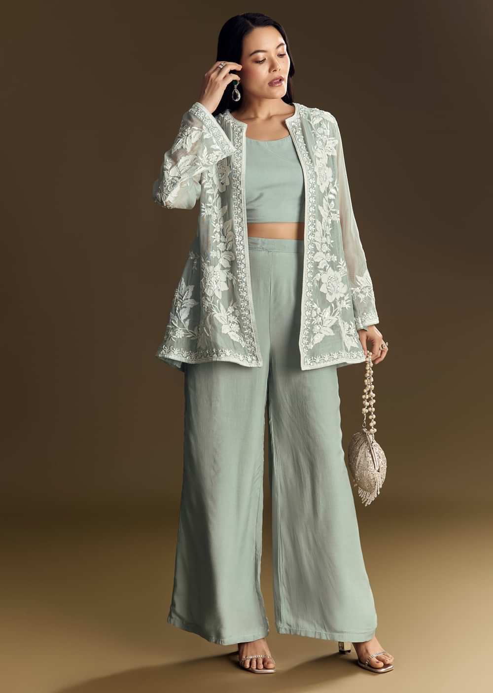 Mint Green Crop Top Set With Embroidered Organza Jacket