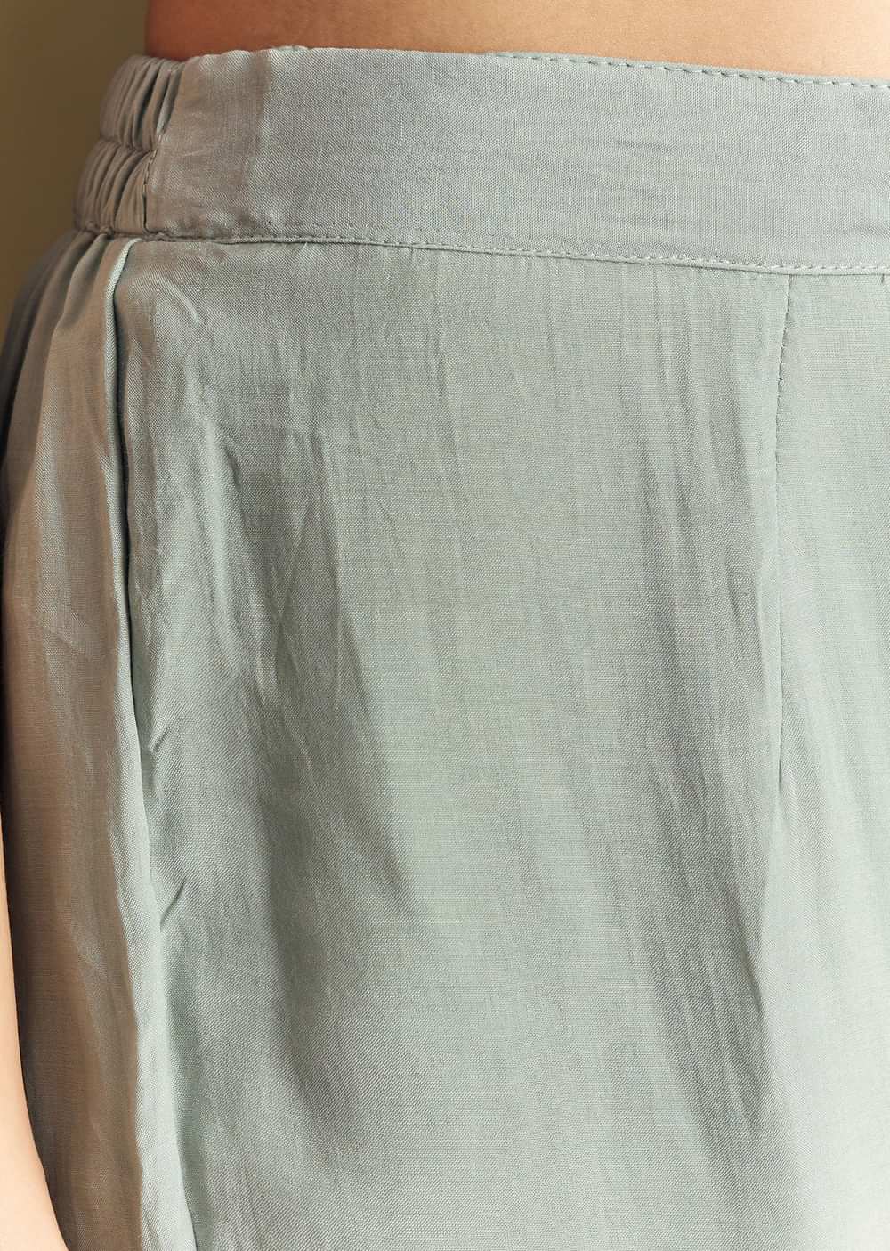 Pastel mint cotton-silk crop top with a round neckline, paired with an organza jacket adorned in resham and sequin embroidery. Flared sleeves add playful volume???perfect for cocktail or sangeet events. Awarded as the Most Trusted Brand, we're delivering styles you love, just as promised.
