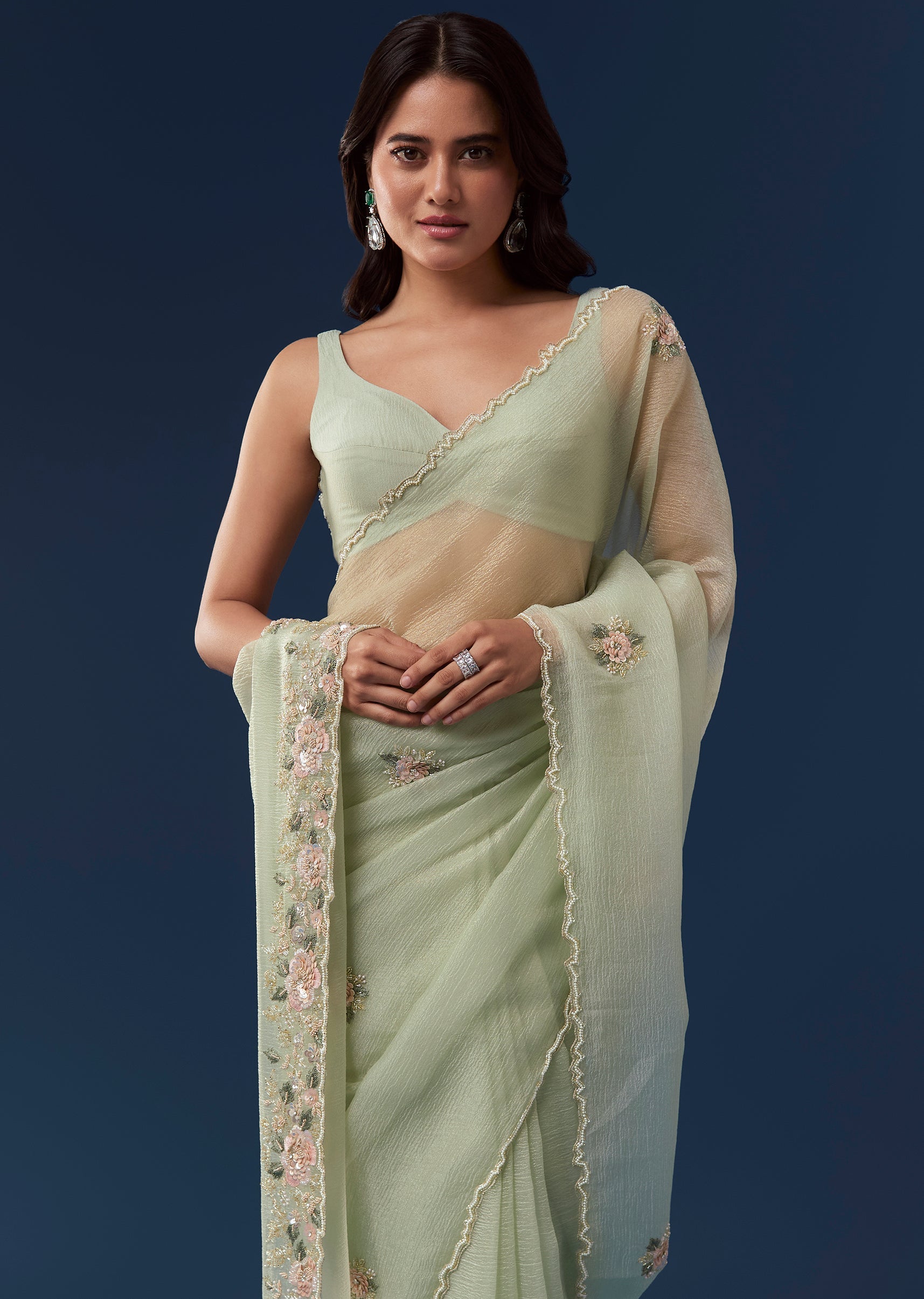 Mint Green Crush Tissue Saree With Cutwork Floral Border And Butti Embroidery