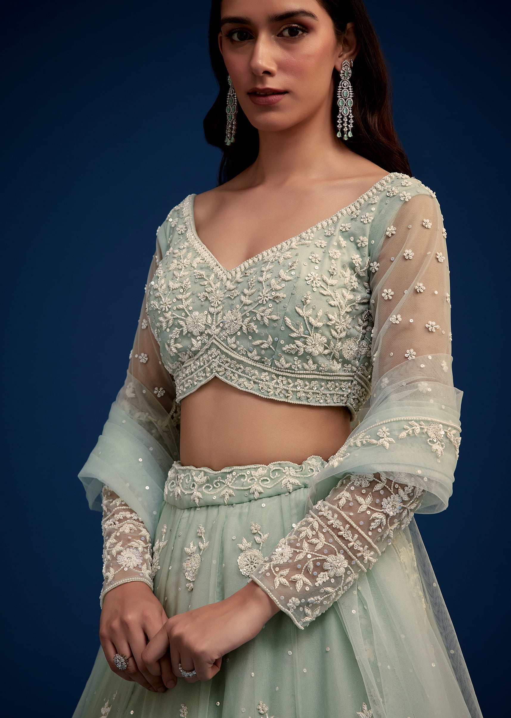 Exude Dreamy Elegance In This Mint Green Lehenga Choli Set Adorned With Intricate Embroidery And Delicate Sequin Work. The Soft Pastel Hue And Sheer Dupatta Make It A Perfect Choice... More Product Details