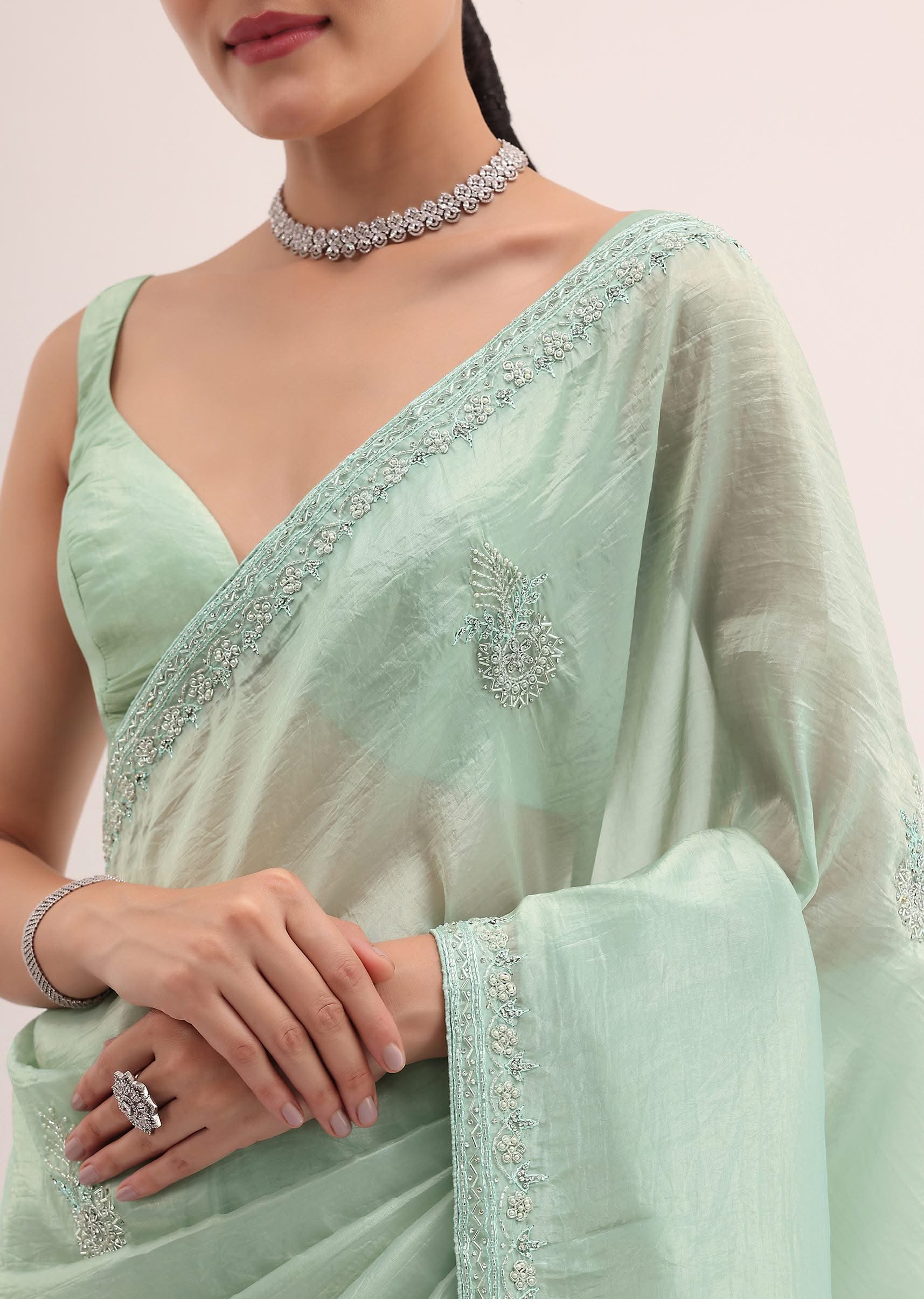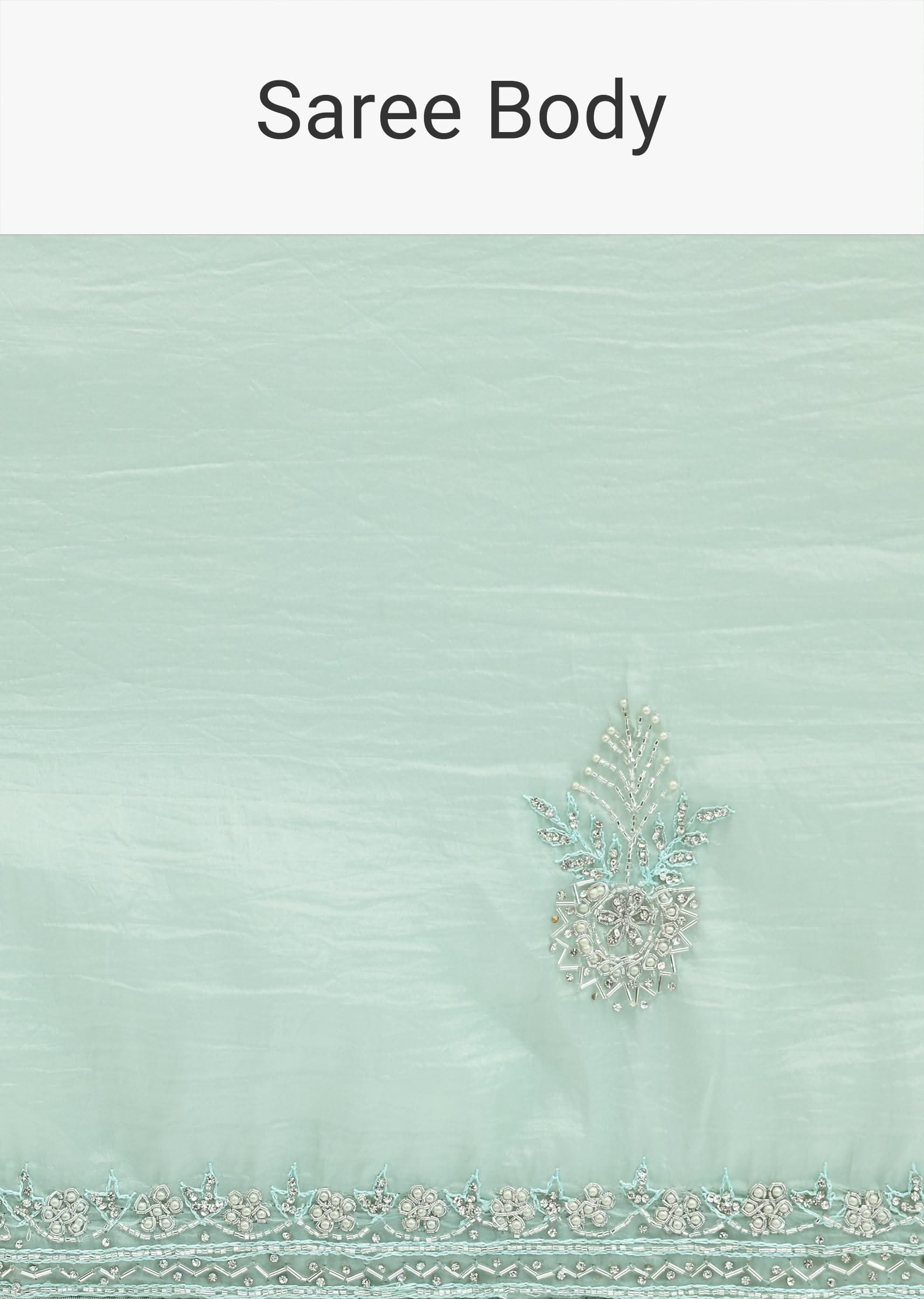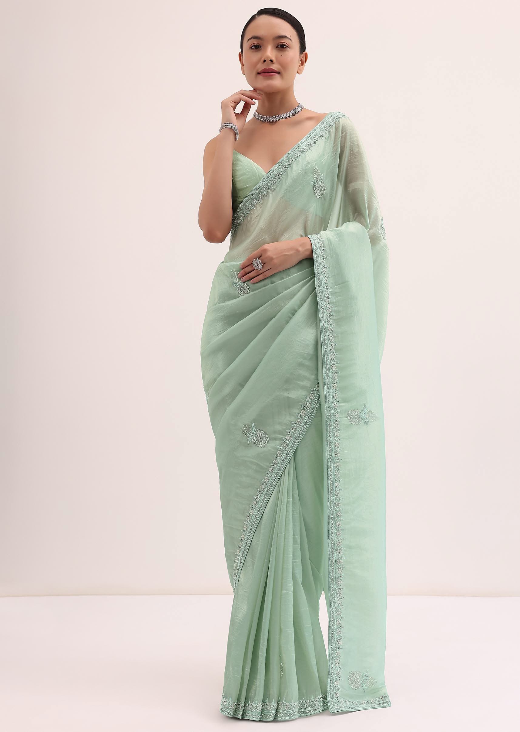 - Presenting a mint green embroidered saree.