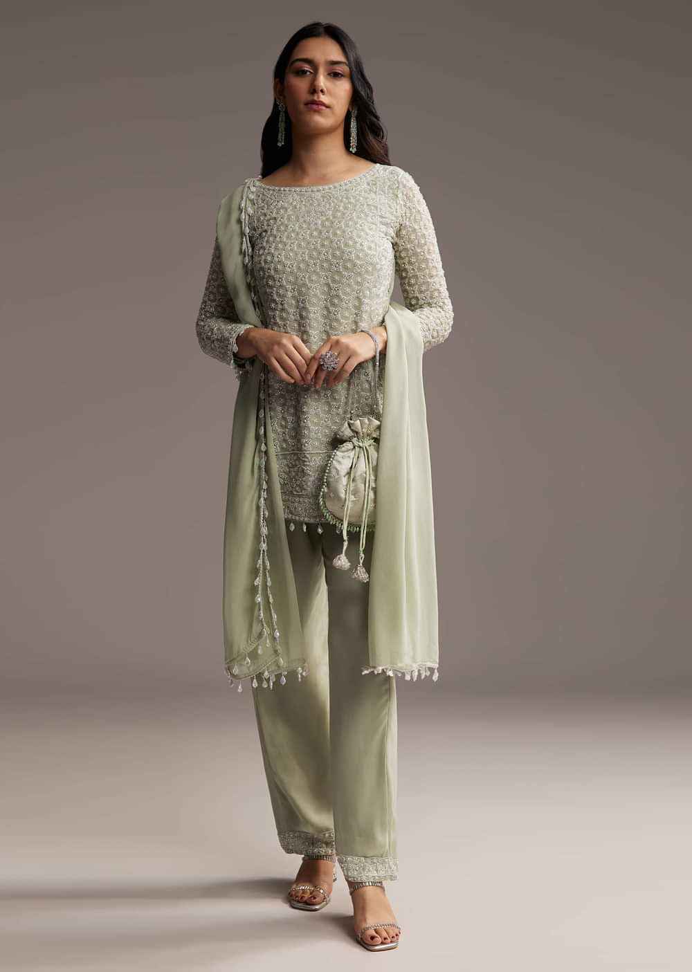 Like fresh mehendi on your skin, this green georgette kurta set brings a festive glow with every sway. The beadwork glimmers like scattered dew, giving the fabric a luminous charm... More Product Details