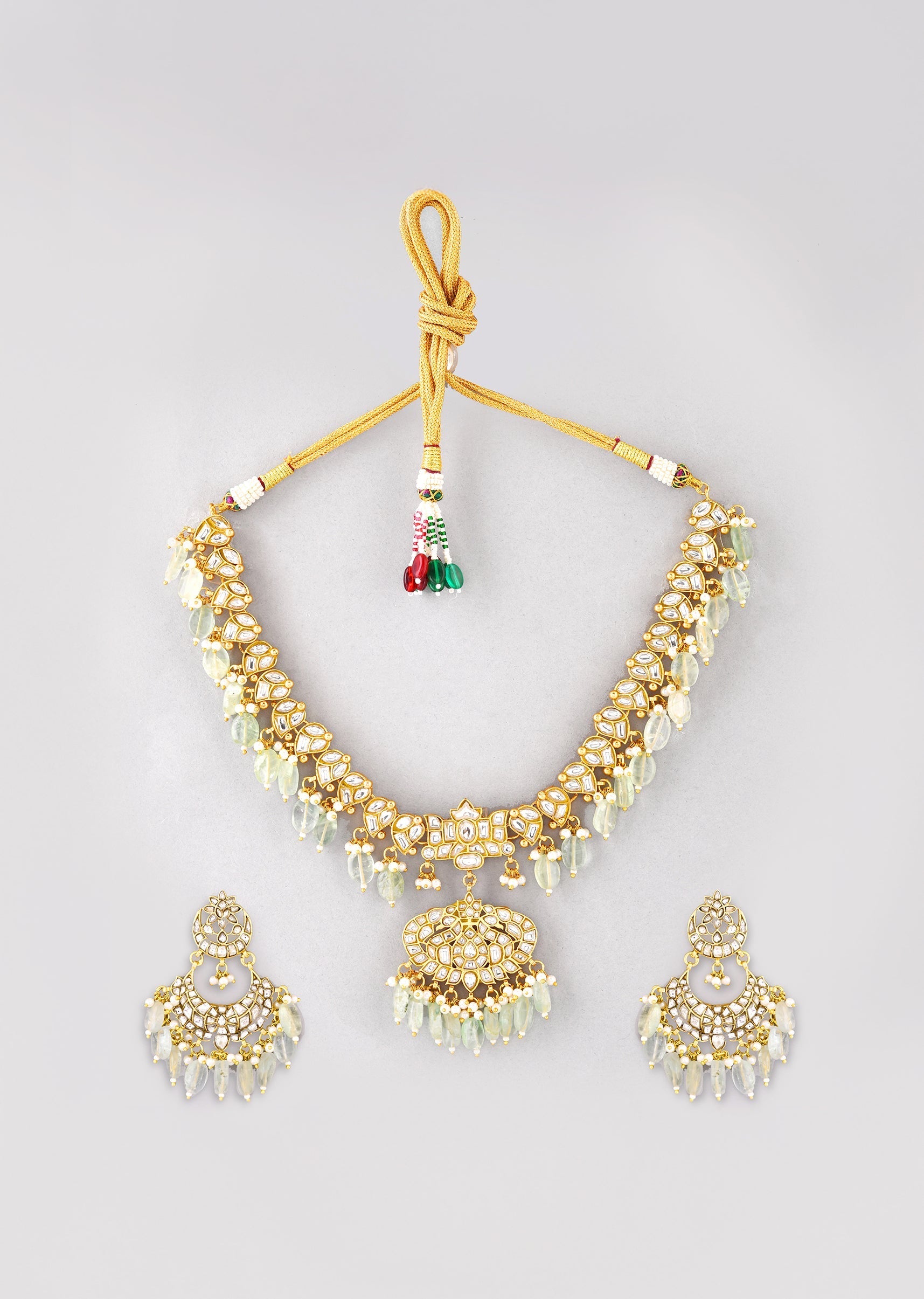Add a soft, elegant touch to your festive look with this mint green kundan necklace and earrings set, beautifully finished with delicate bead drops. Perfect for celebrations or weddings, it brings a fresh and refined charm to any traditional outfit.Awarded as the Most Trusted Brand, we're delivering styles you love, just as promised.