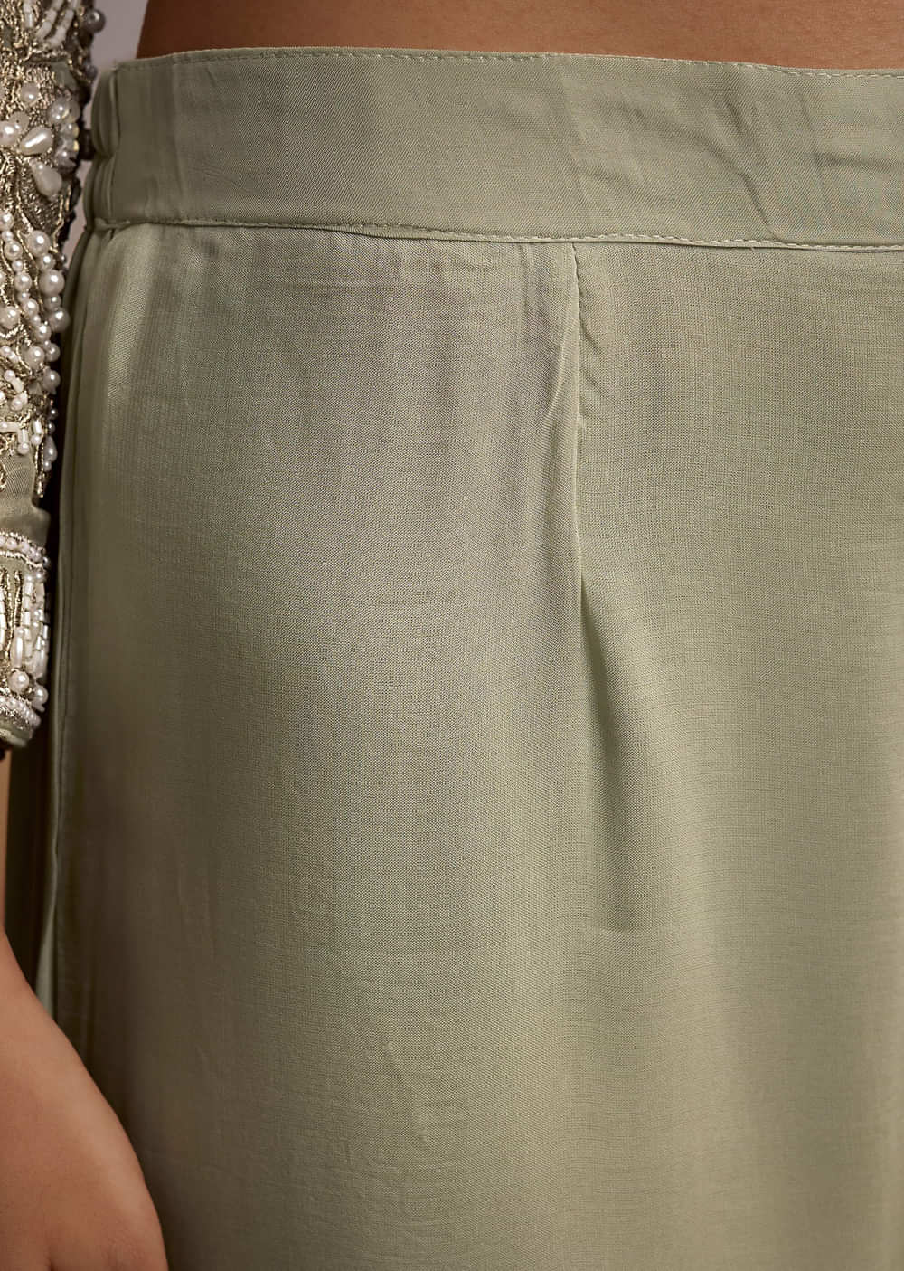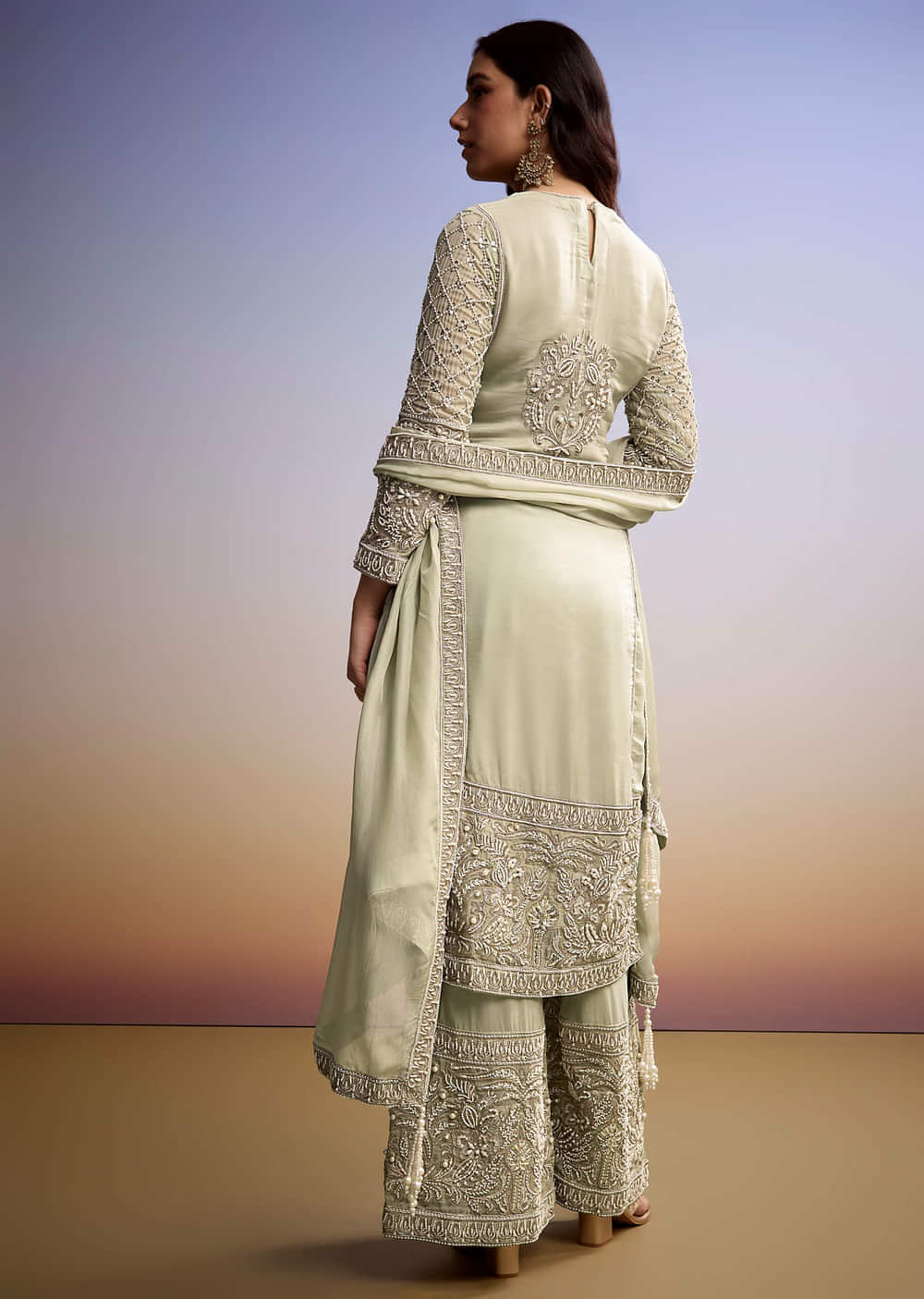 An uplifting choice with a cool-tone charm, this mint green palazzo suit is enhanced by zari accents and moti work that catch the light with every move. The organza fabric... More Product Details
