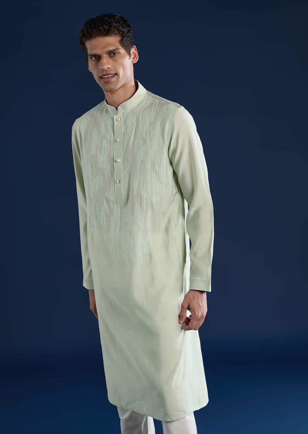 Mint Green Resham Embroidered Mens Kurta and Pant Set