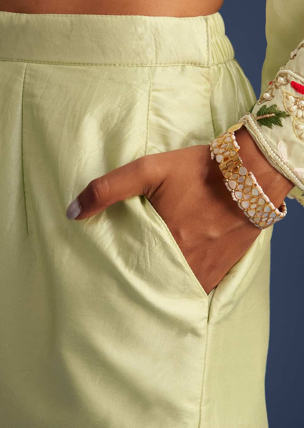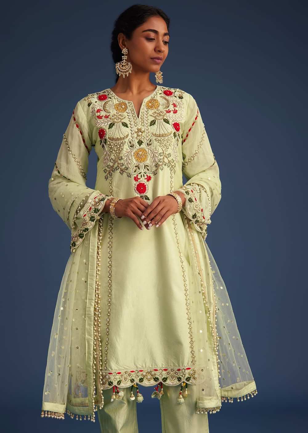 Embrace Timeless Elegance With This Mint Green Silk Kurta Set Adorned With Intricate Moti Thread Work Beads Zari Zardosi And Sequins Embroidery. The Delicate Detailing Enhances The Rich Fabric Creating... More Product Details