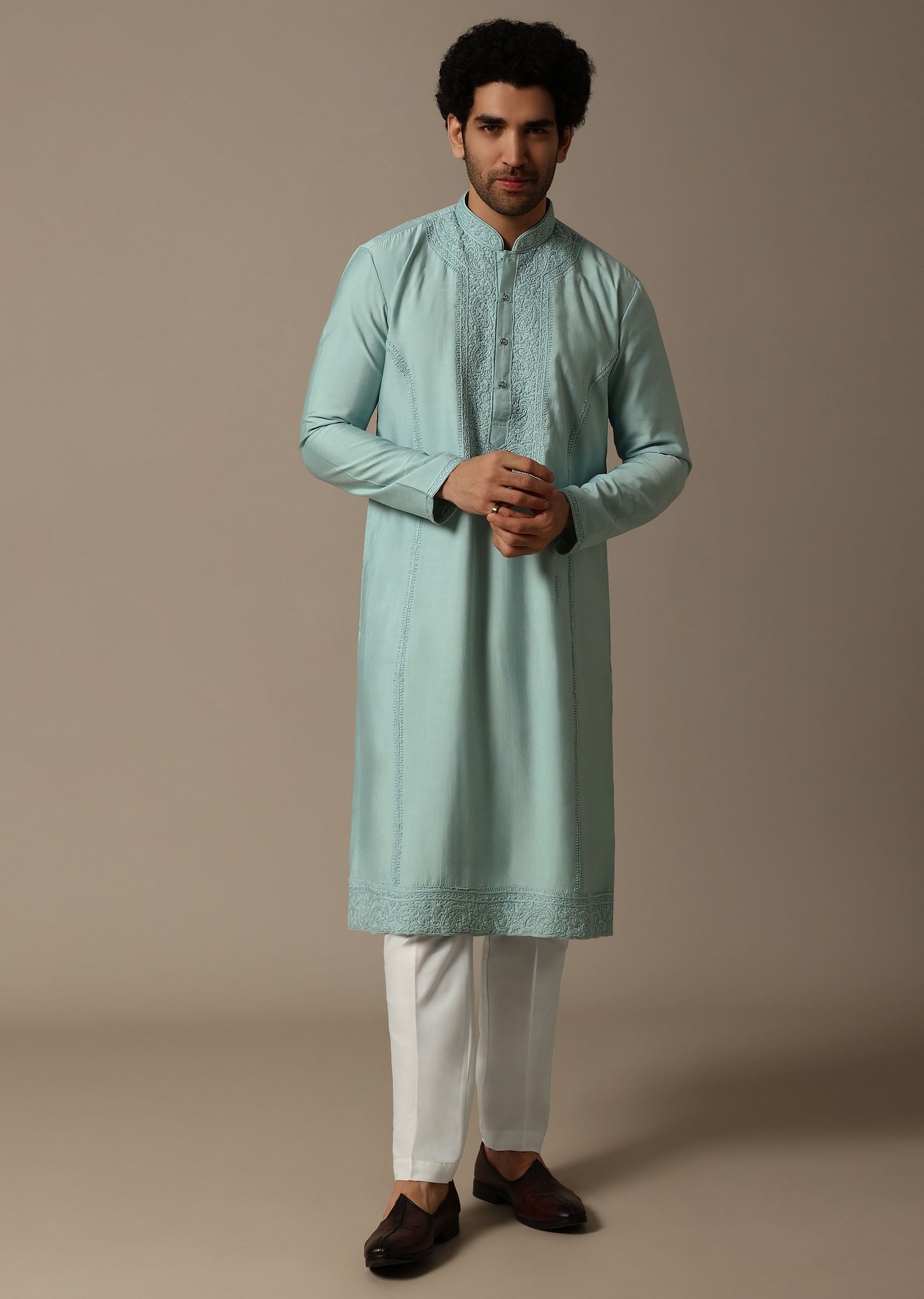 Indulge in sophistication with our stunning mint green kurta set meticulously designed for festive occasions Crafted from luxurious silk and enhanced with intricate threadwork this set exudes elegance and charm.... More Product Details