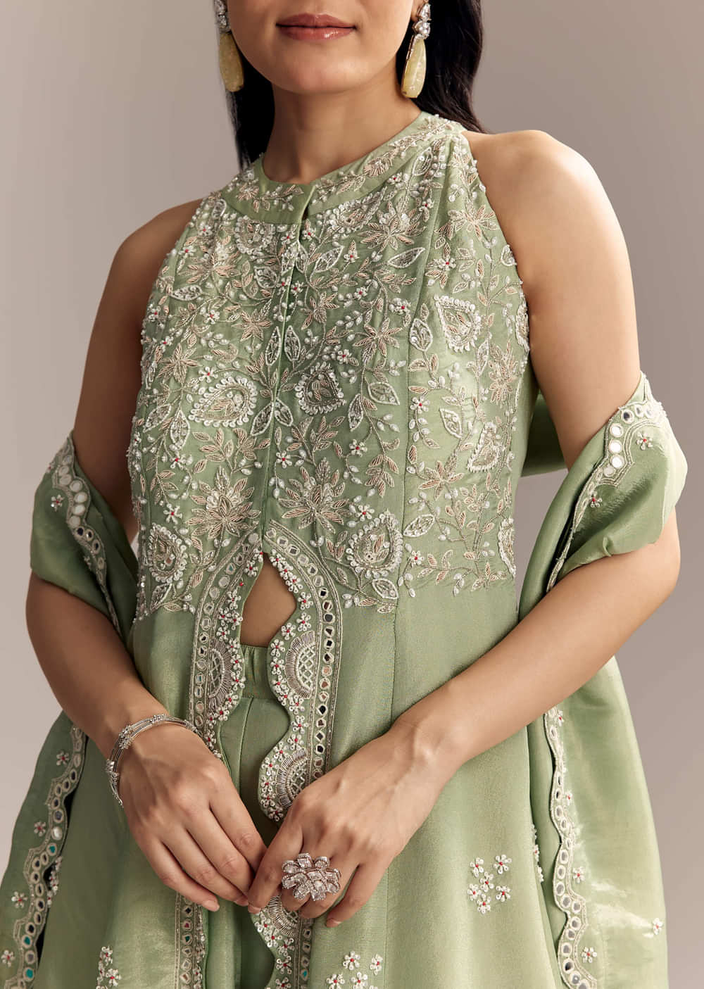 Light and luminous, this mint green tissue anarkali suit moves with a modern front slit. Cutdana and bead work add refined shimmer across the bodice and borders. Great for a... More Product Details